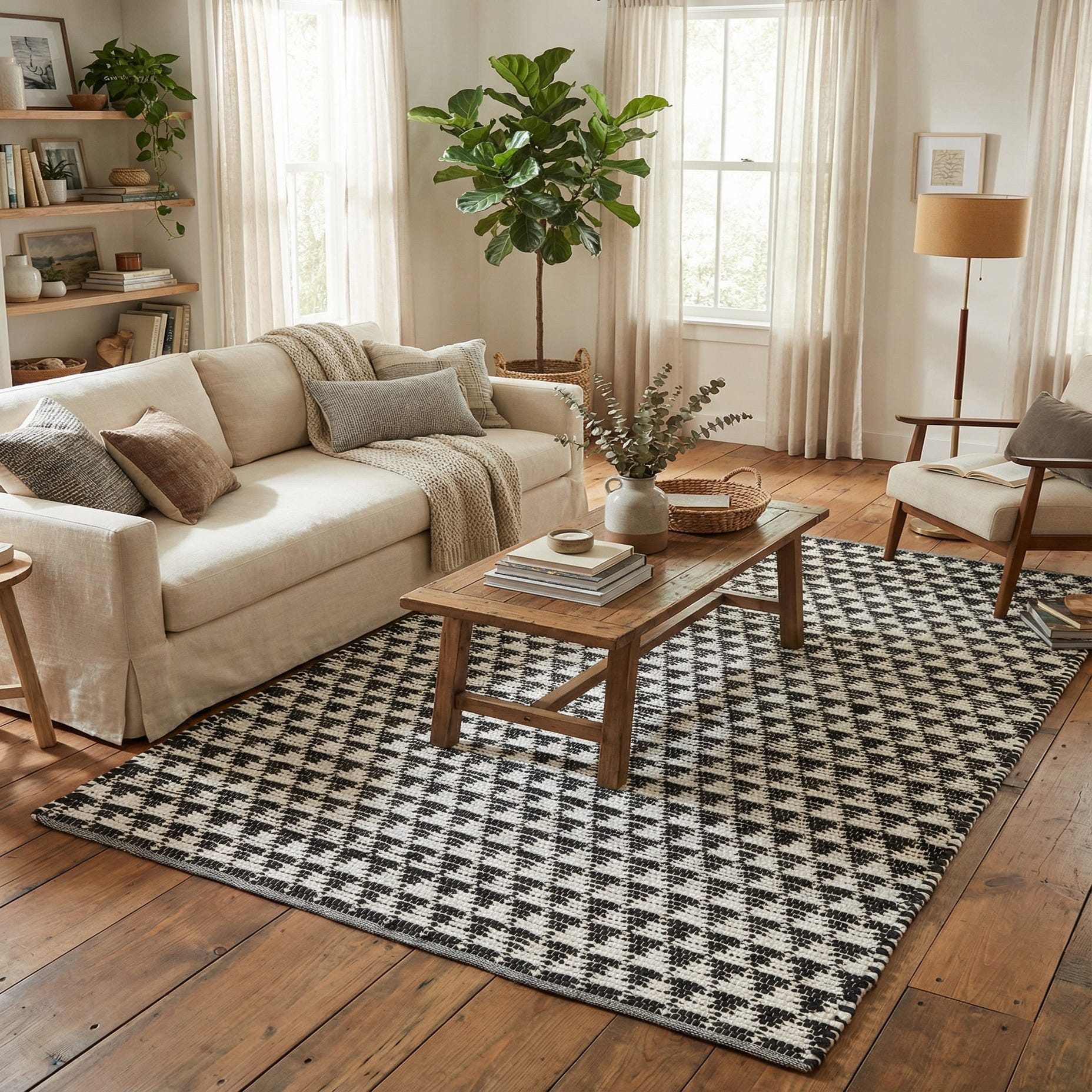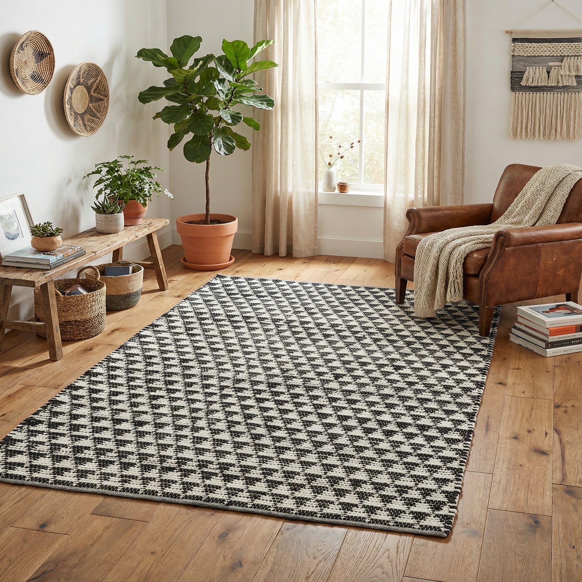 This piece works well in a variety of interiors: place it in an entry or hallway for bold contrast, tuck it beneath a small seating group in a living room to anchor the space, or layer it in a home office to add pattern without bulk. It pairs particularly well with warm wood tones, matte black metal accents, and neutral linens, and complements Scandinavian, modern farmhouse, or contemporary minimalist schemes.