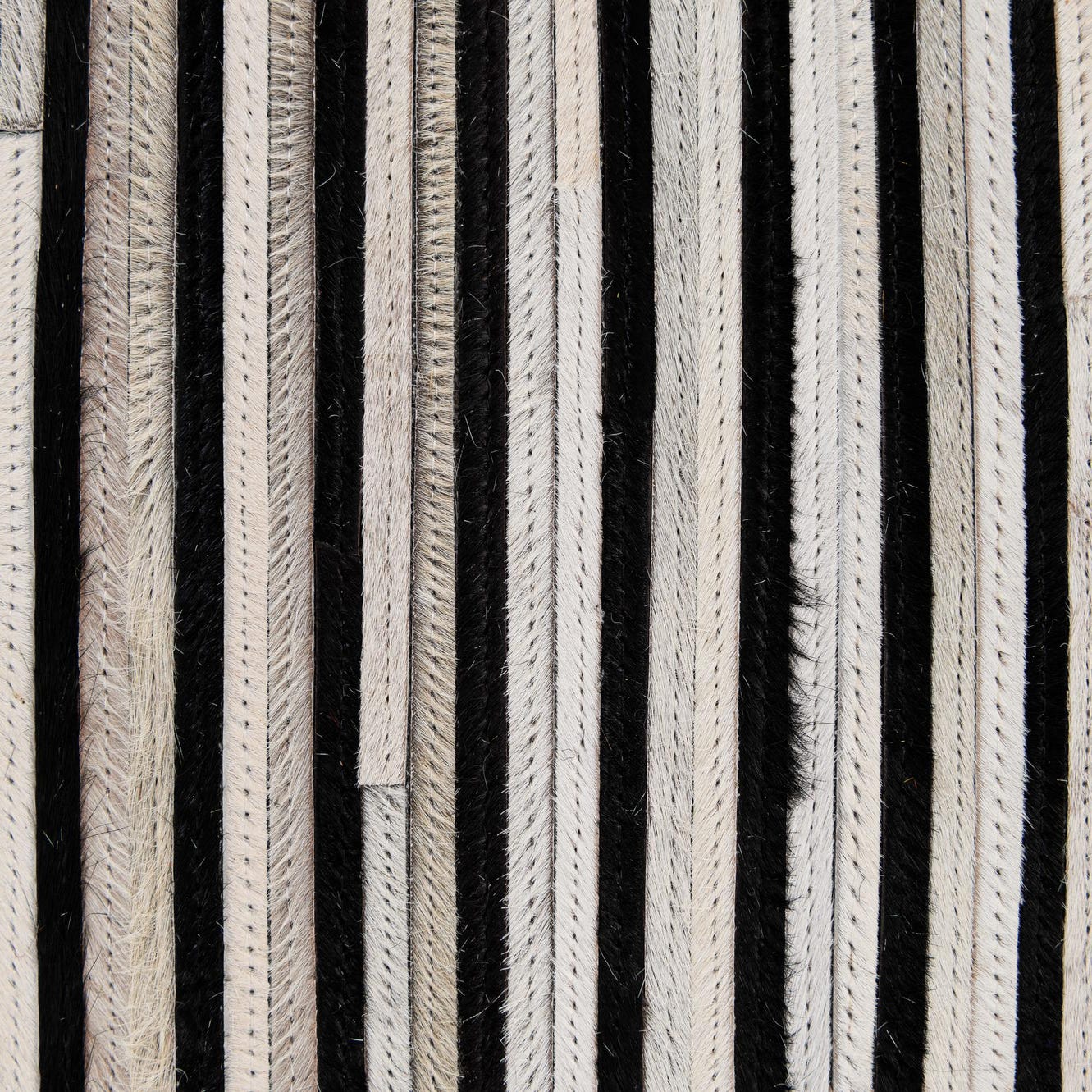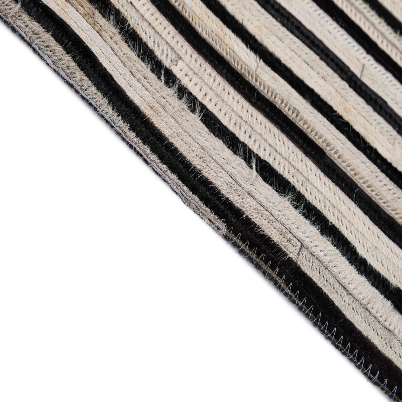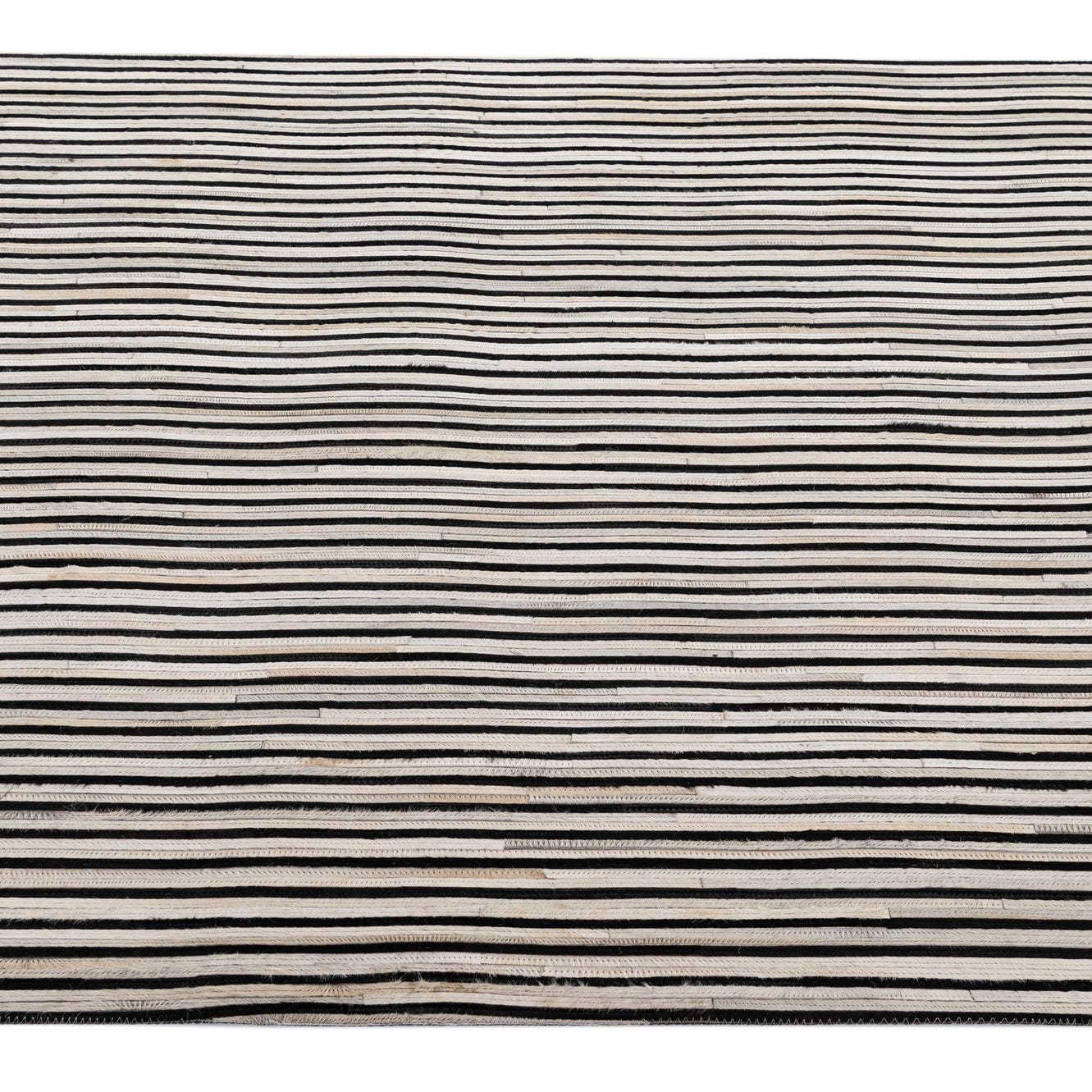 A 5x8 rectangular Cowhide - Patchwork rug featuring a modern stripe pattern in black and ivory, suitable for a living room or bedroom.