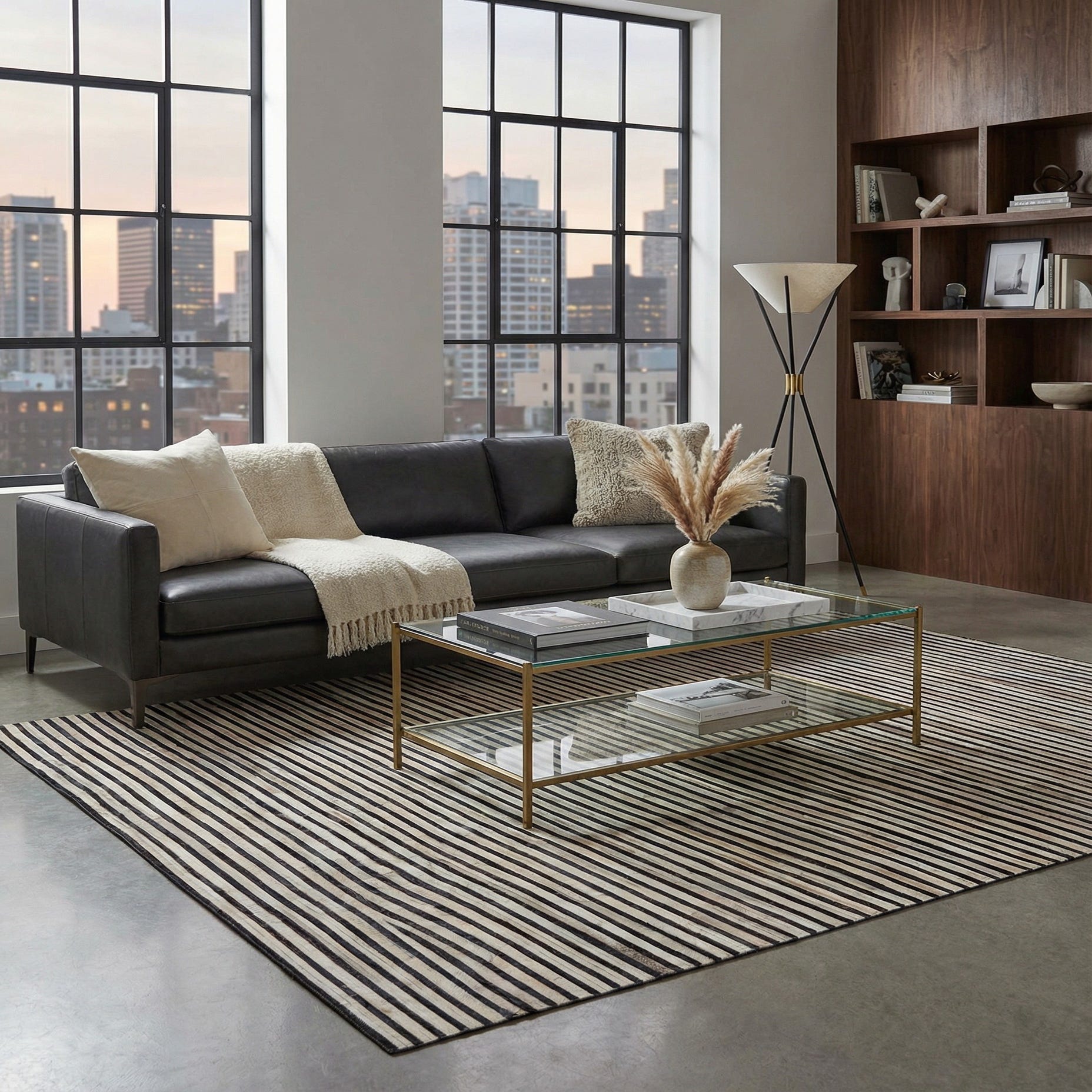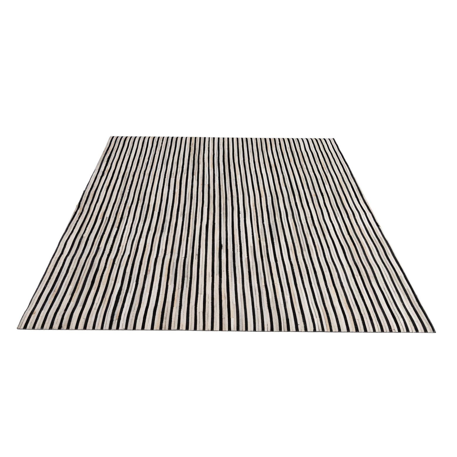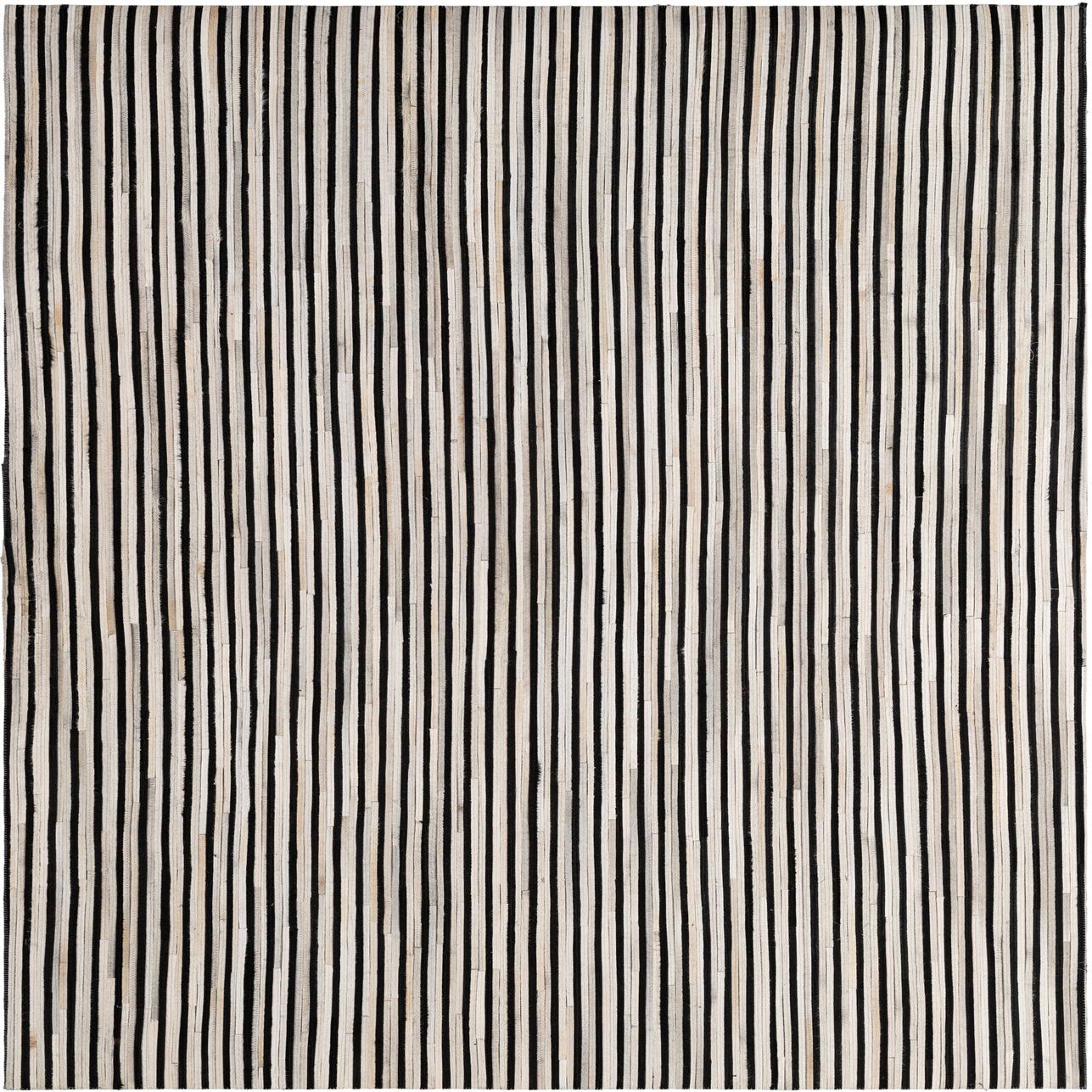 A 5x8 rectangular Cowhide - Patchwork rug featuring a modern stripe pattern in black and ivory, suitable for a living room or bedroom.