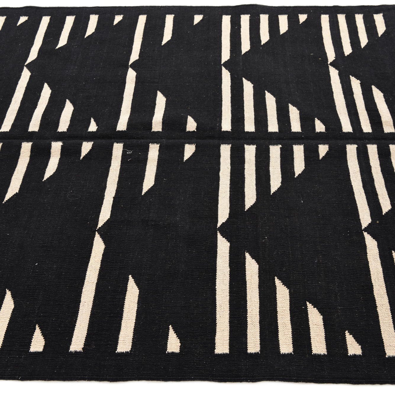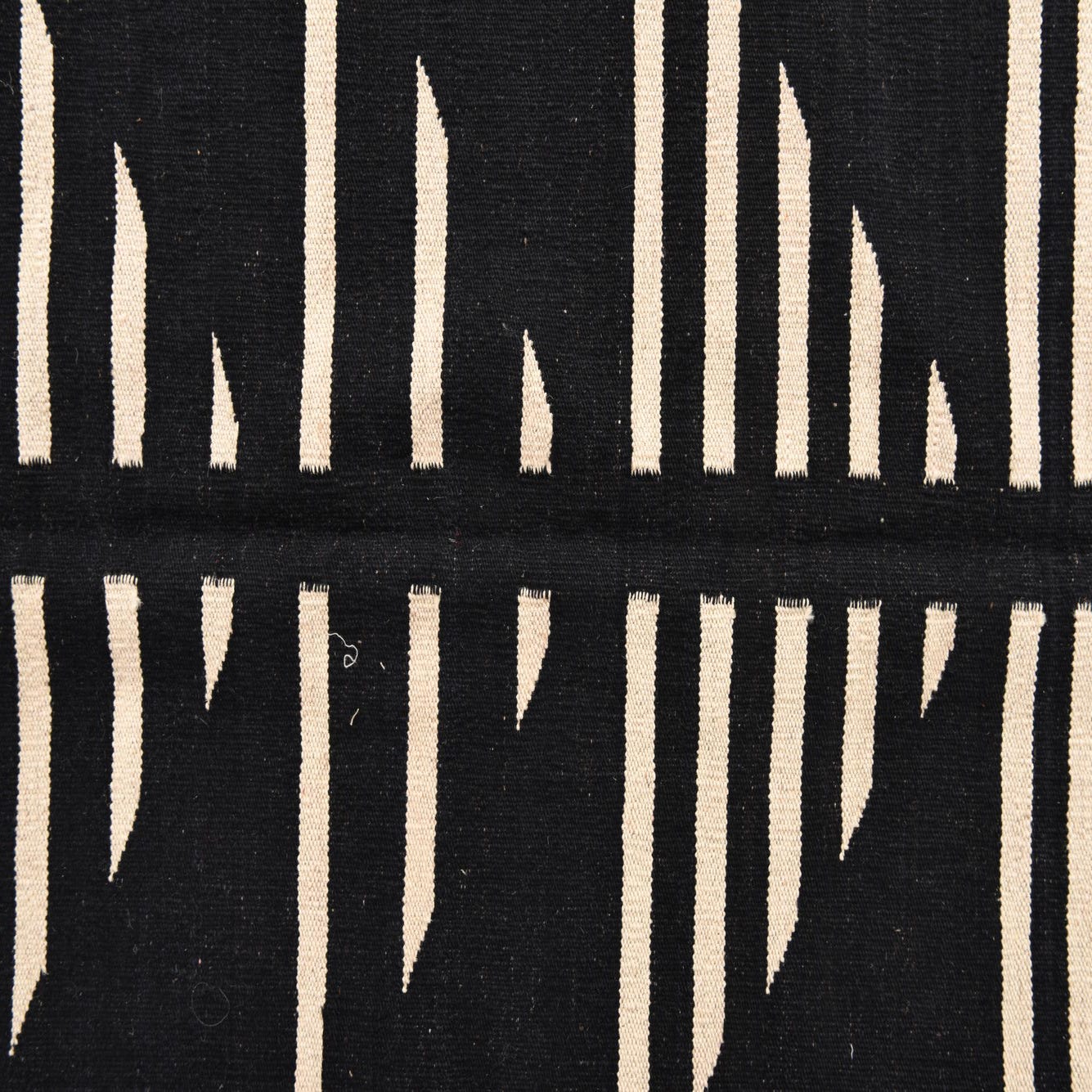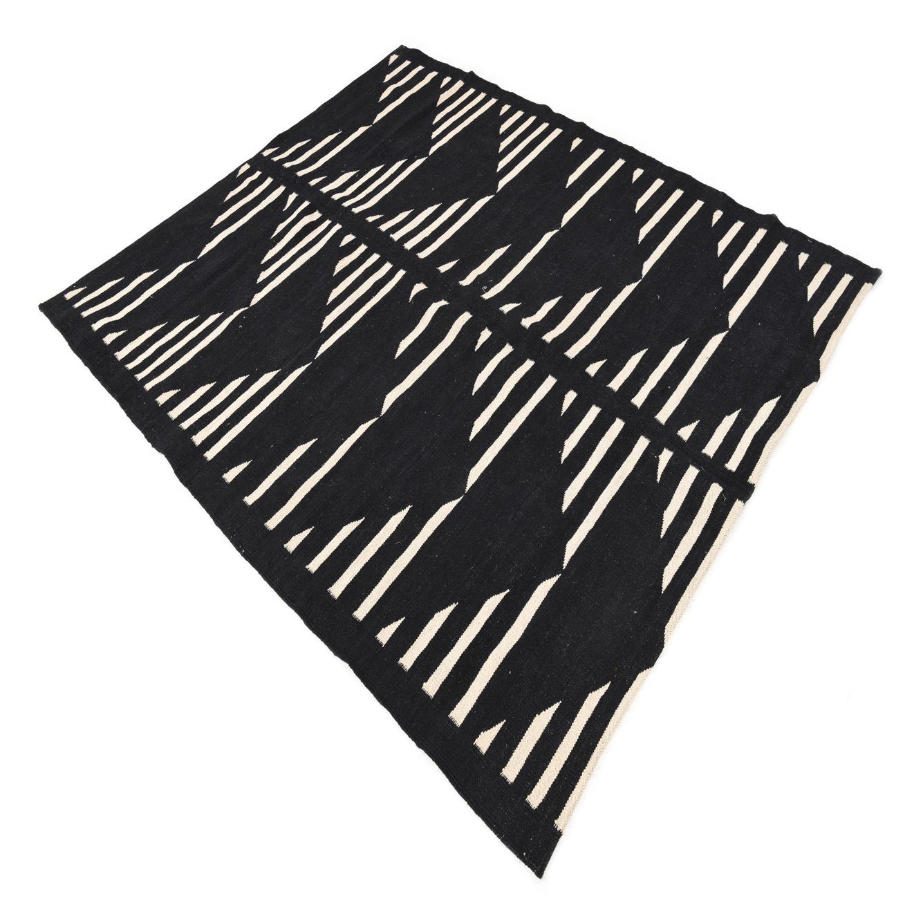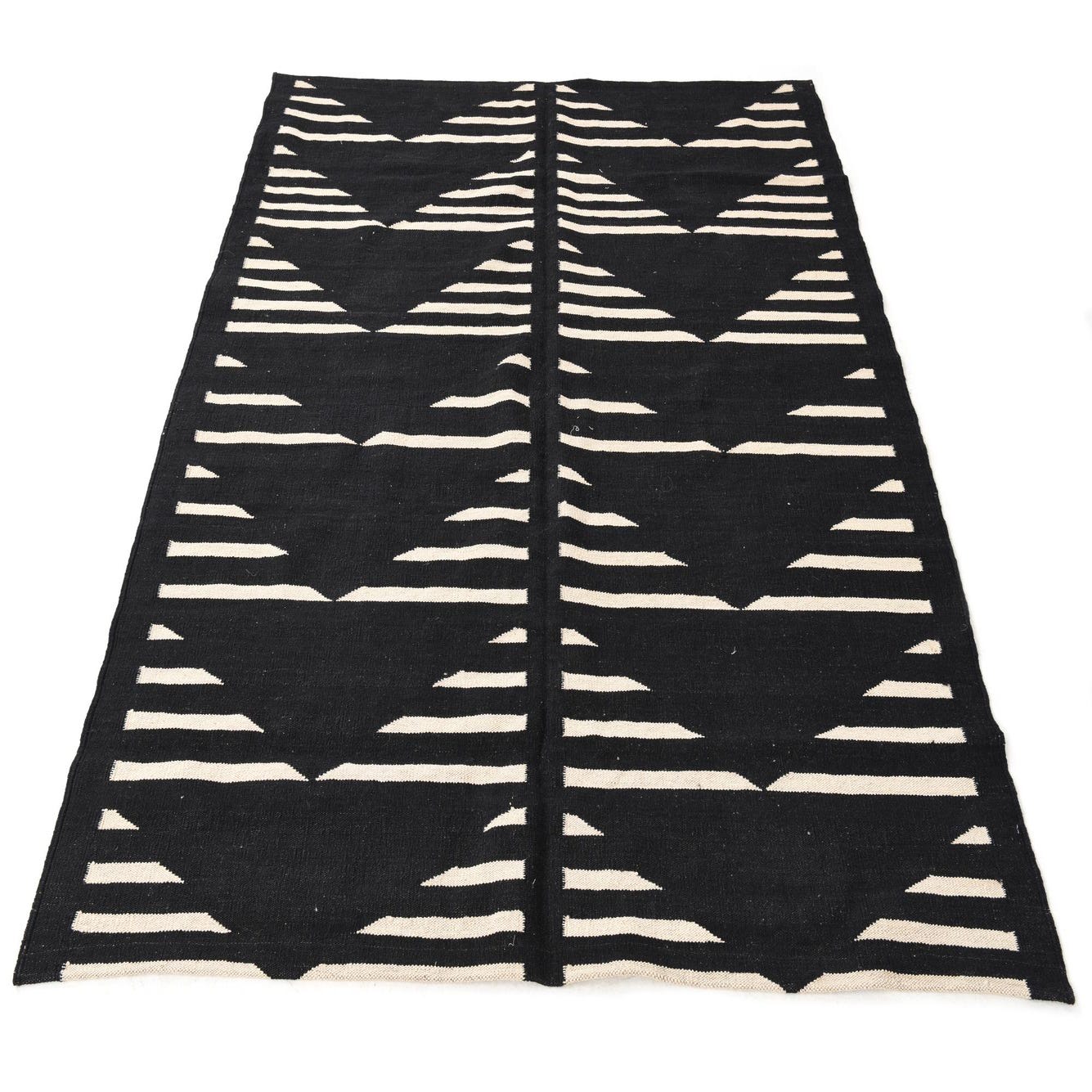 A 5x8 rectangular black and ivory flatweave rug with a modern tribal stripe pattern, featuring rows of black triangles and horizontal ivory lines.