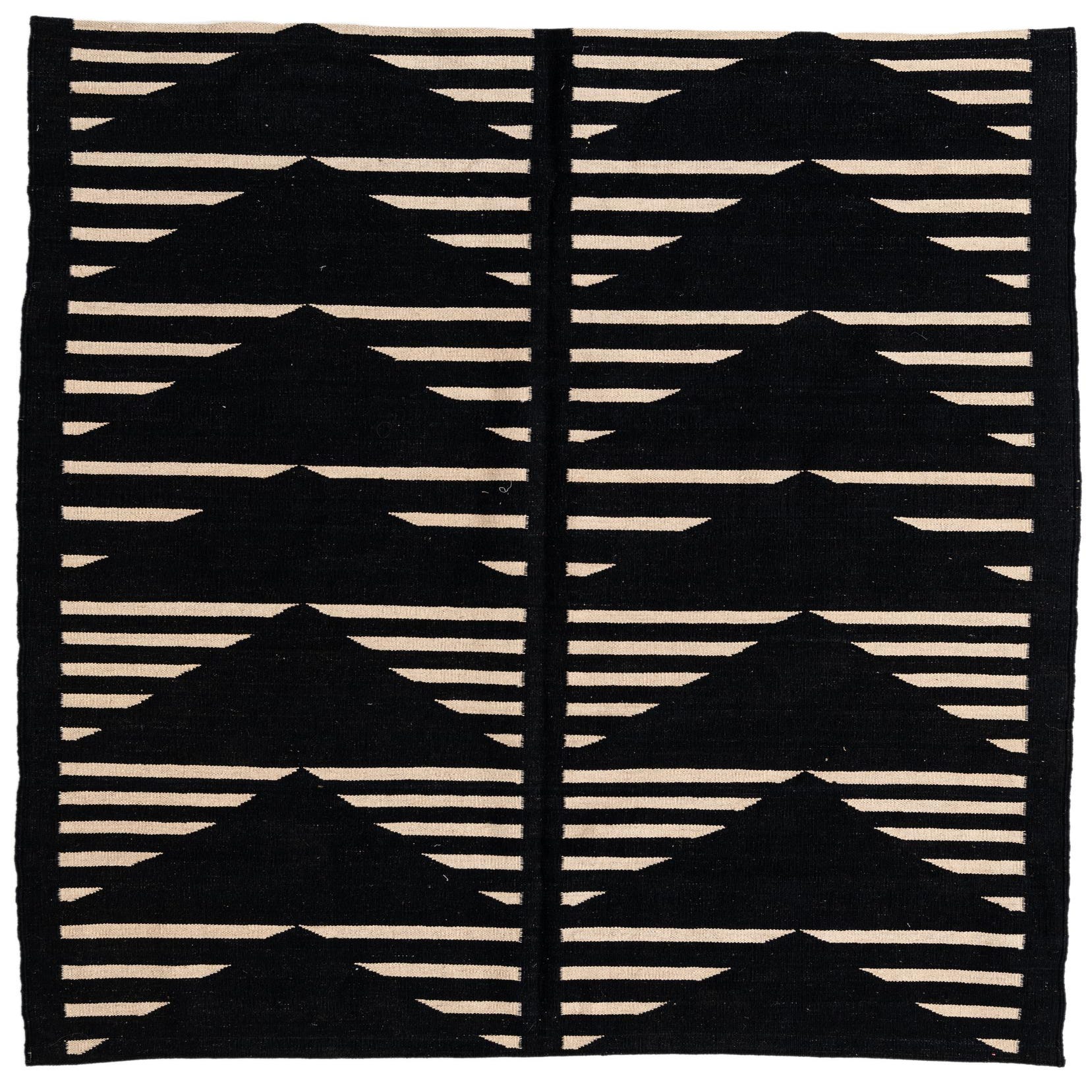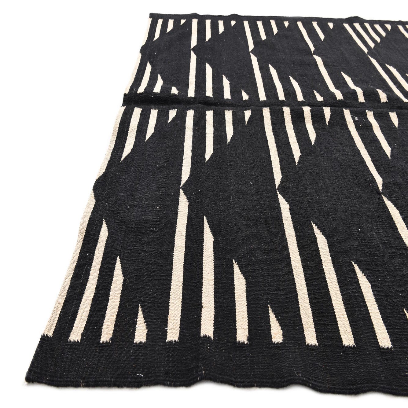 The Kilim Modern collection presents a handwoven rug that demonstrates the art of simplicity and modern design in a 5x8 size format. This piece features a striking black and white color palette, creating a bold contrast that can serve as a focal point or complement contemporary and minimalist aesthetics. The pattern is a geometric array of triangles and linear elements that bring a sense of rhythm and movement to any space.