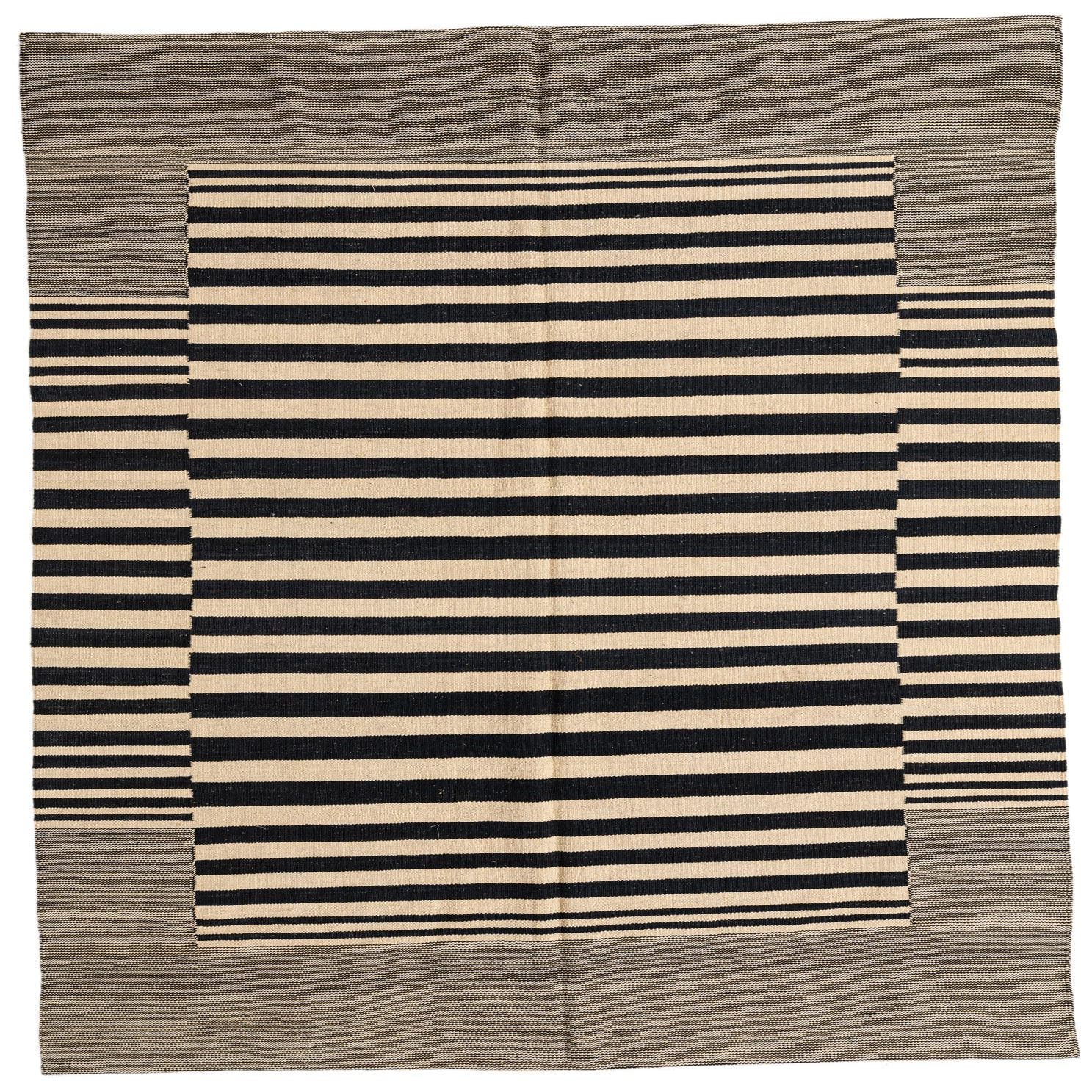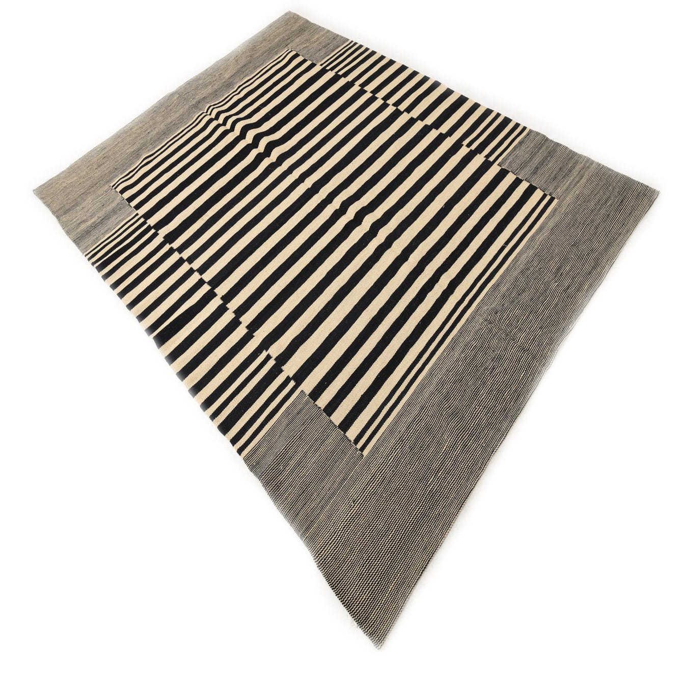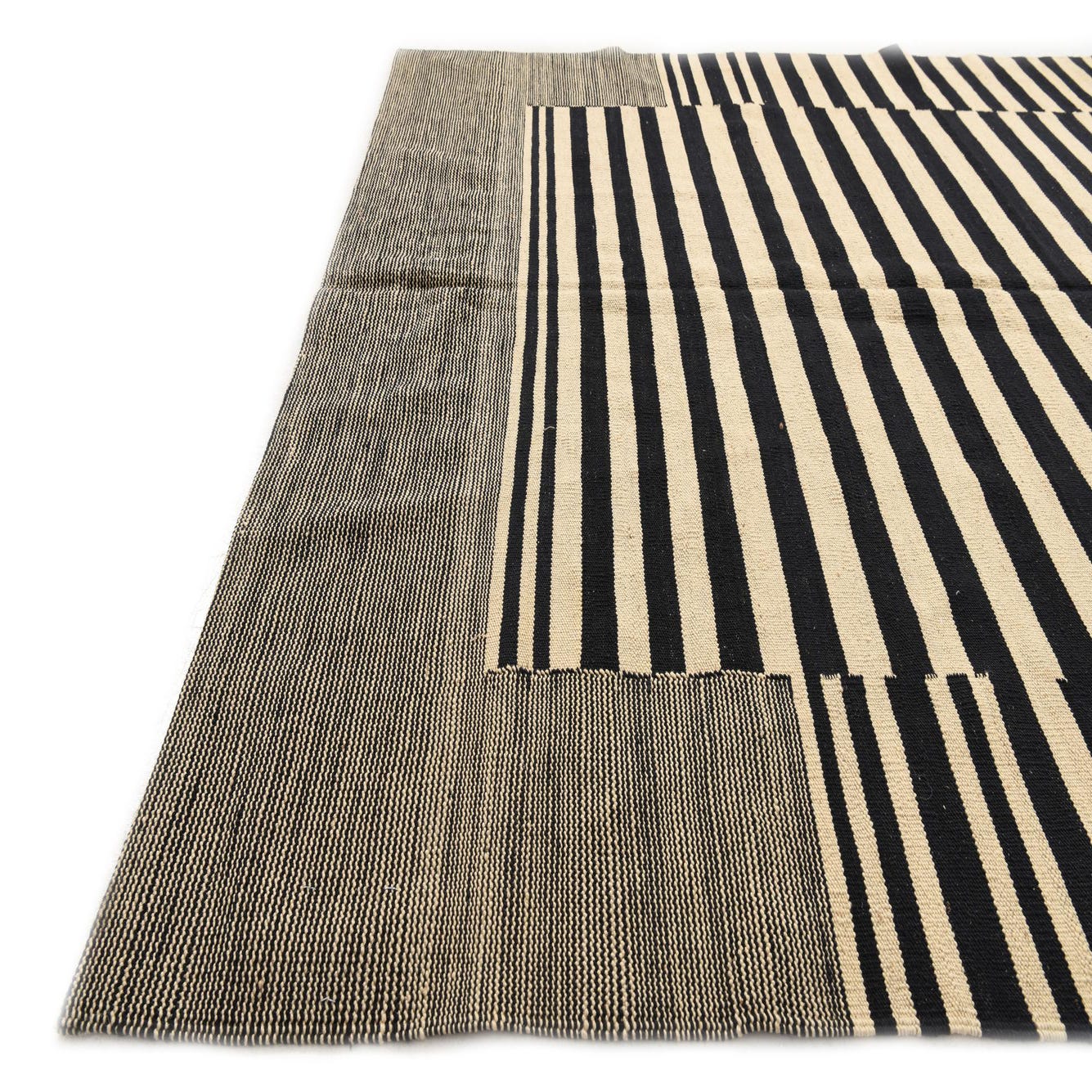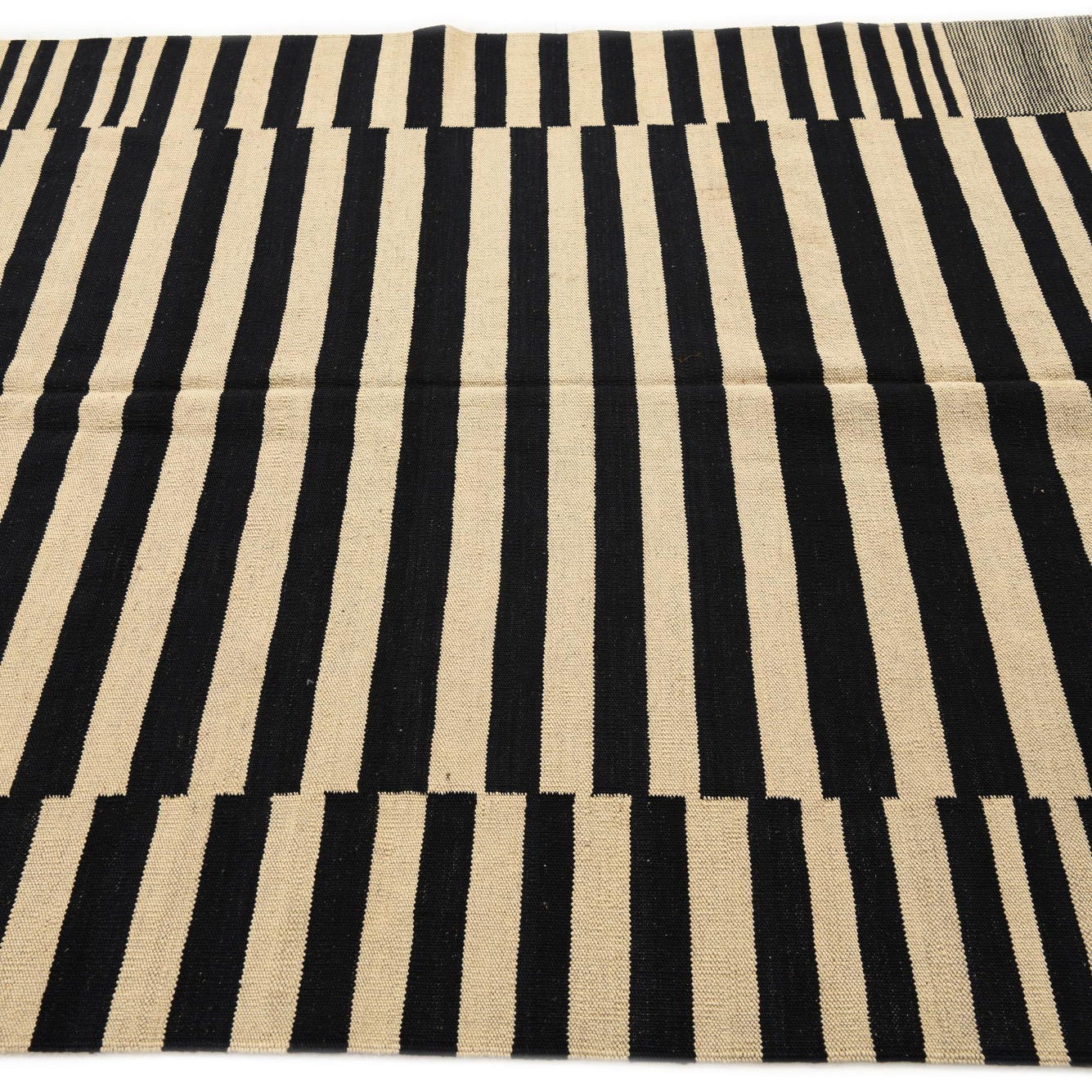 The Kilim Modern collection presents a hand-woven rug that measures 5x8 feet, crafted from 100% wool for a tactile and durable accent piece. This rug features a stark, linear pattern composed of black and white stripes that create a striking visual contrast. The flatweave texture provides a low pile that is sturdy underfoot and can handle high-traffic areas with ease.