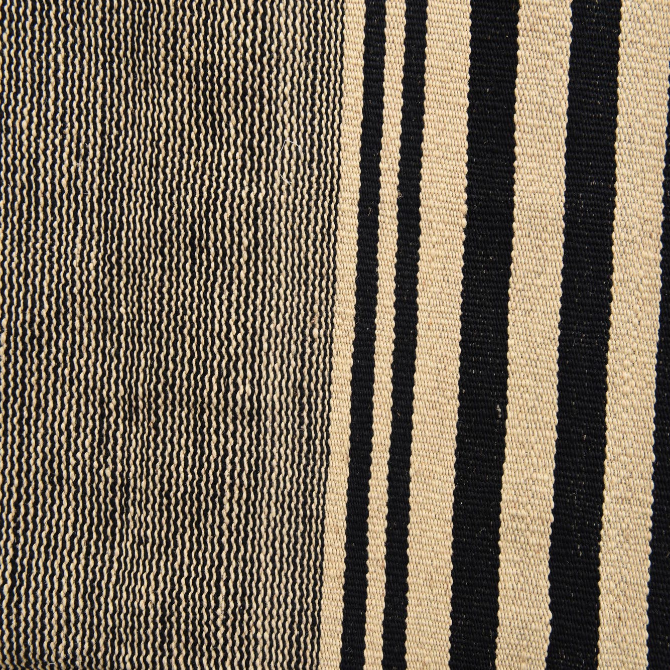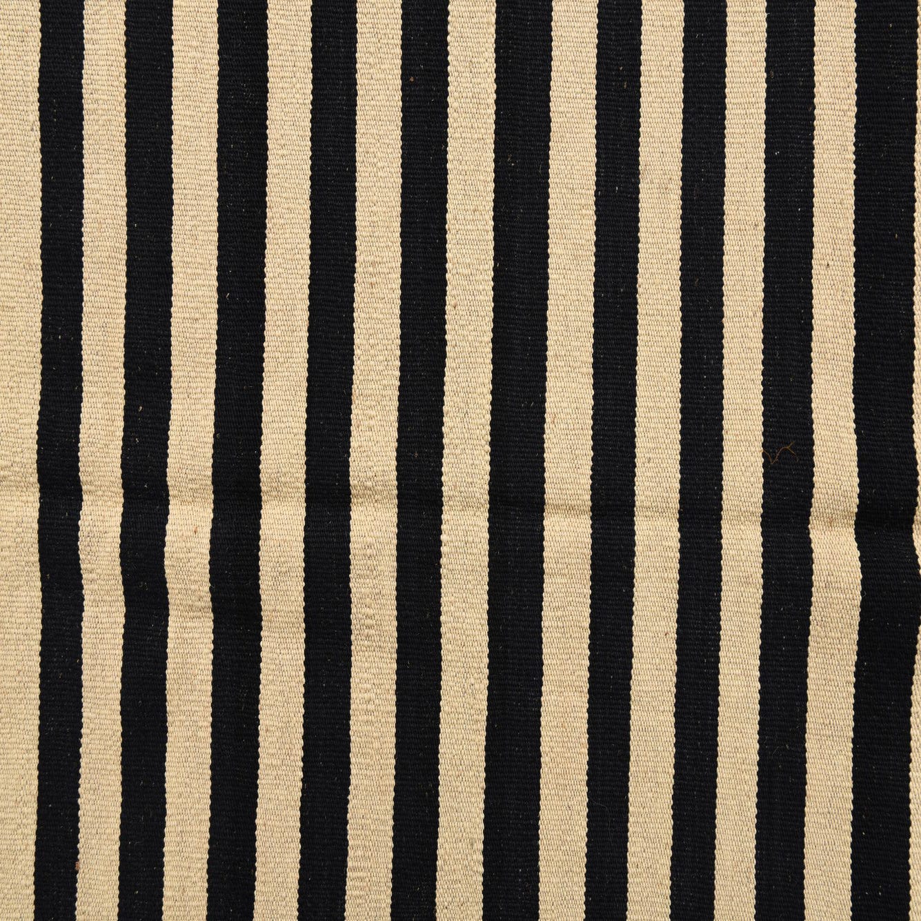 A 5x8 rectangular black and ivory flatweave rug with a bold striped tribal pattern and a solid black border.