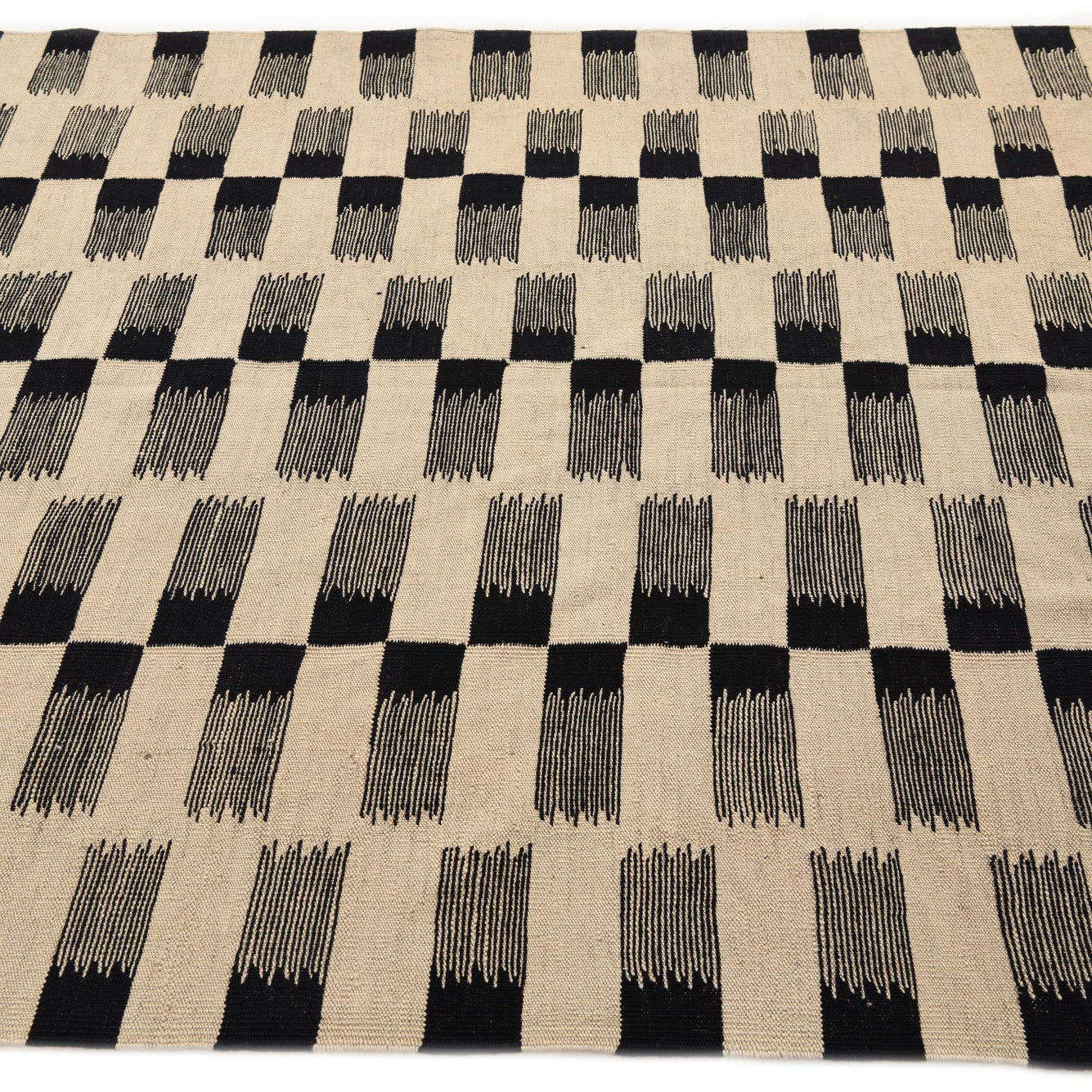 The Kilim Modern 5x8 rug is a hand-woven piece crafted from 100% wool, showcasing a bold and eye-catching geometric pattern. The design features a series of horizontal and vertical black brushstroke-like lines that create a dynamic grid against a contrasting off-white background. The texture of the wool lends a cozy warmth to the rug, while the flatweave construction ensures durability and a slight tactile variation underfoot.