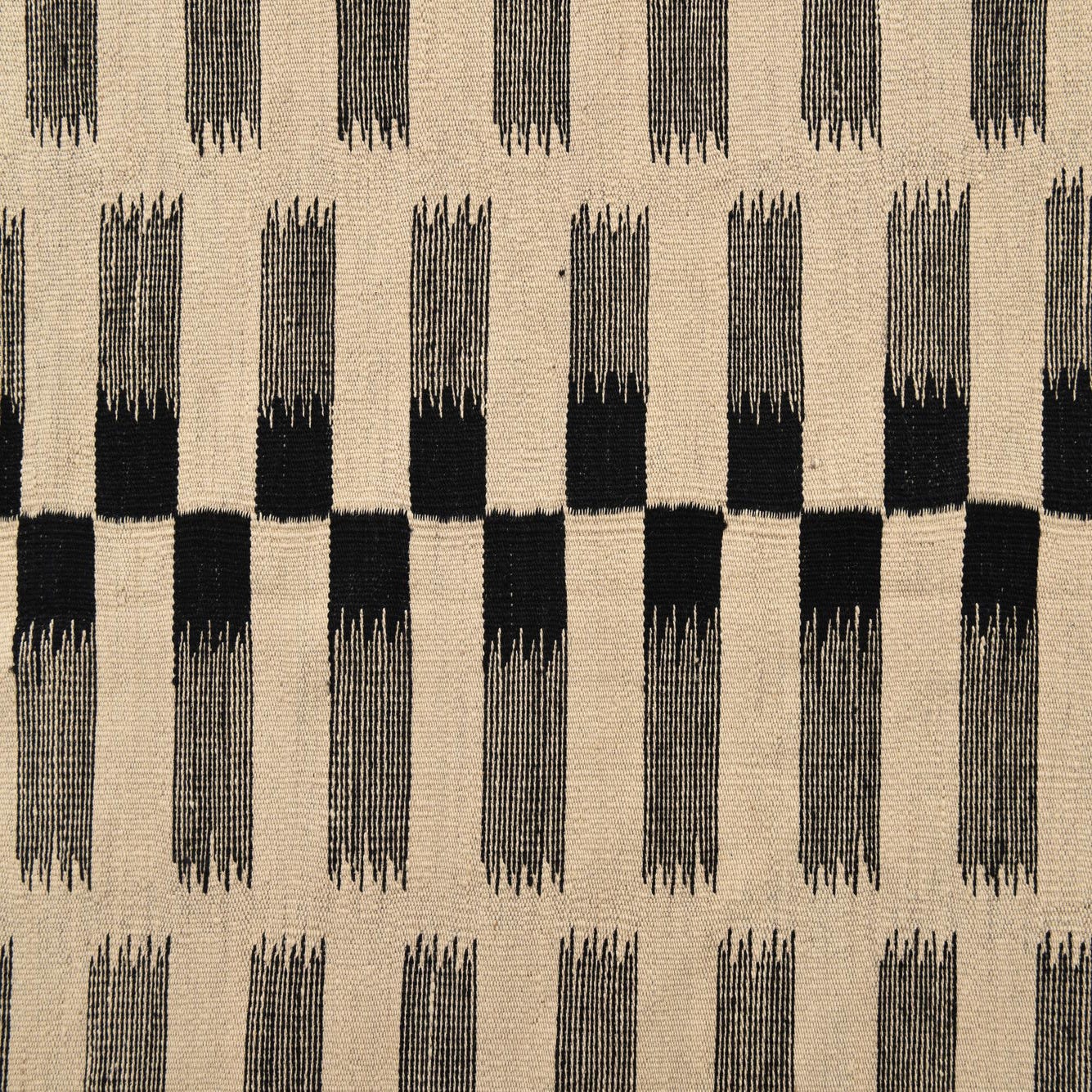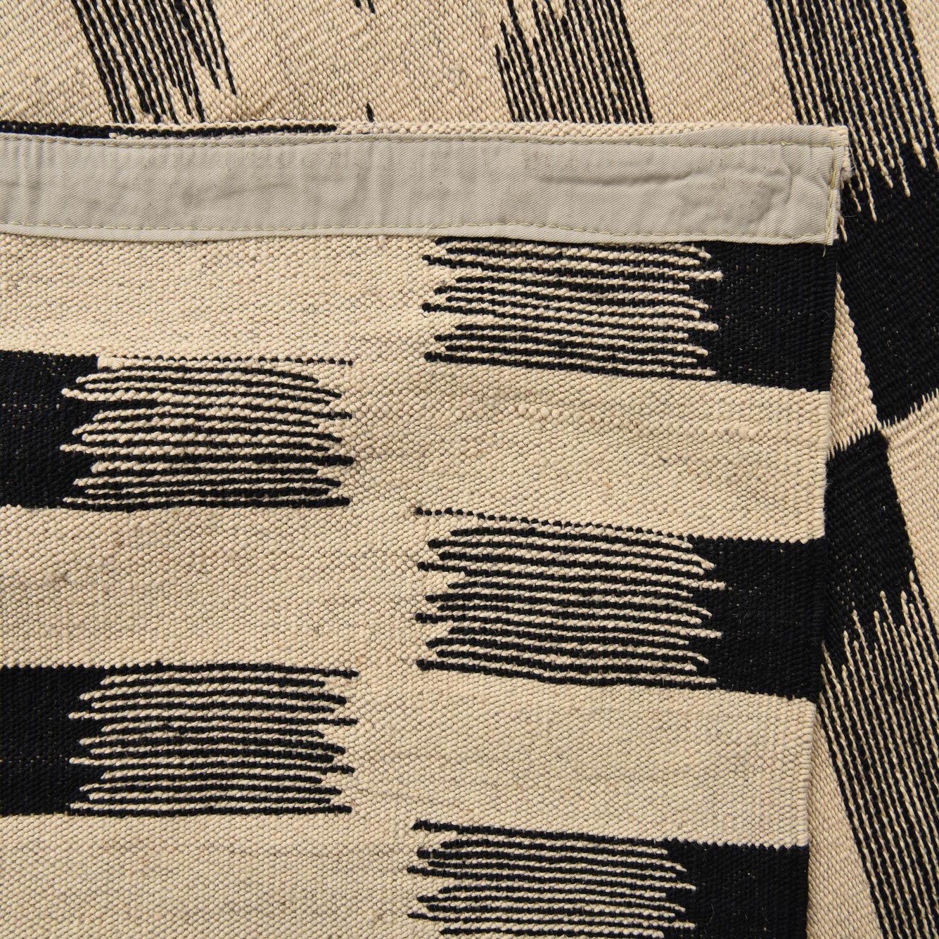 A 5x8 rectangular black and ivory flatweave wool rug with a modern tribal stripe pattern.