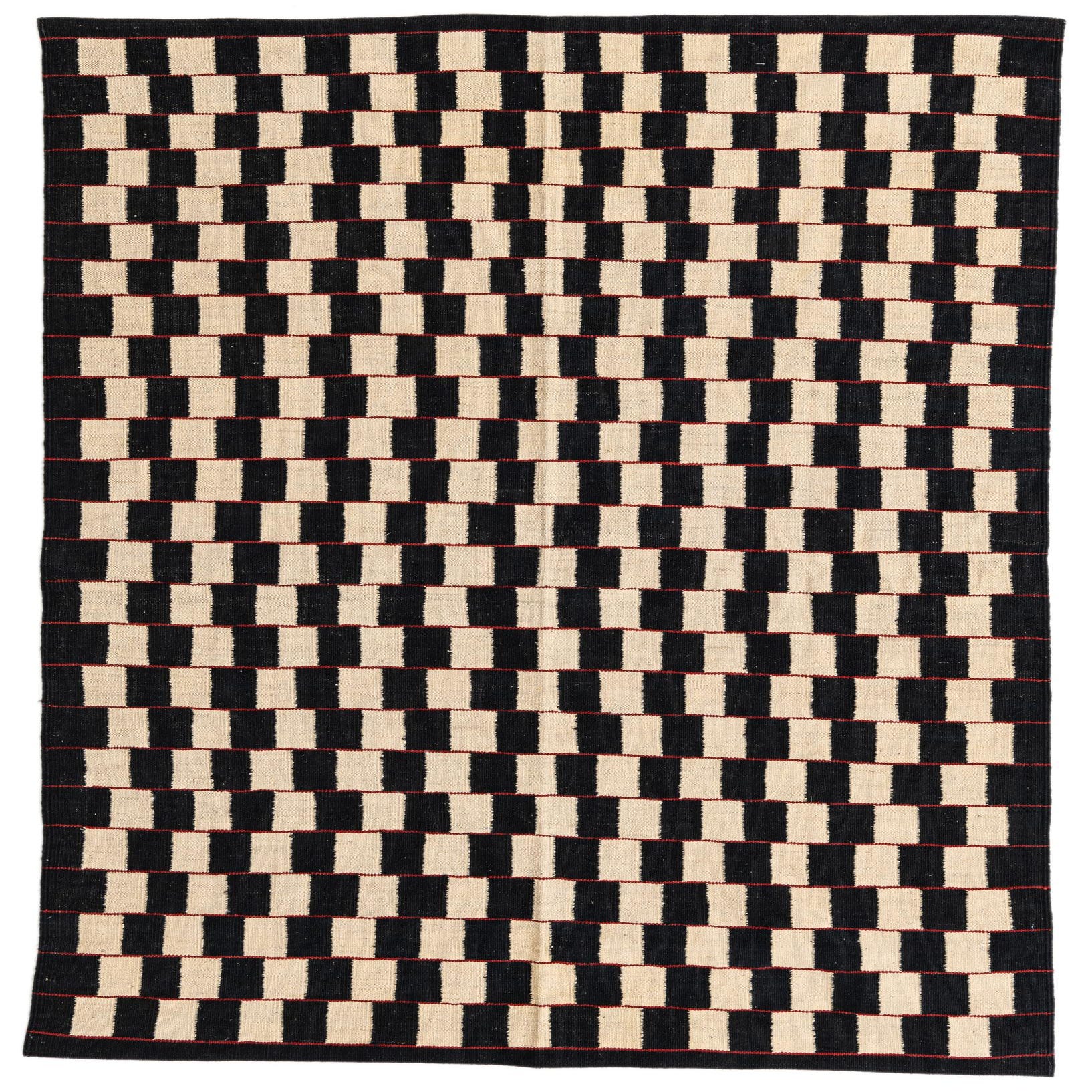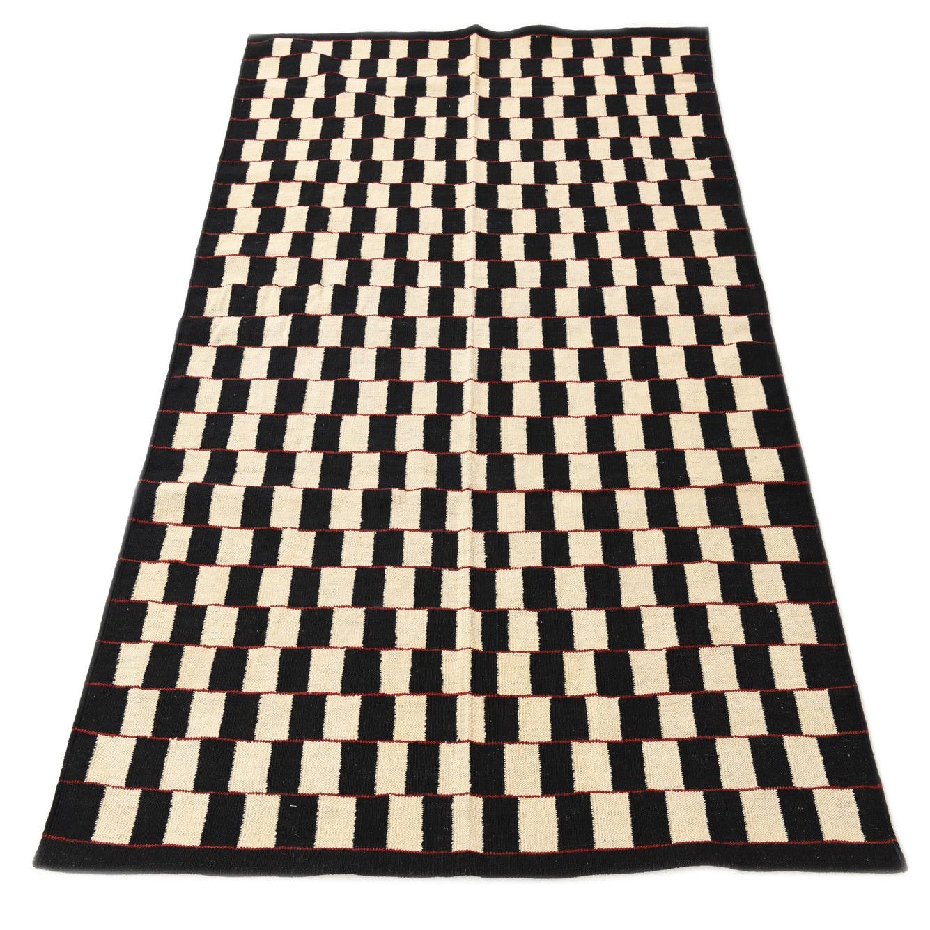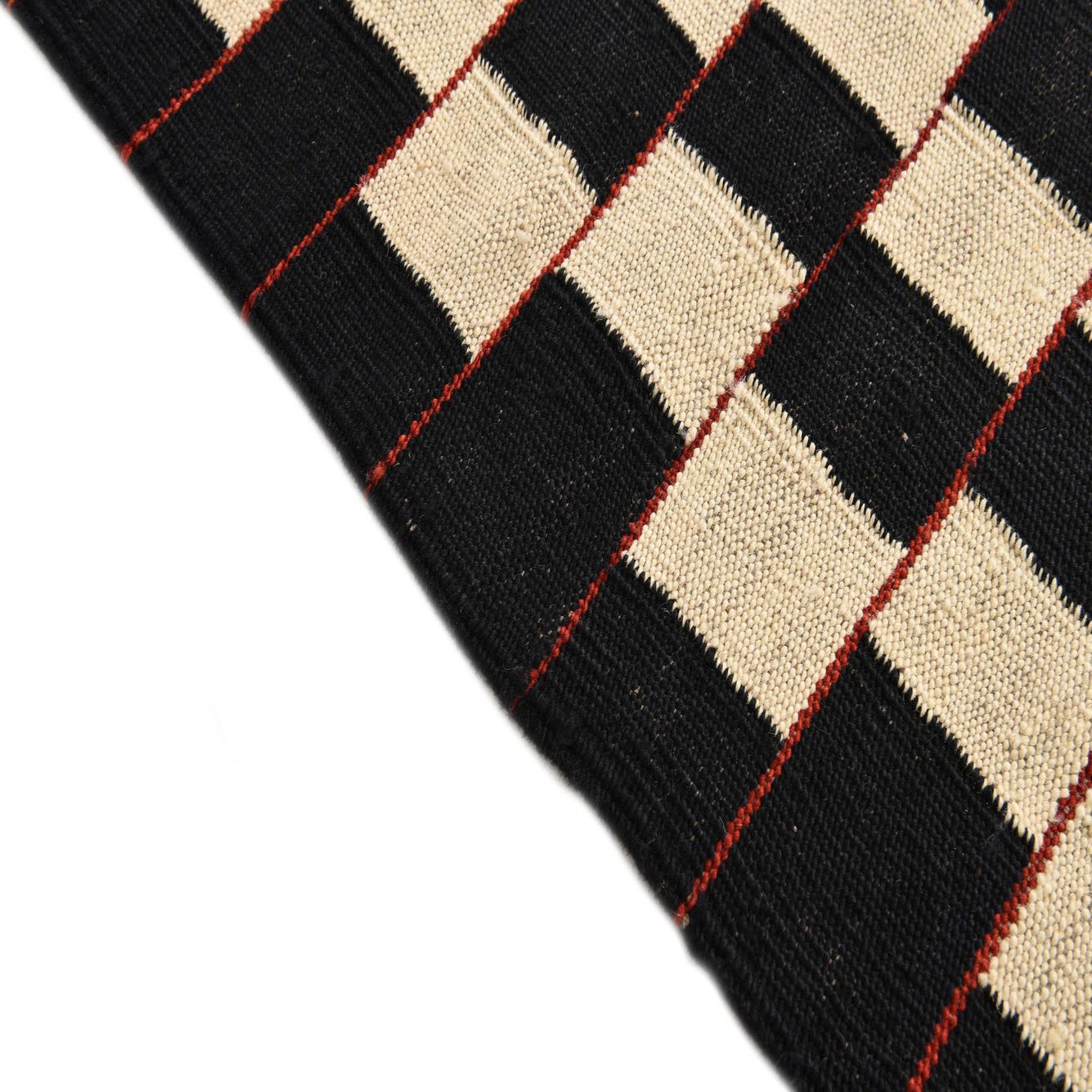 A 5x8 rectangular black and ivory flatweave wool rug with a modern tribal checkerboard pattern and subtle red accents.