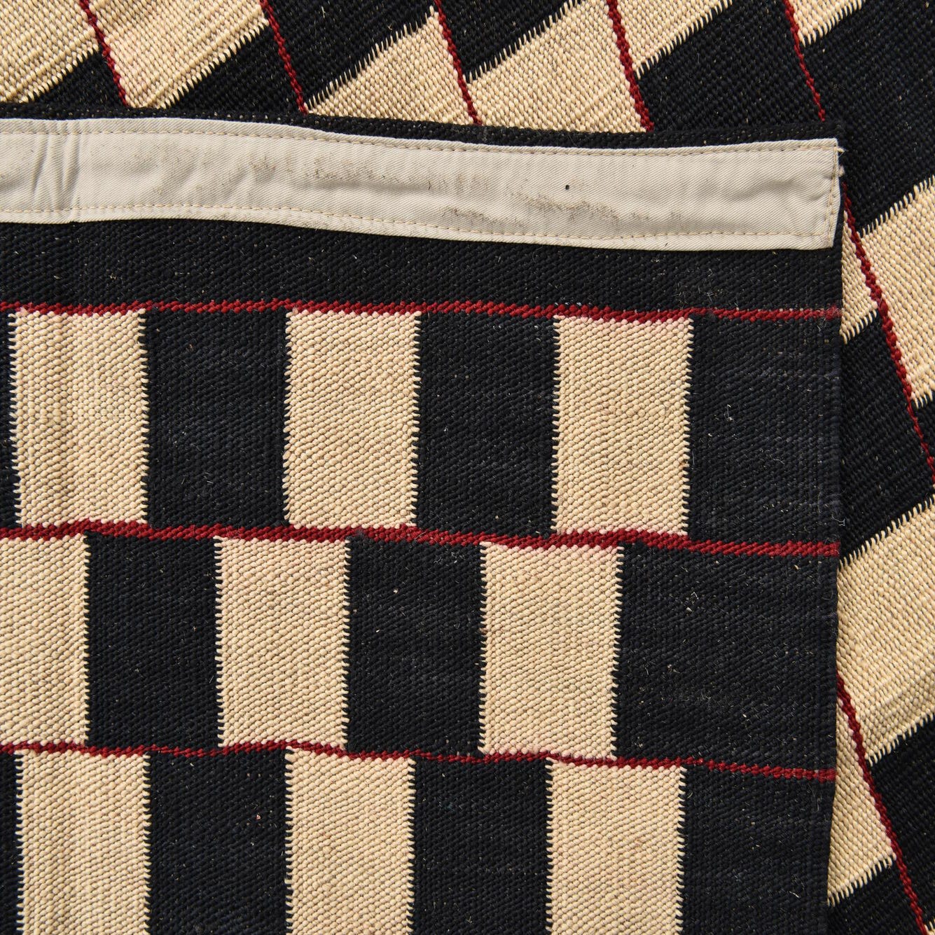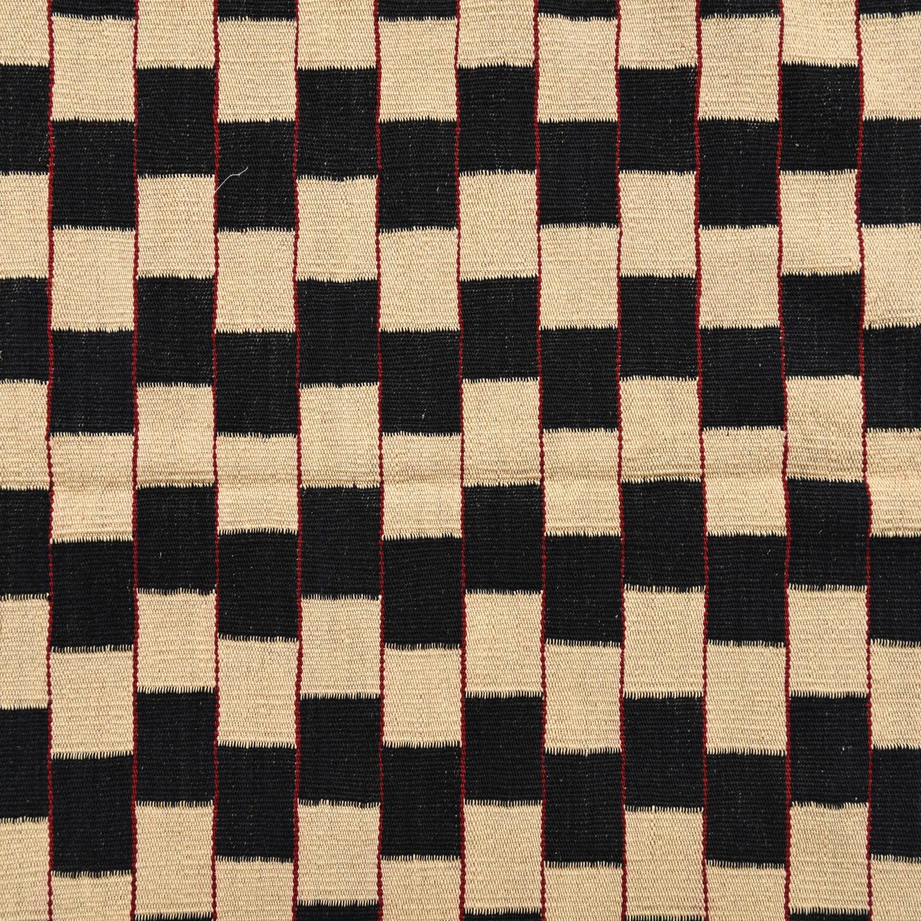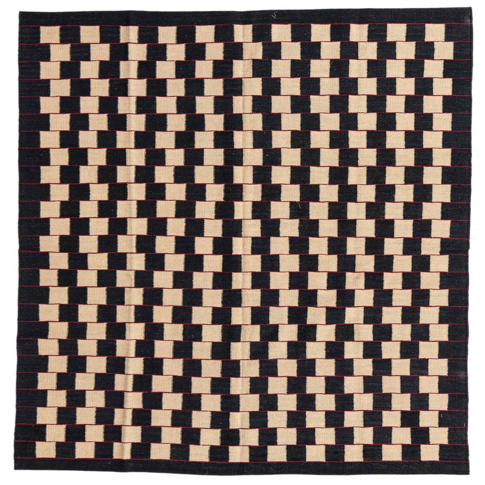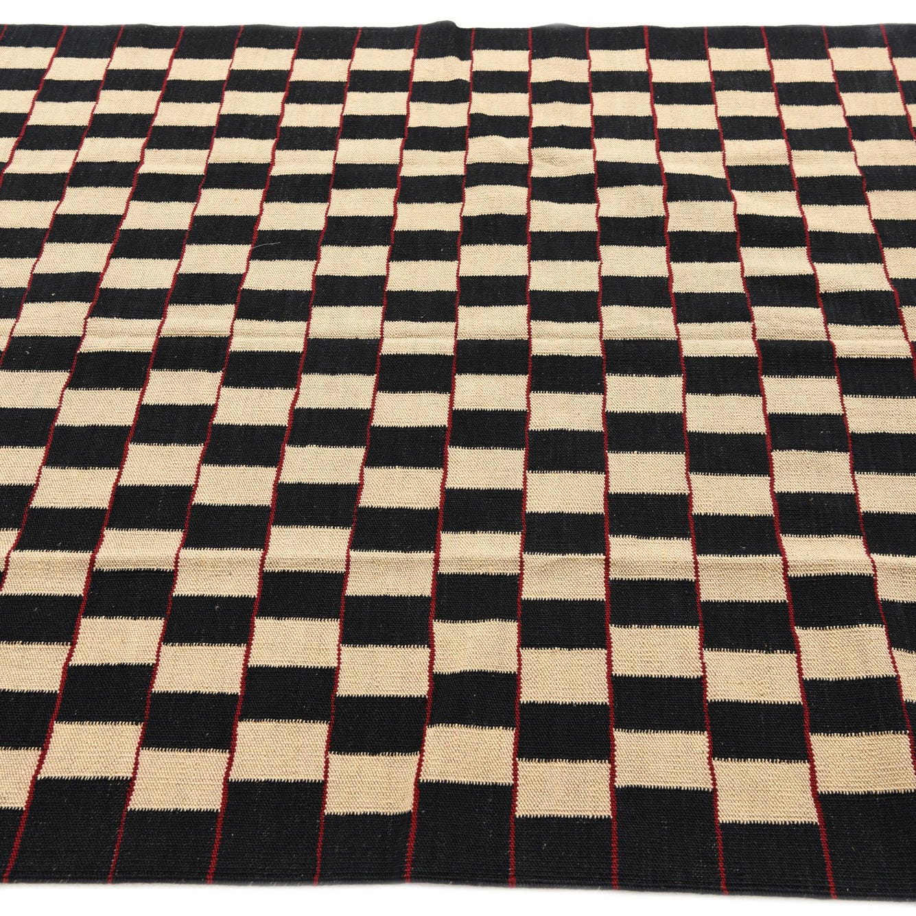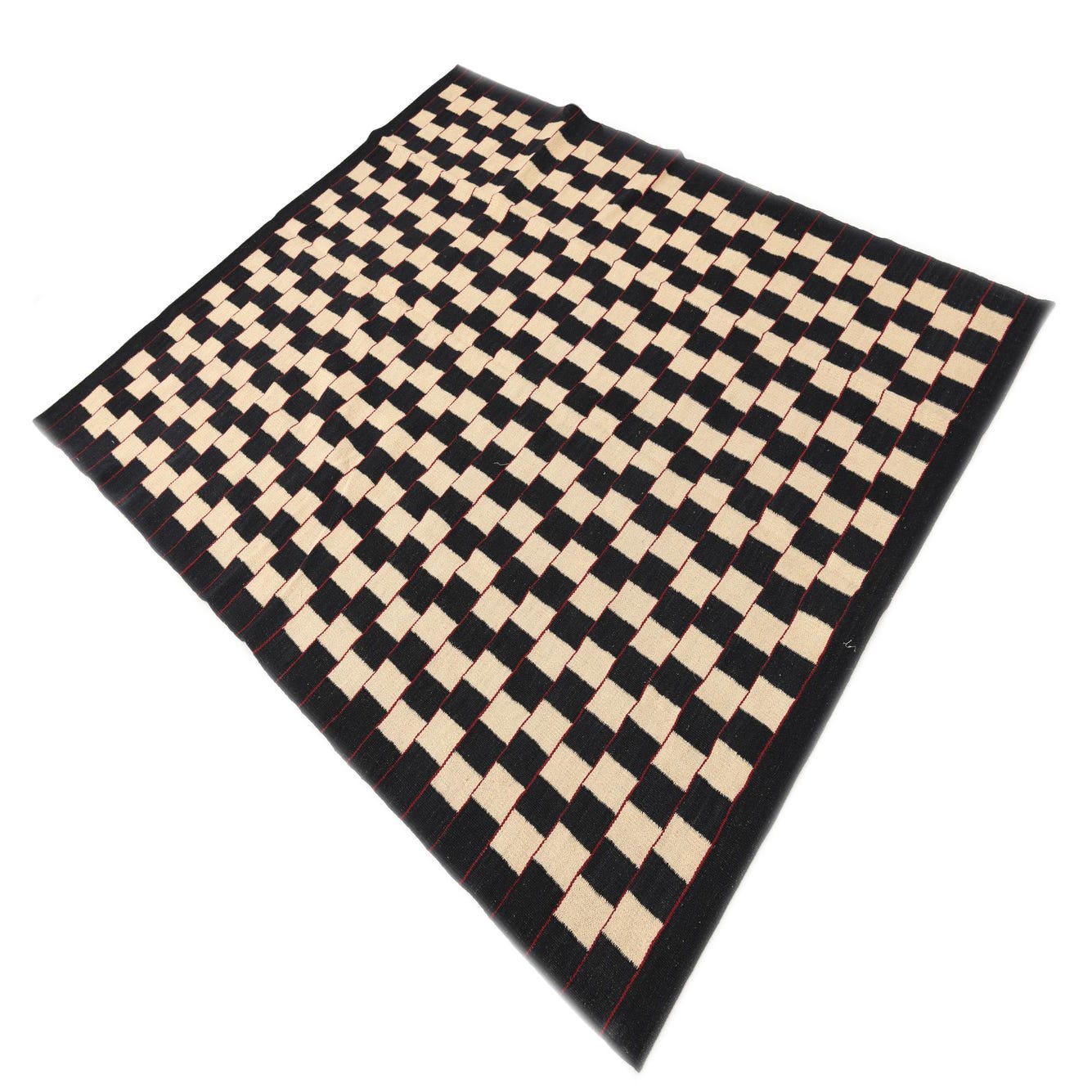 A 5x8 rectangular black and ivory flatweave wool rug with a modern tribal checkerboard pattern.