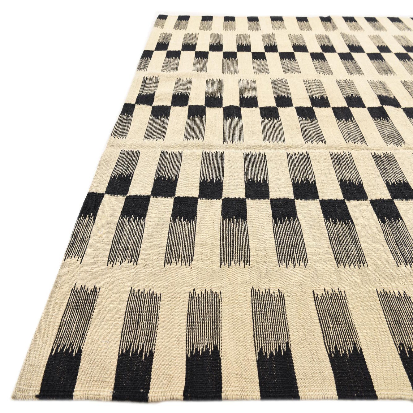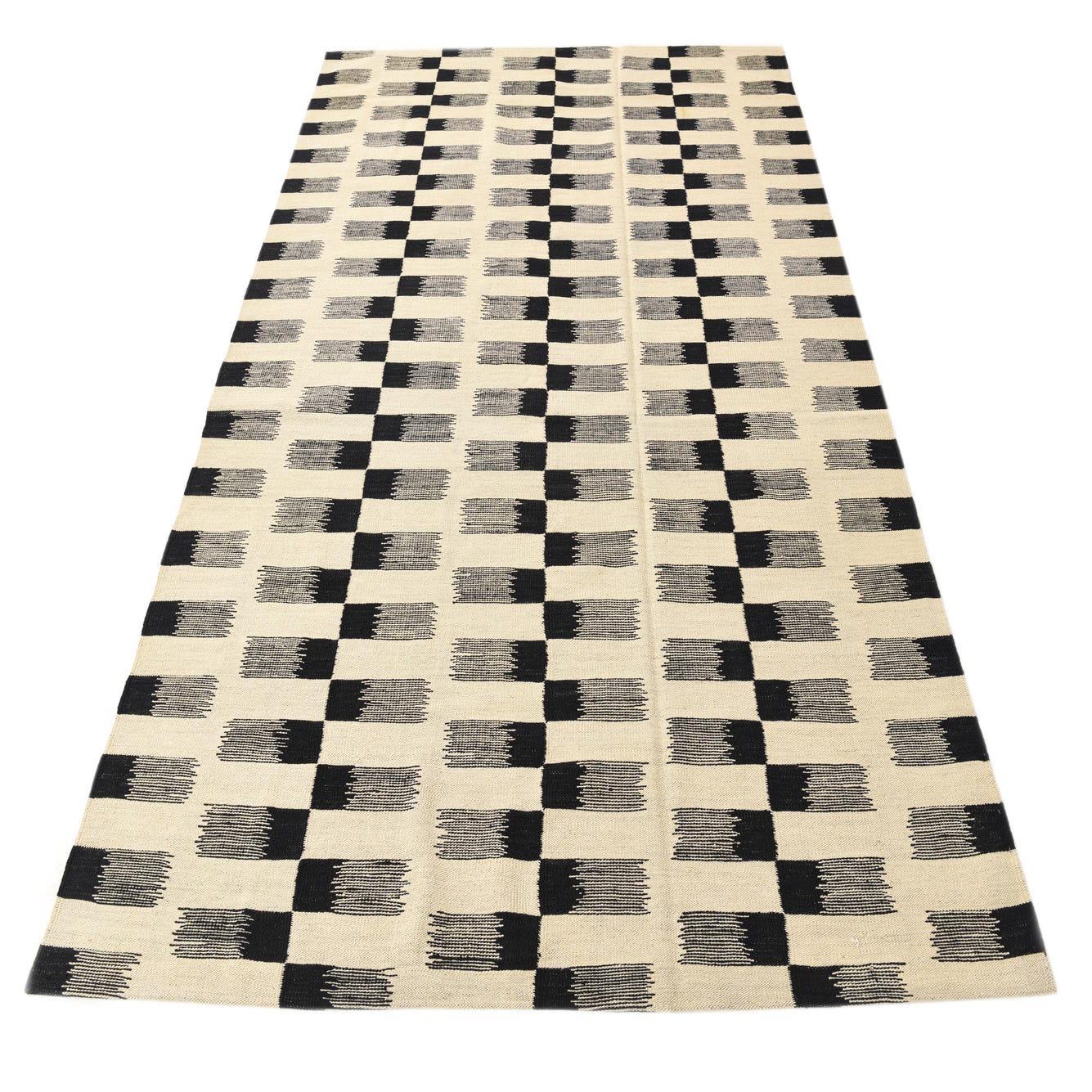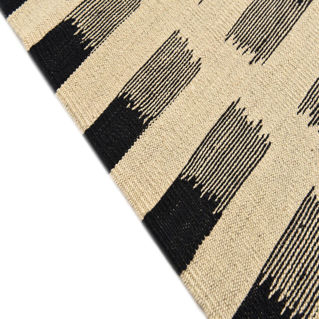 A 5x8 rectangular black and ivory flatweave wool rug with a modern tribal stripe pattern.