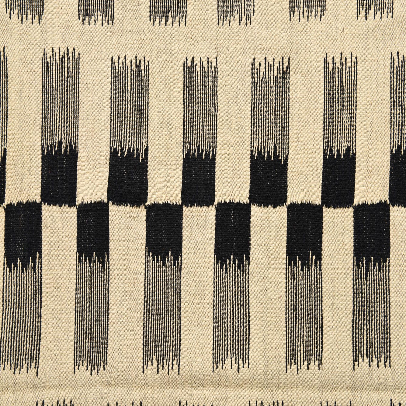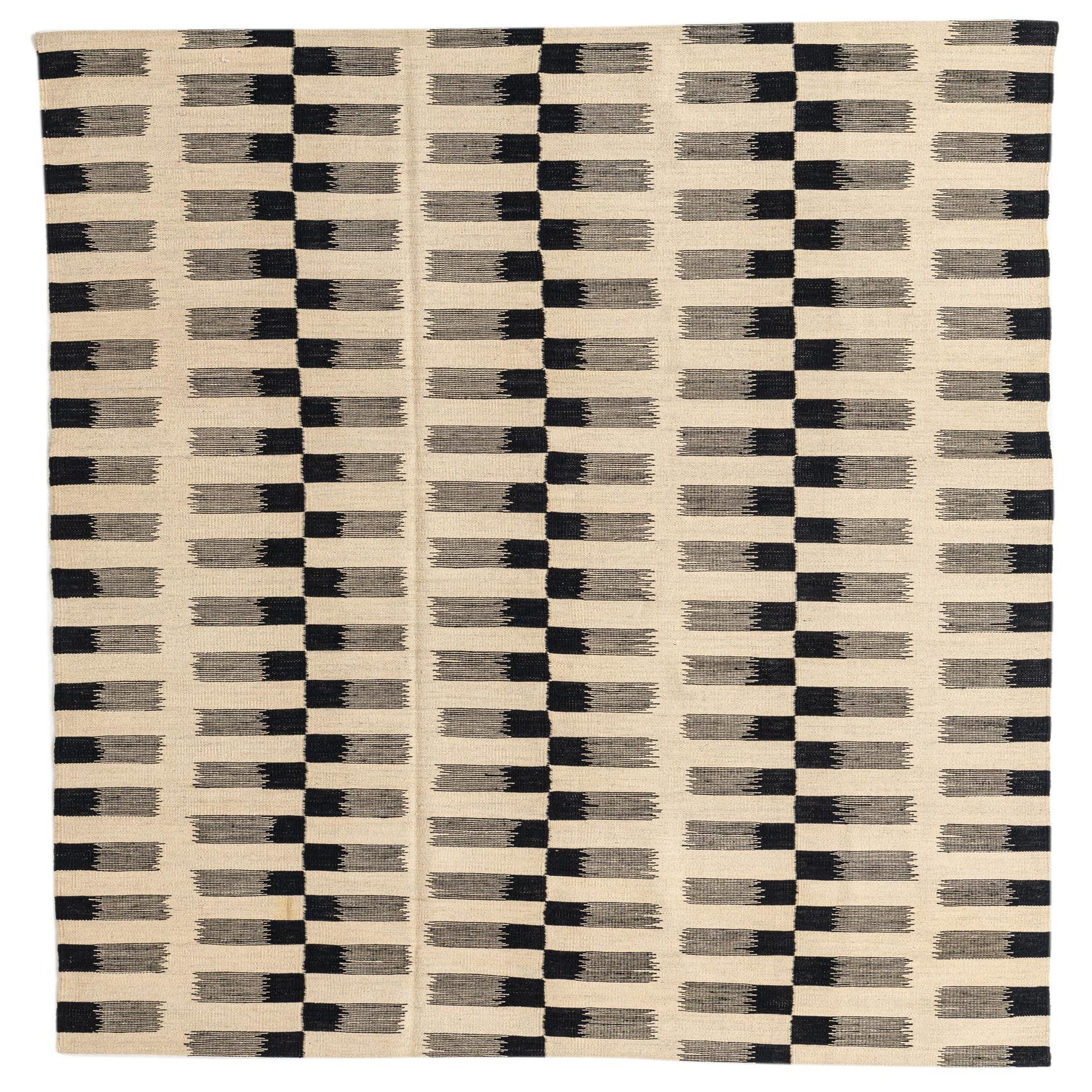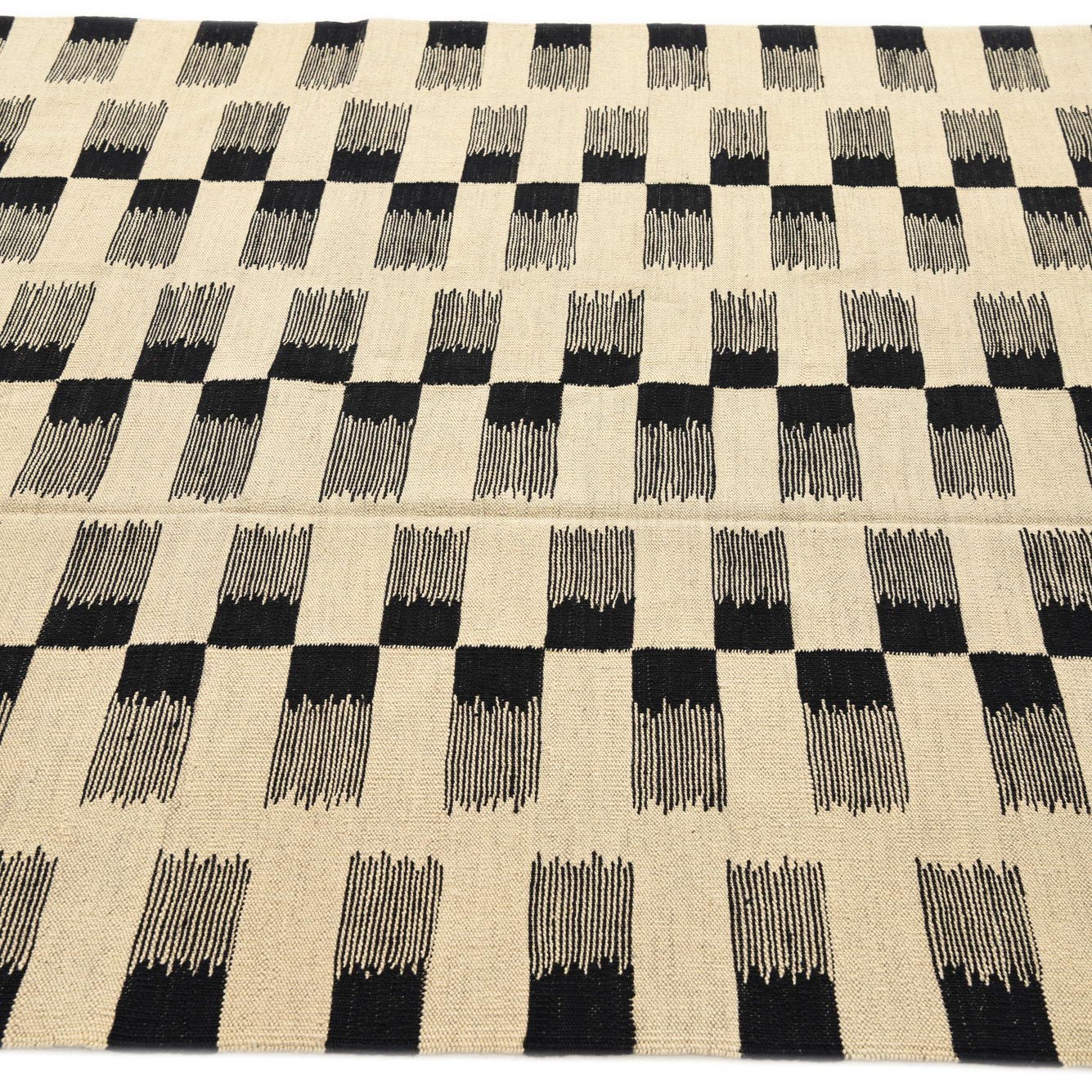 A 5x8 rectangular black and ivory flatweave wool rug with a modern tribal stripe pattern.