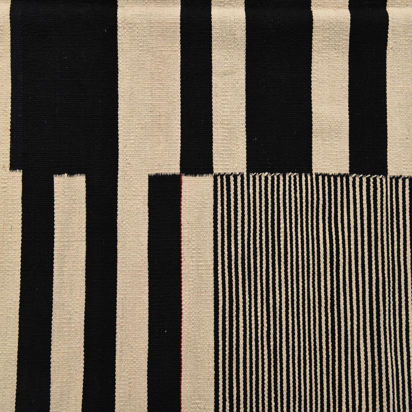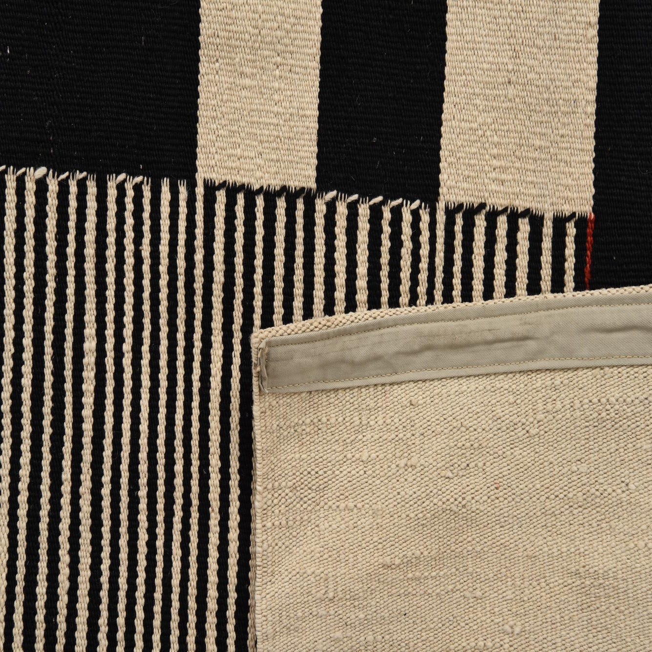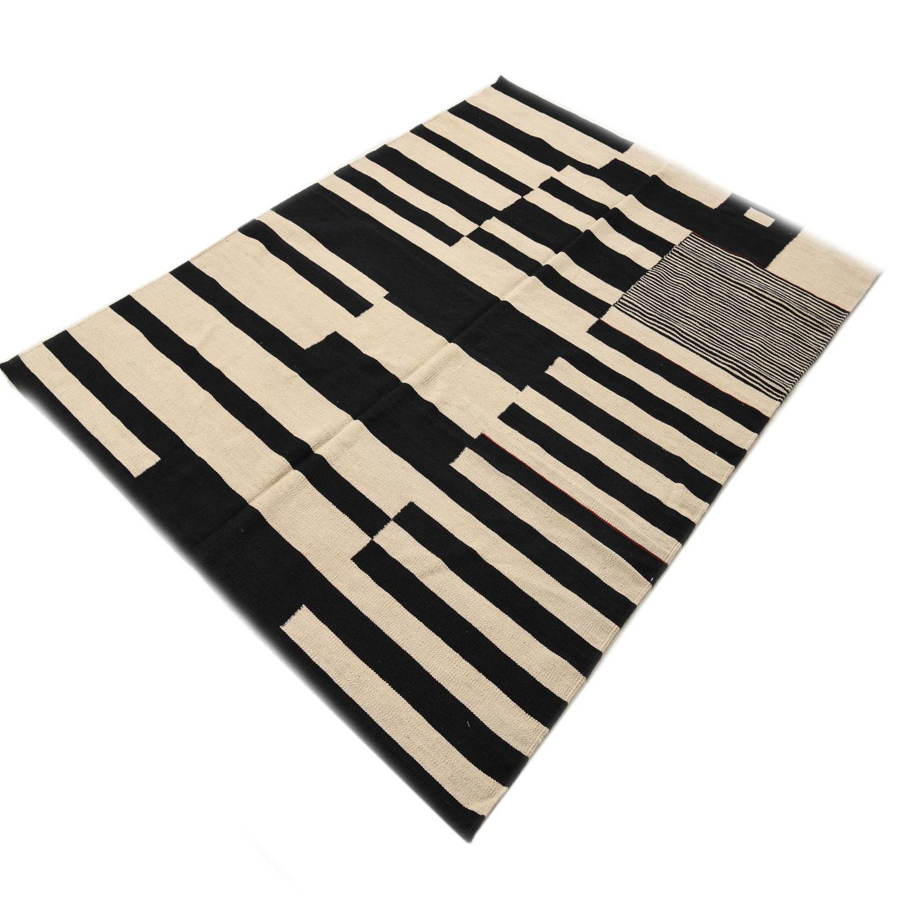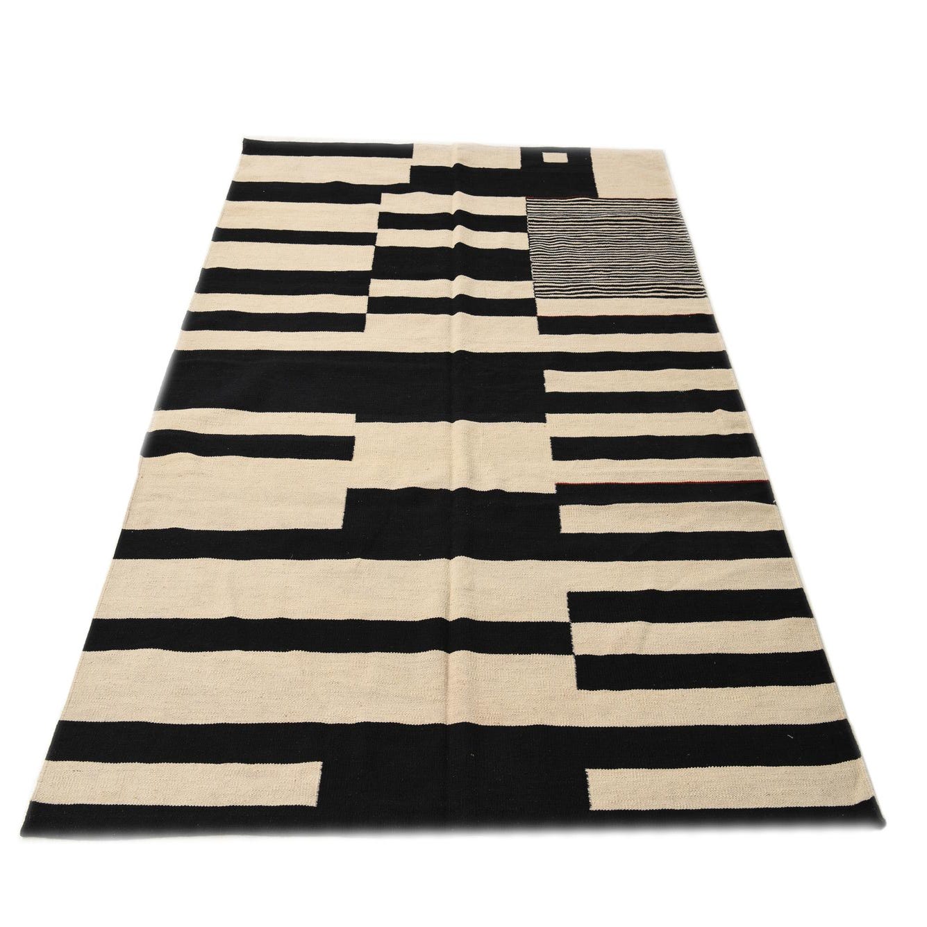 A 5x8 rectangular Kilim Modern rug with a bold black and cream geometric tribal pattern, handmade from wool.
