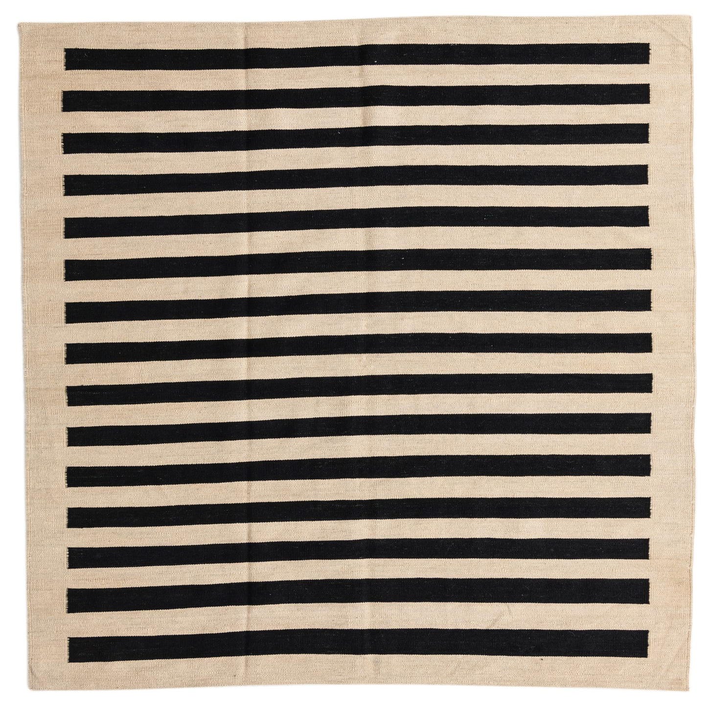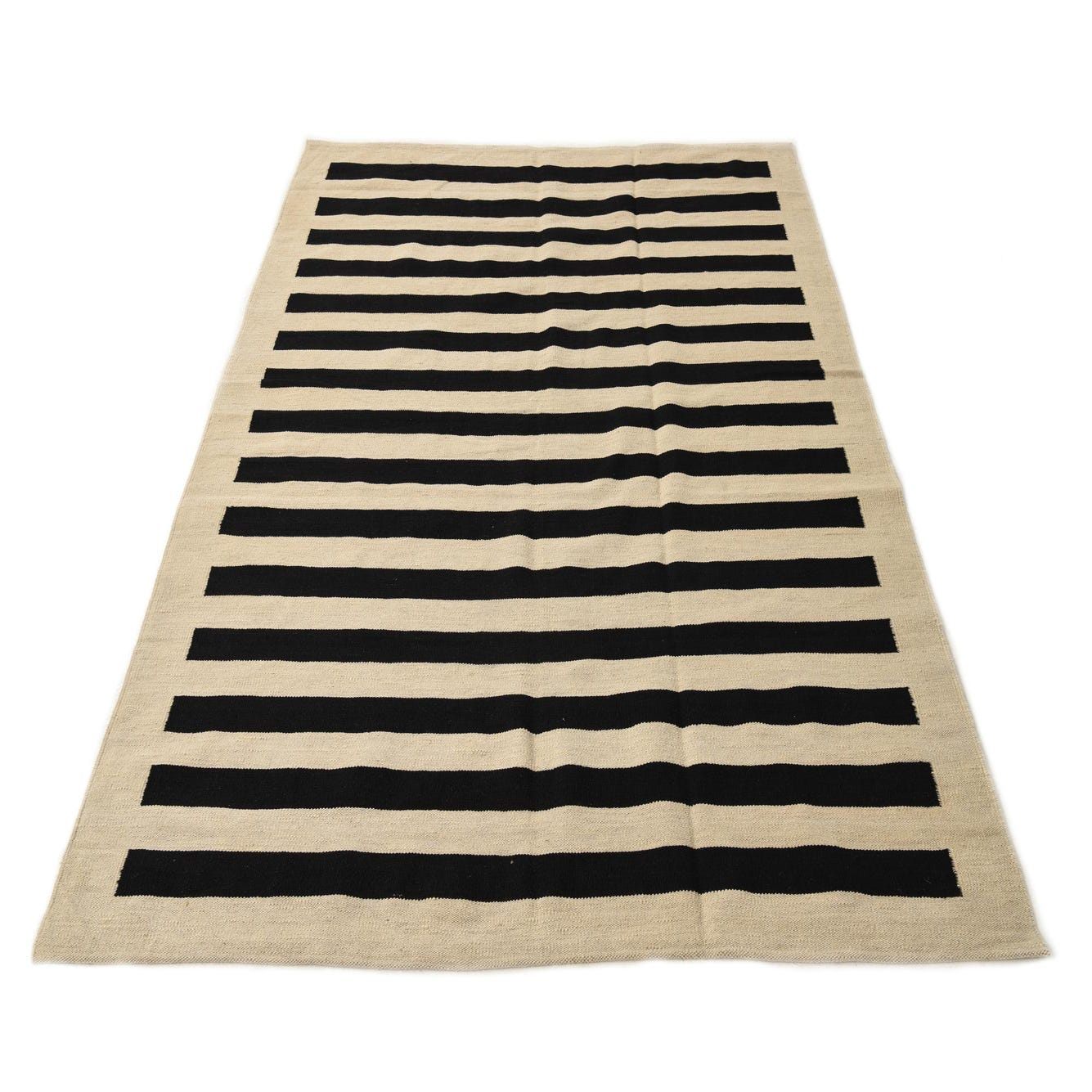 A 5x8 rectangular Kilim Modern rug from Rugs.com featuring bold black and cream horizontal stripes, perfect for a living room.