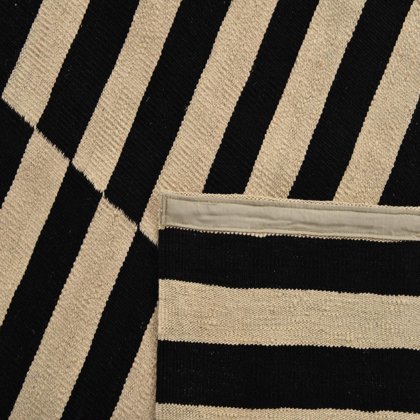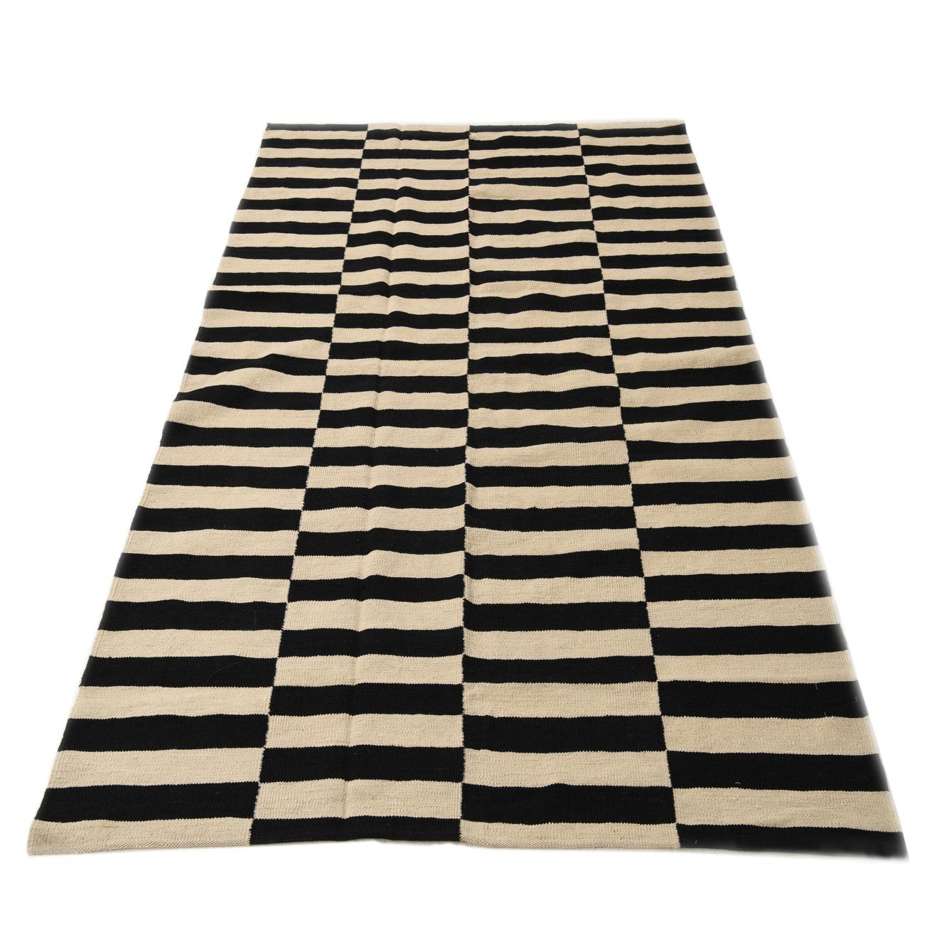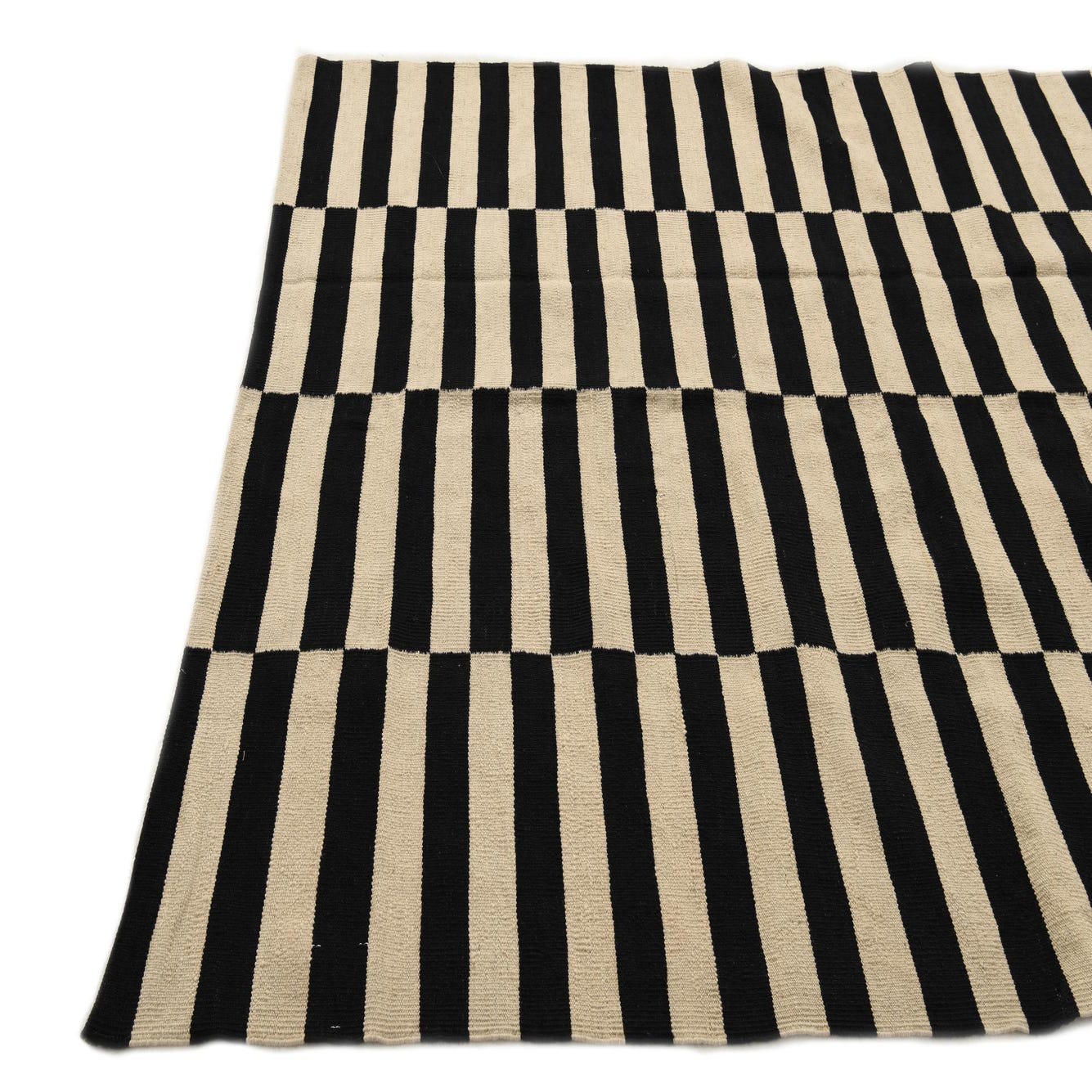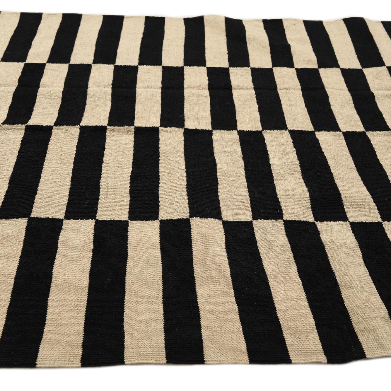 A 5x8 rectangular flatweave rug with a bold black and cream striped pattern, featuring alternating horizontal and vertical blocks.