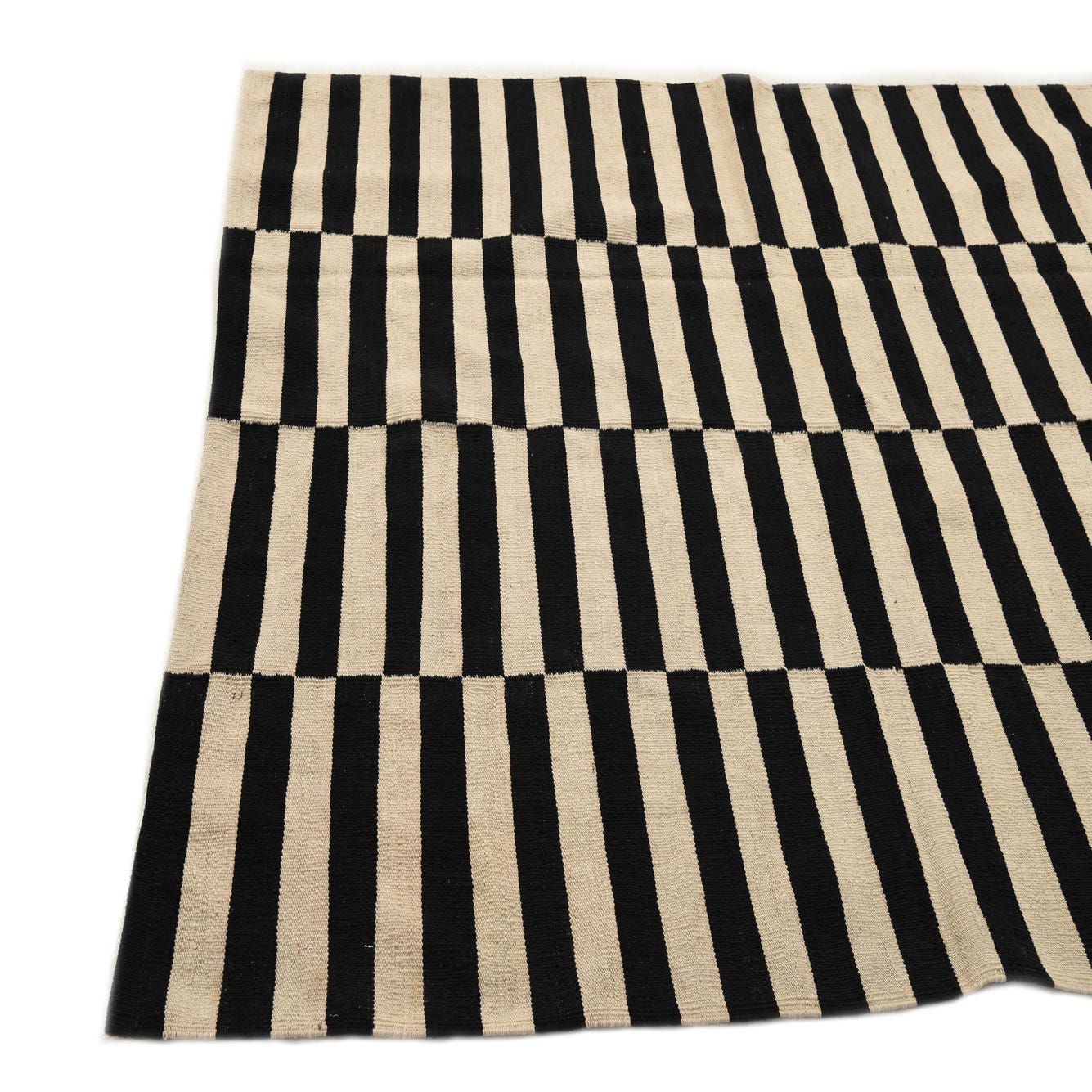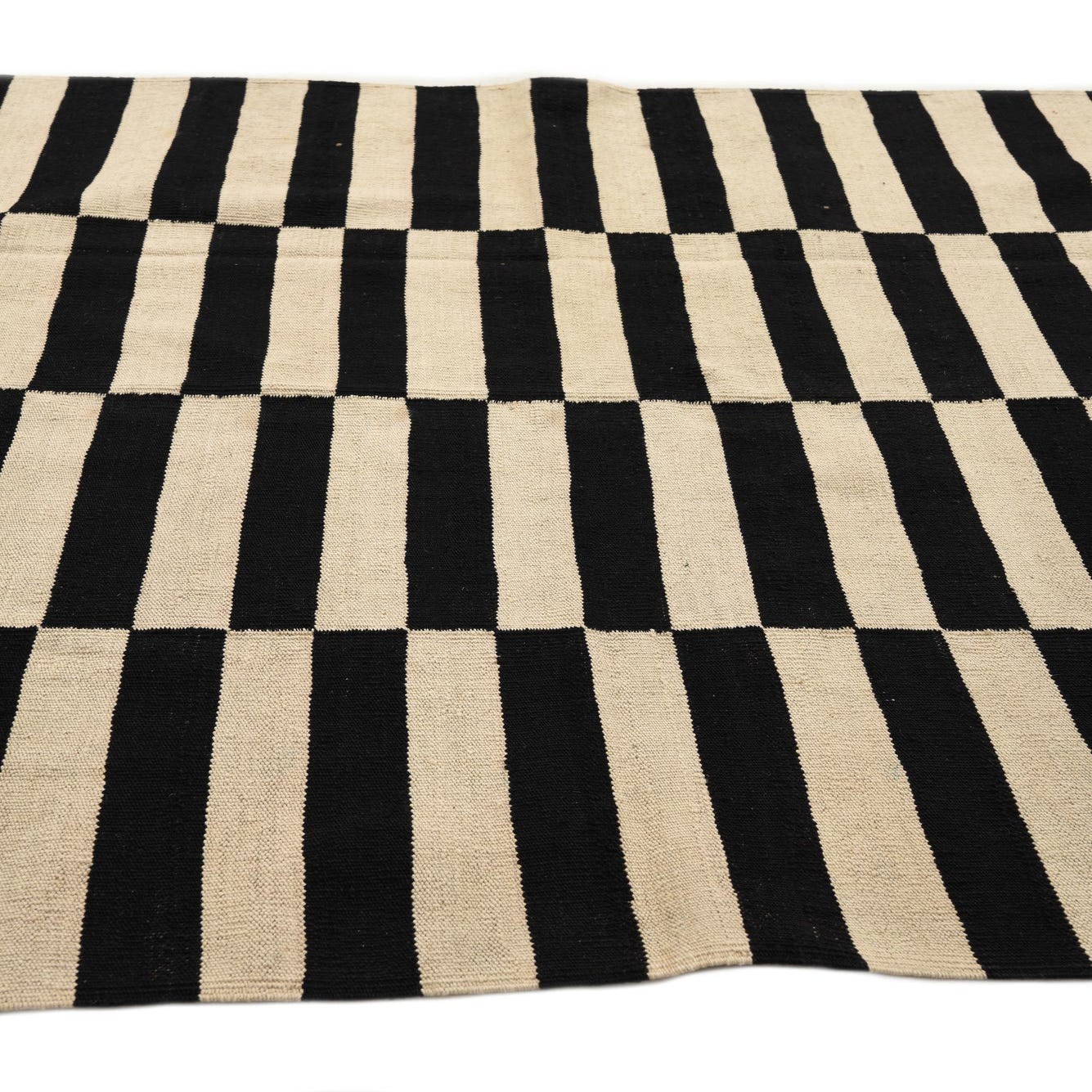 A 5x8 rectangular black and cream flatweave rug with a bold, modern striped pattern, ideal for a living room or dining area.