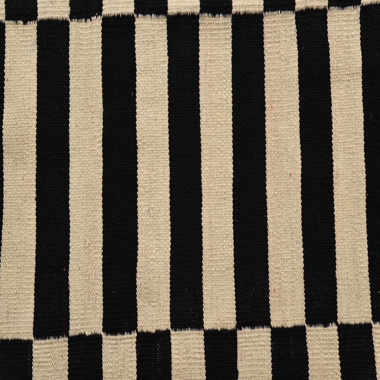 From the Kilim Modern collection, this handwoven 5x8 rug presents a bold, linear design that honors the timeless Kilim craftsmanship. Woven from 100% wool, the rug features a crisp pattern of alternating black and white stripes, creating a dramatic visual contrast that makes a definitive statement in any setting. The rug’s flatweave construction lends it a durable, low-profile texture which is ideal for areas with high foot traffic.
