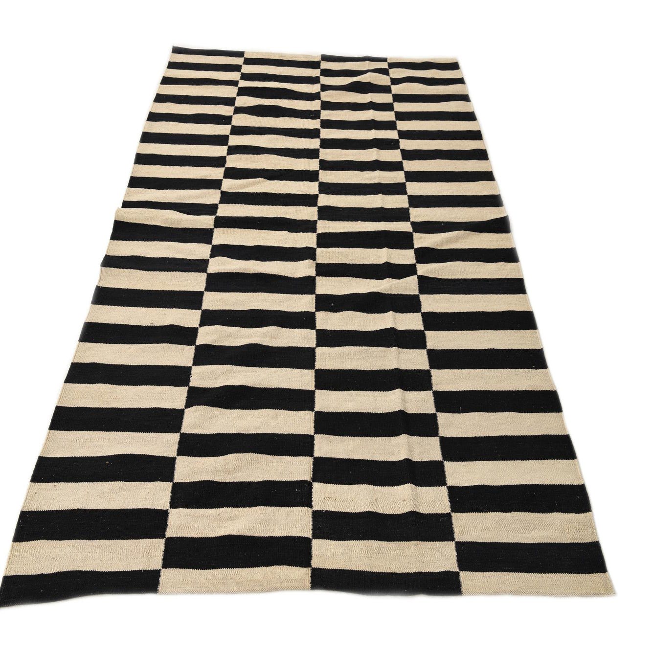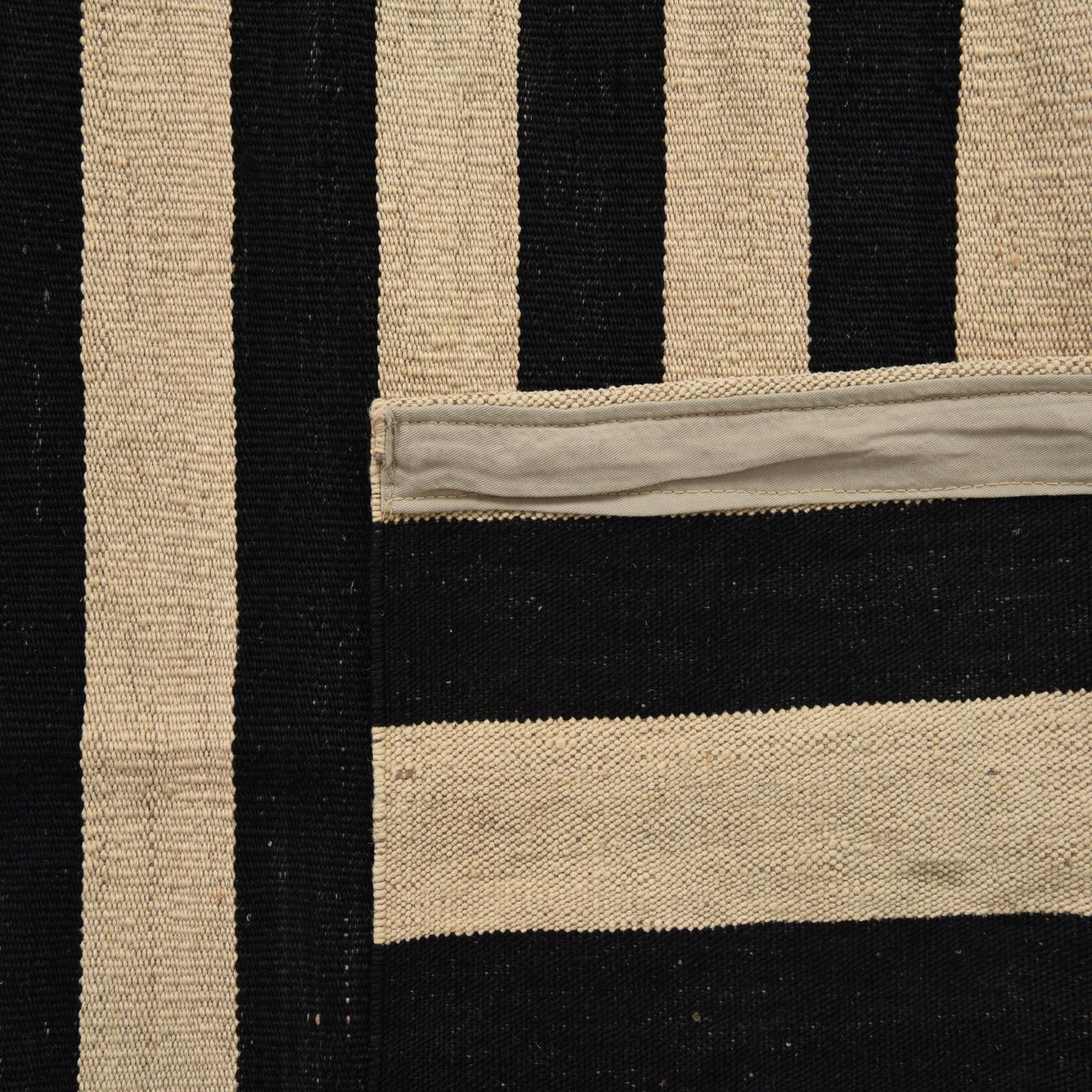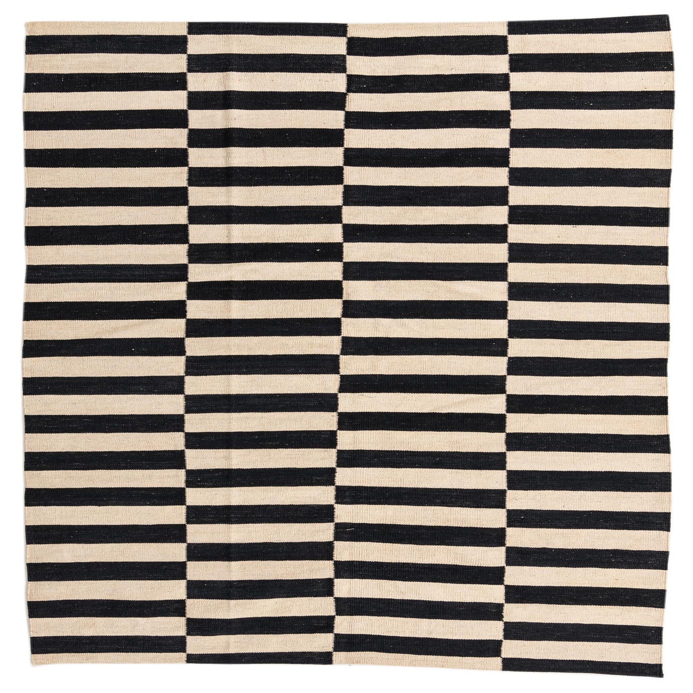 A 5x8 rectangular black and ivory flatweave rug featuring a bold, alternating horizontal stripe pattern, perfect for a modern living room.