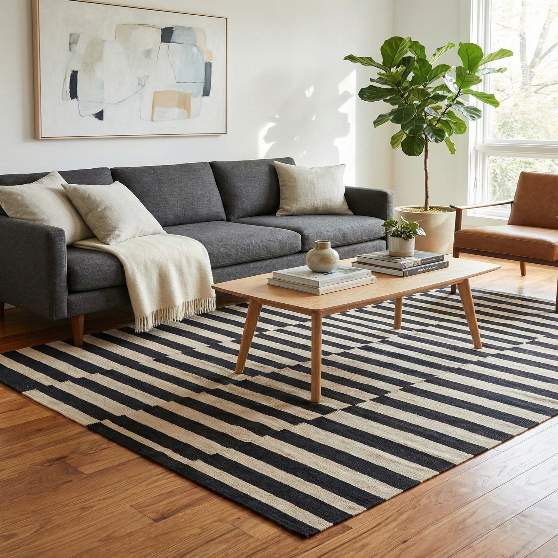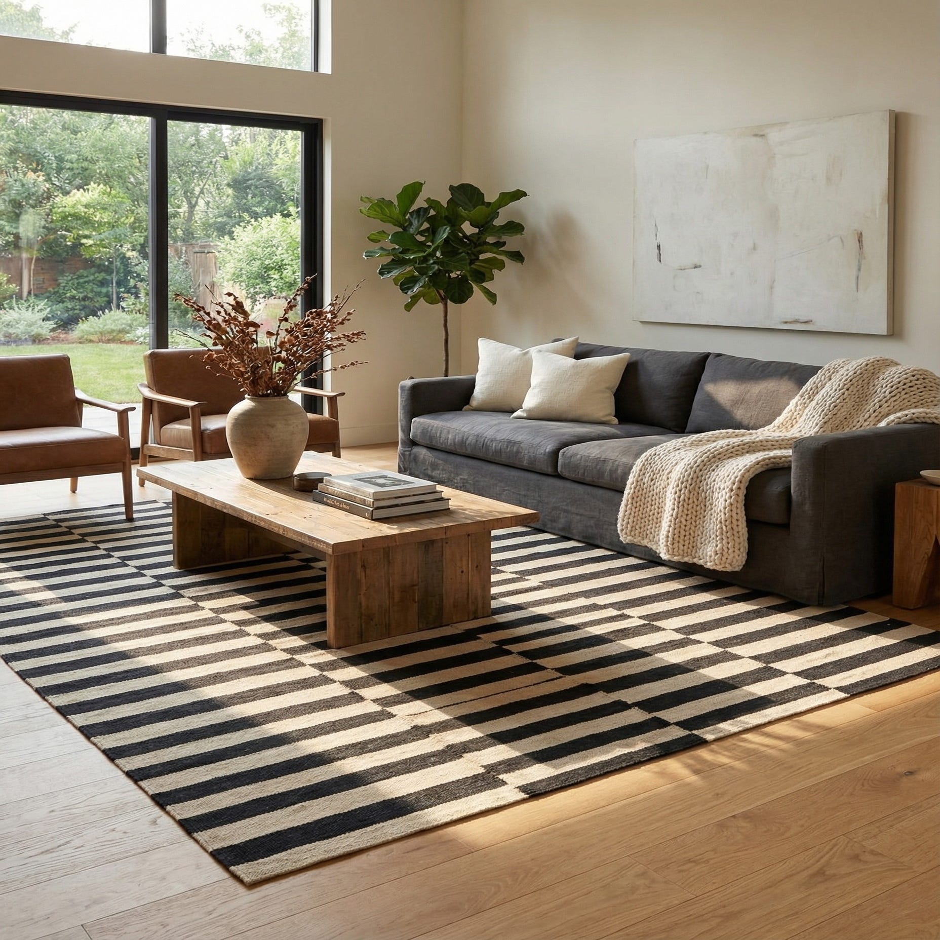 The rug’s monochrome palette and linear motif suit modern, minimalist, and Scandinavian interiors as well as more eclectic spaces seeking a strong anchor. Use it to ground a living room seating area beneath a sofa and coffee table, add graphic contrast to a neutral bedroom, or make a striking statement in an entry or dining space. The combination of durable wool and a clean, architectural pattern makes it easy to layer with warm woods, metal accents, and textured throws or cushions.