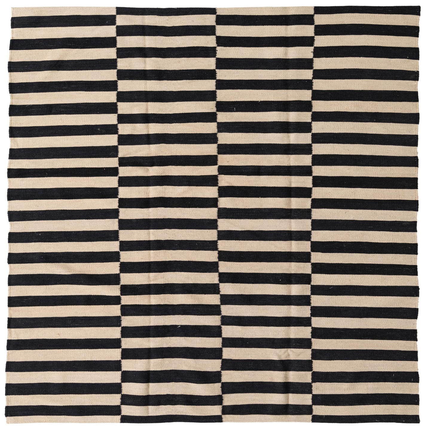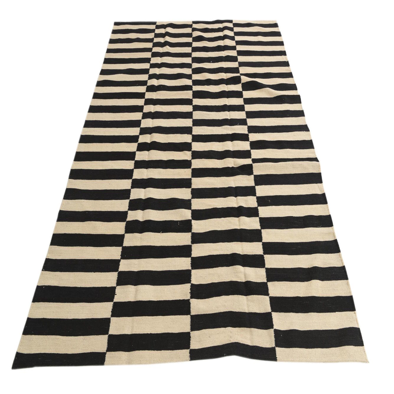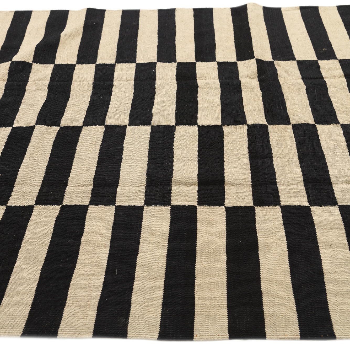 A 5x8 rectangular Kilim Modern rug with a black and cream striped pattern, featuring alternating horizontal and vertical blocks.