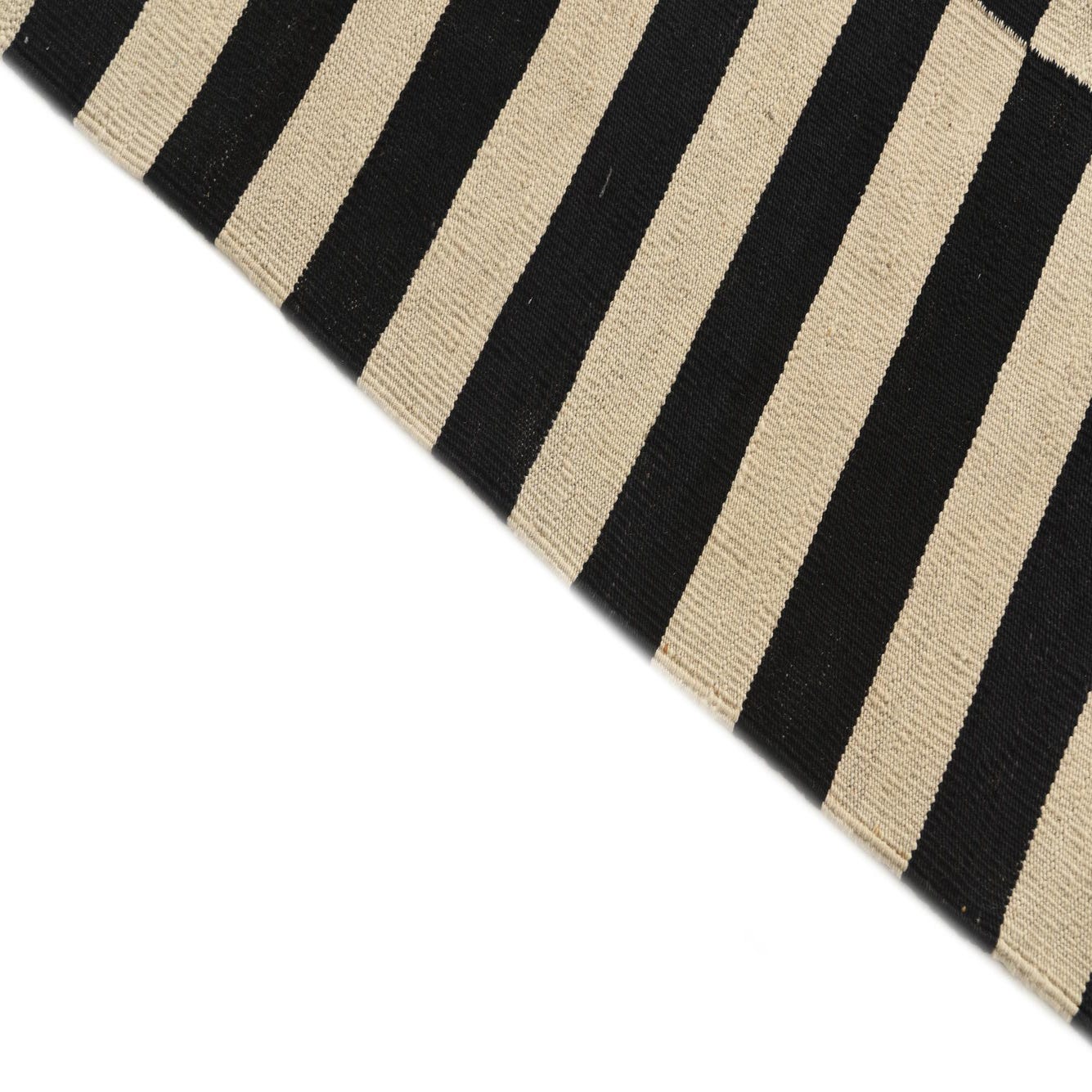 A bold graphic of alternating black and off-white horizontal bands is organized into three vertical panels, giving the rug a structured, rhythmic look. The hand-woven construction in 100% wool produces a flatweave surface with a low profile and subtle ribbing where the weft crosses the warp. Running your hand across it, you feel the firm, slightly textured weave typical of traditional flatwoven rugs—crisp lines and a tactile, natural wool finish.
