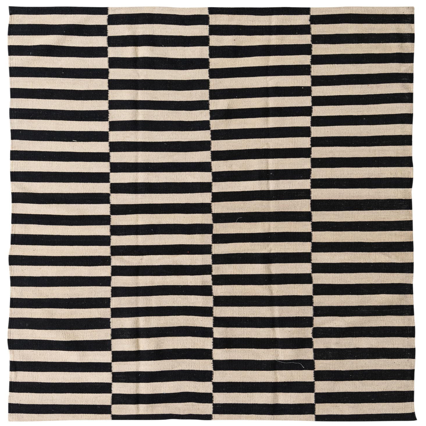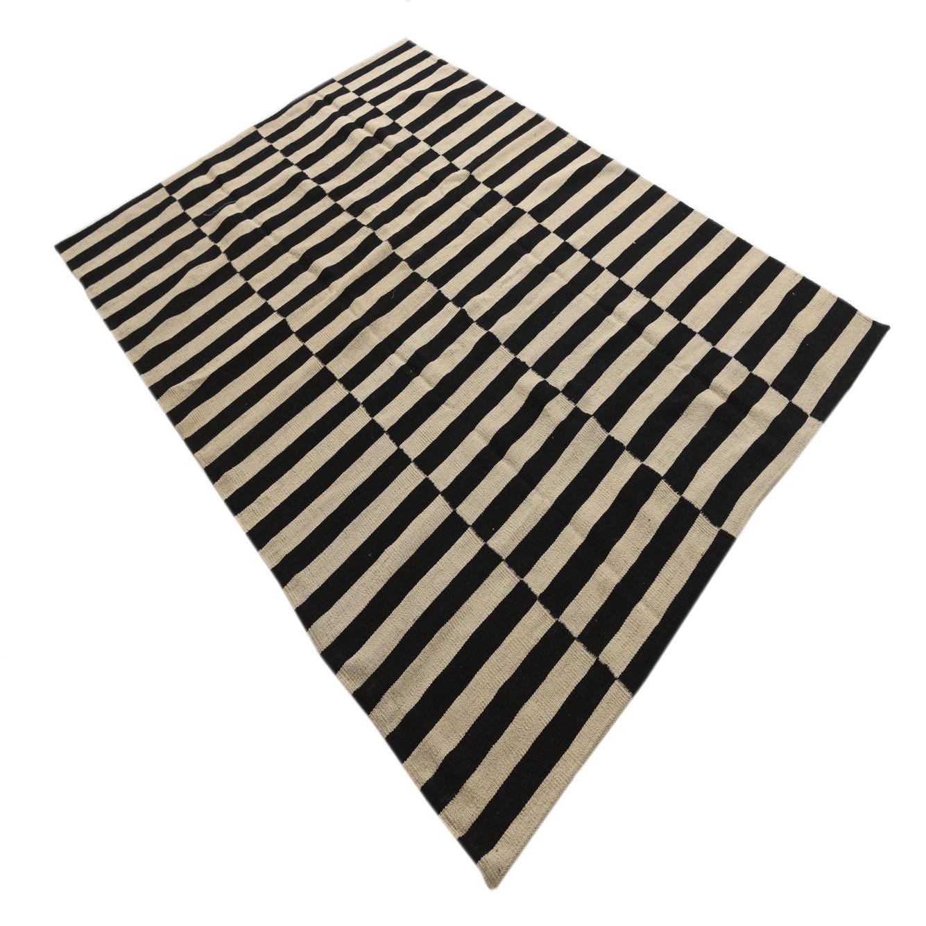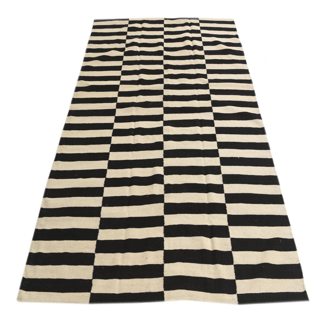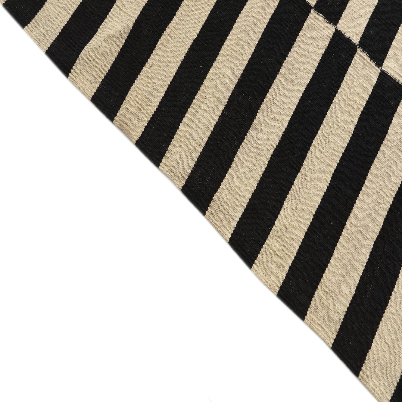 Part of our Kilim Modern collection, this handwoven area rug offers a bold, graphic pattern with a contemporary edge. Its stark black and white stripes deliver contrast and visual interest. Crafted from 100% wool, the rug has a texture that speaks to its quality and durability, while the handwoven nature ensures each piece has a unique artisanal touch. Measuring 5x8, this rug is well-suited for a variety of spaces.