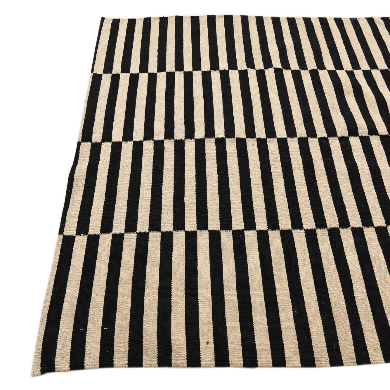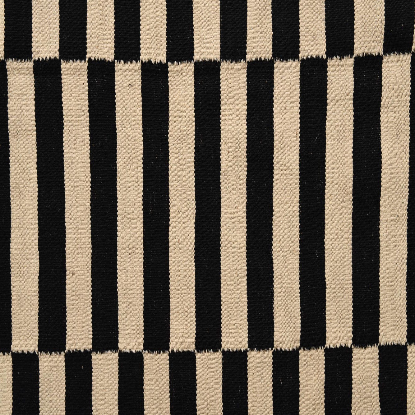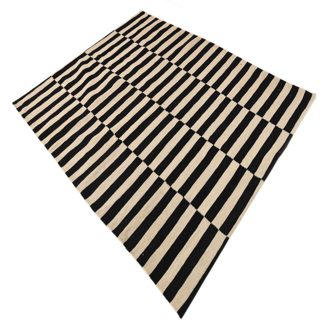 A 5x8 rectangular black and ivory flatweave rug with a bold, modern striped pattern, ideal for a living room.
