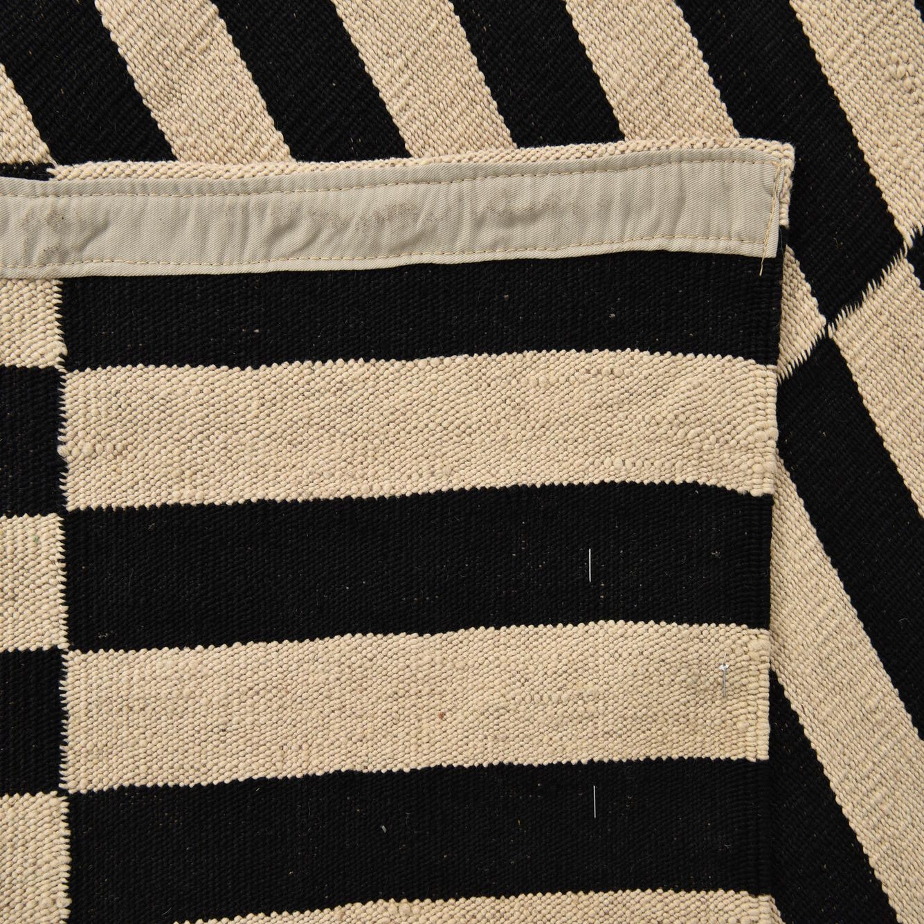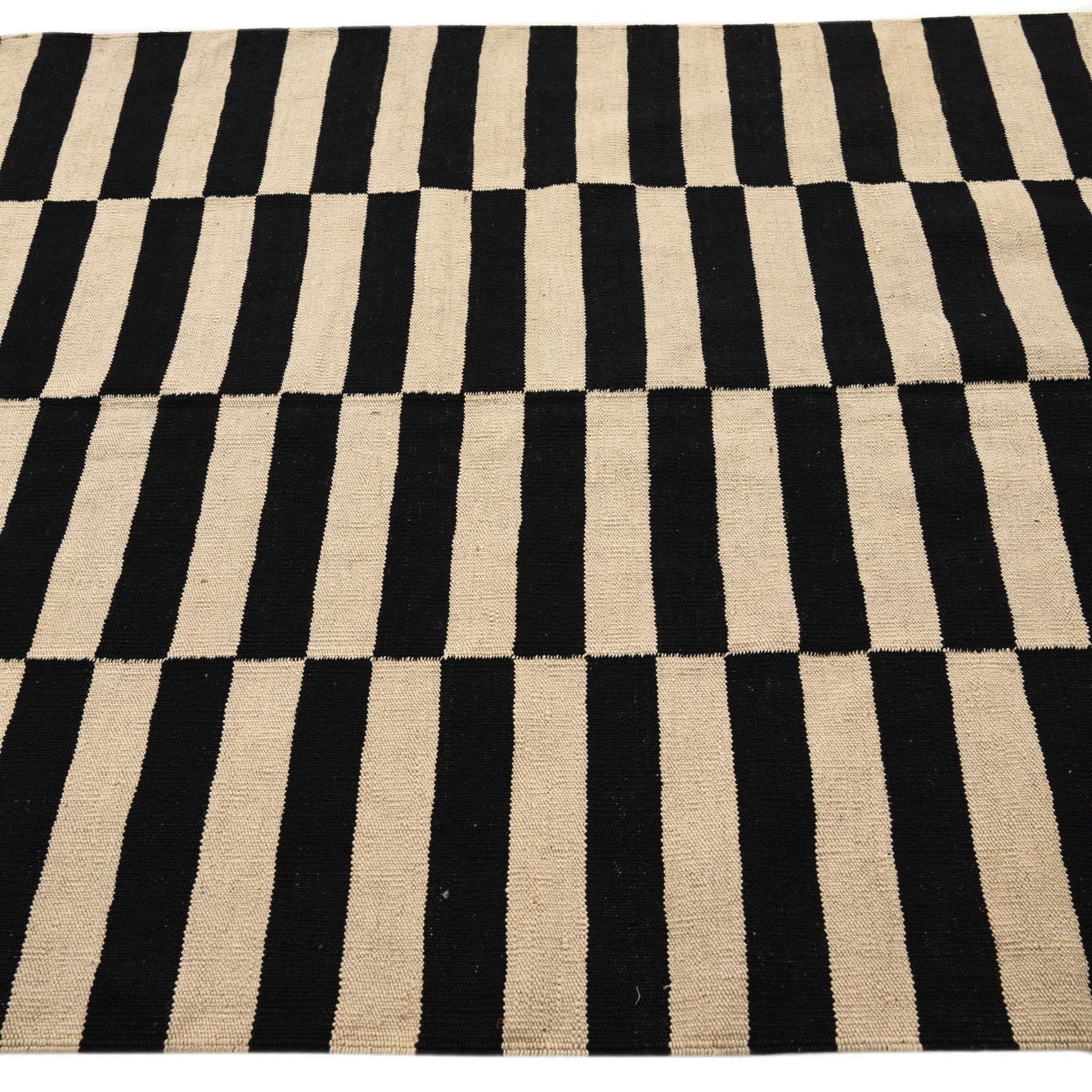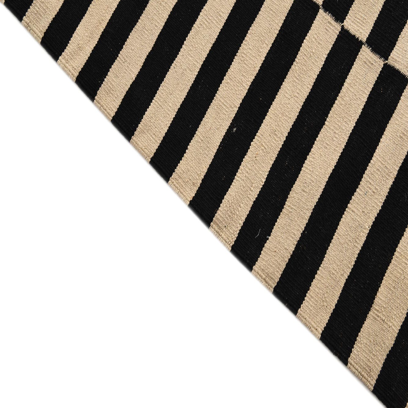 A 5x8 rectangular black and ivory flatweave rug with a bold, modern striped pattern, ideal for a living room.