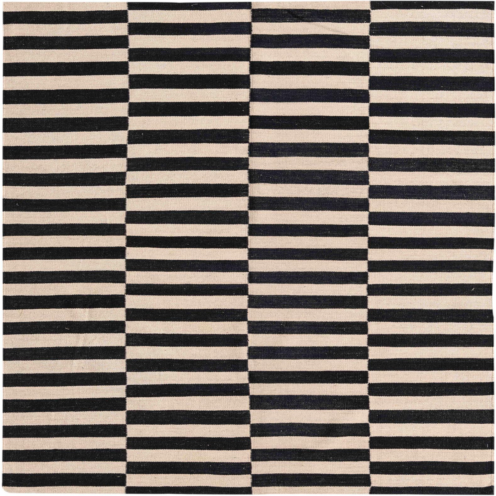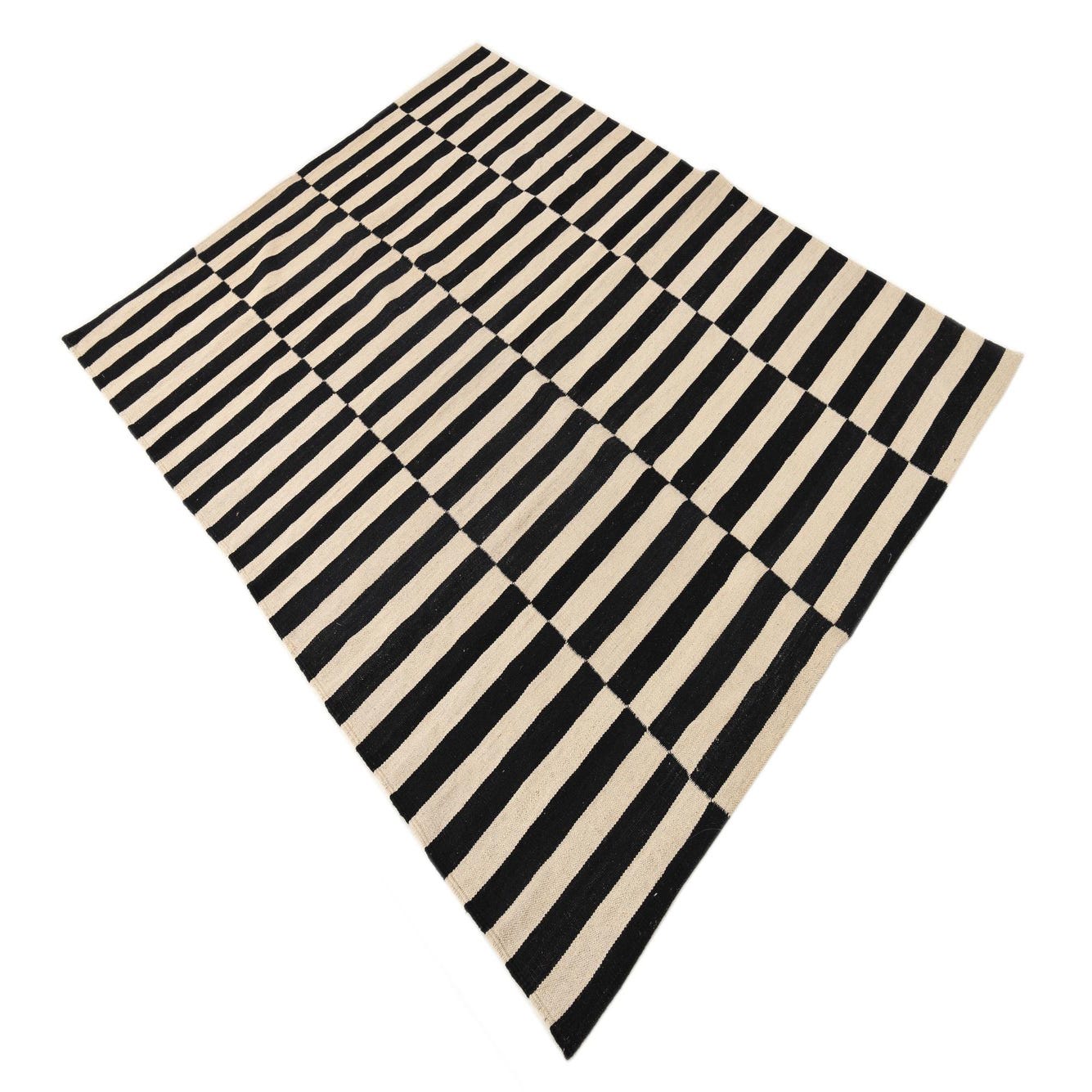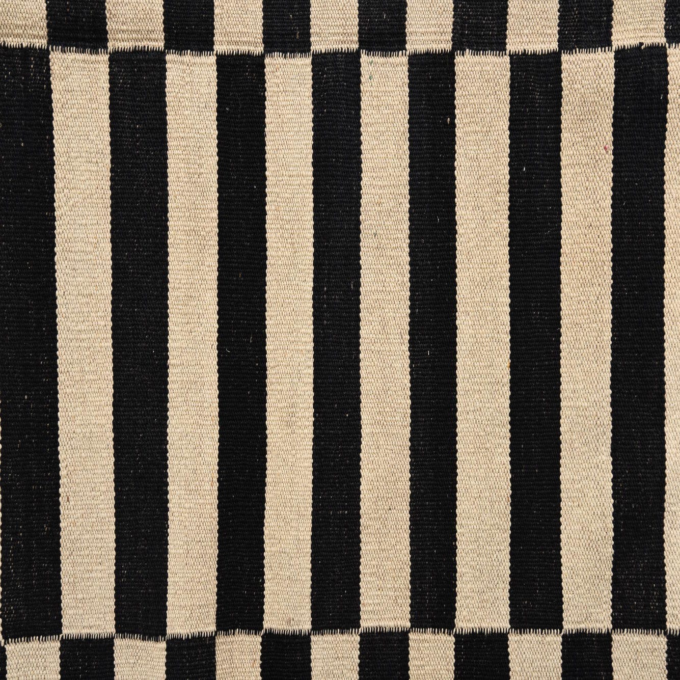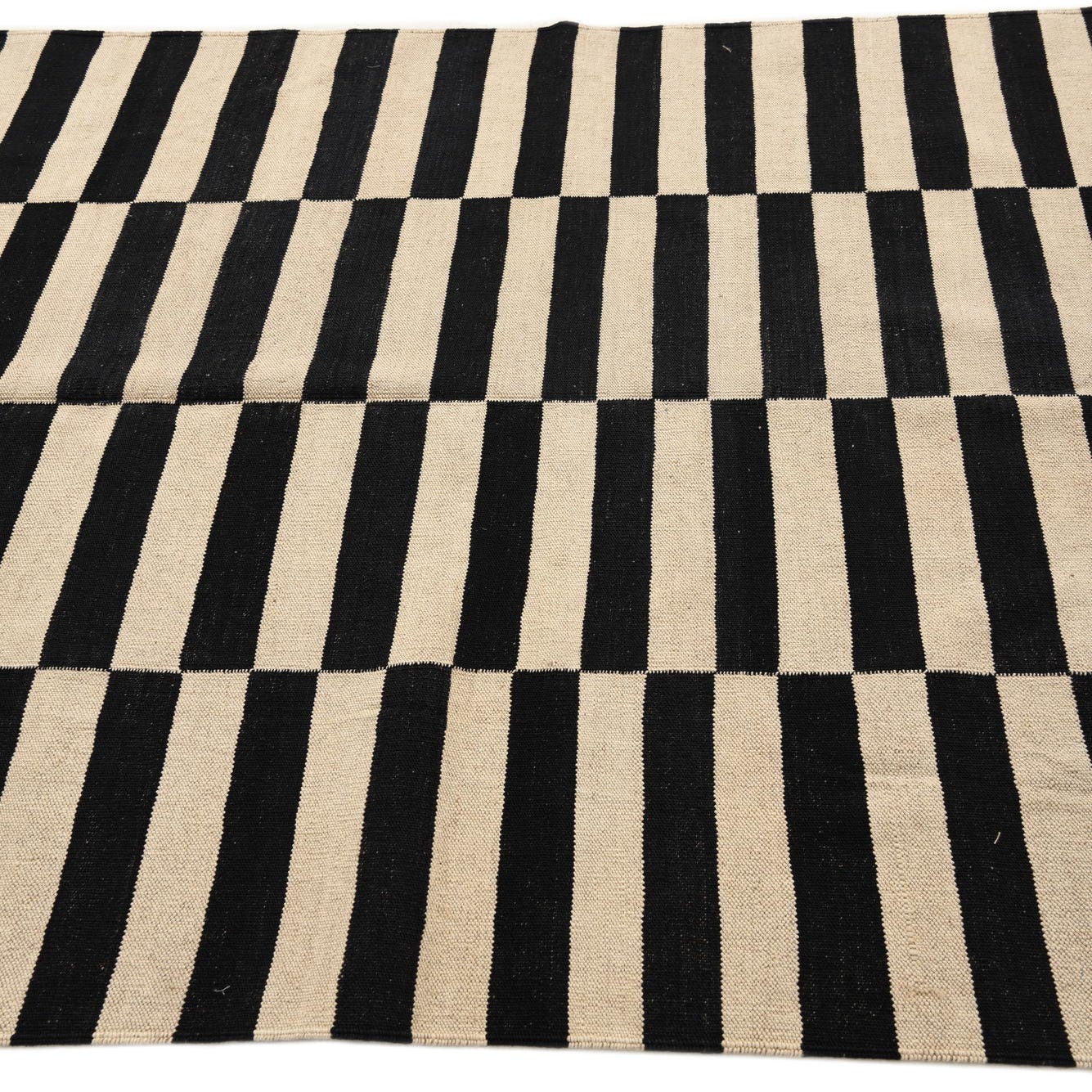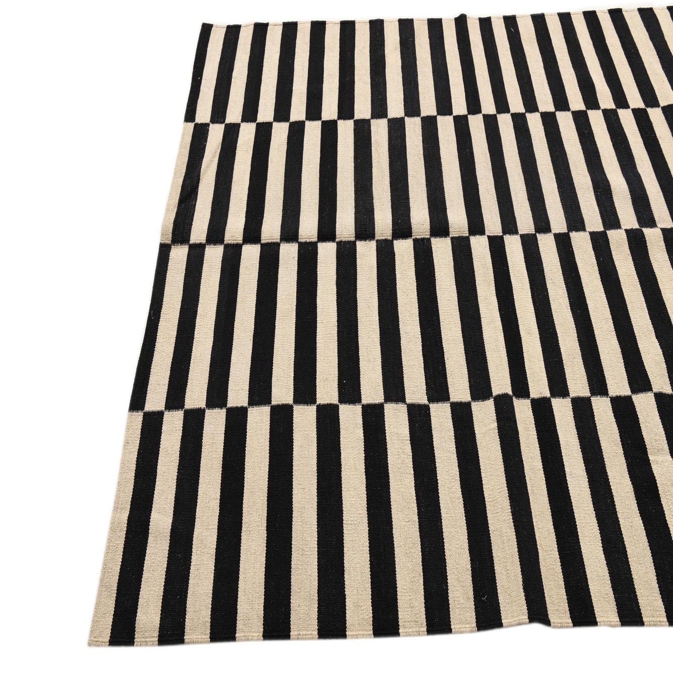 The Kilim Modern collection presents a hand-woven rug crafted from 100% wool, offering a durable and tactile surface. This 5x8 rug showcases a bold and graphic black and white striped pattern that brings a contemporary edge to its traditional Kilim design roots. The crisp contrast and clean lines of the stripes create a striking visual impact that can anchor a room with its assertive design.
