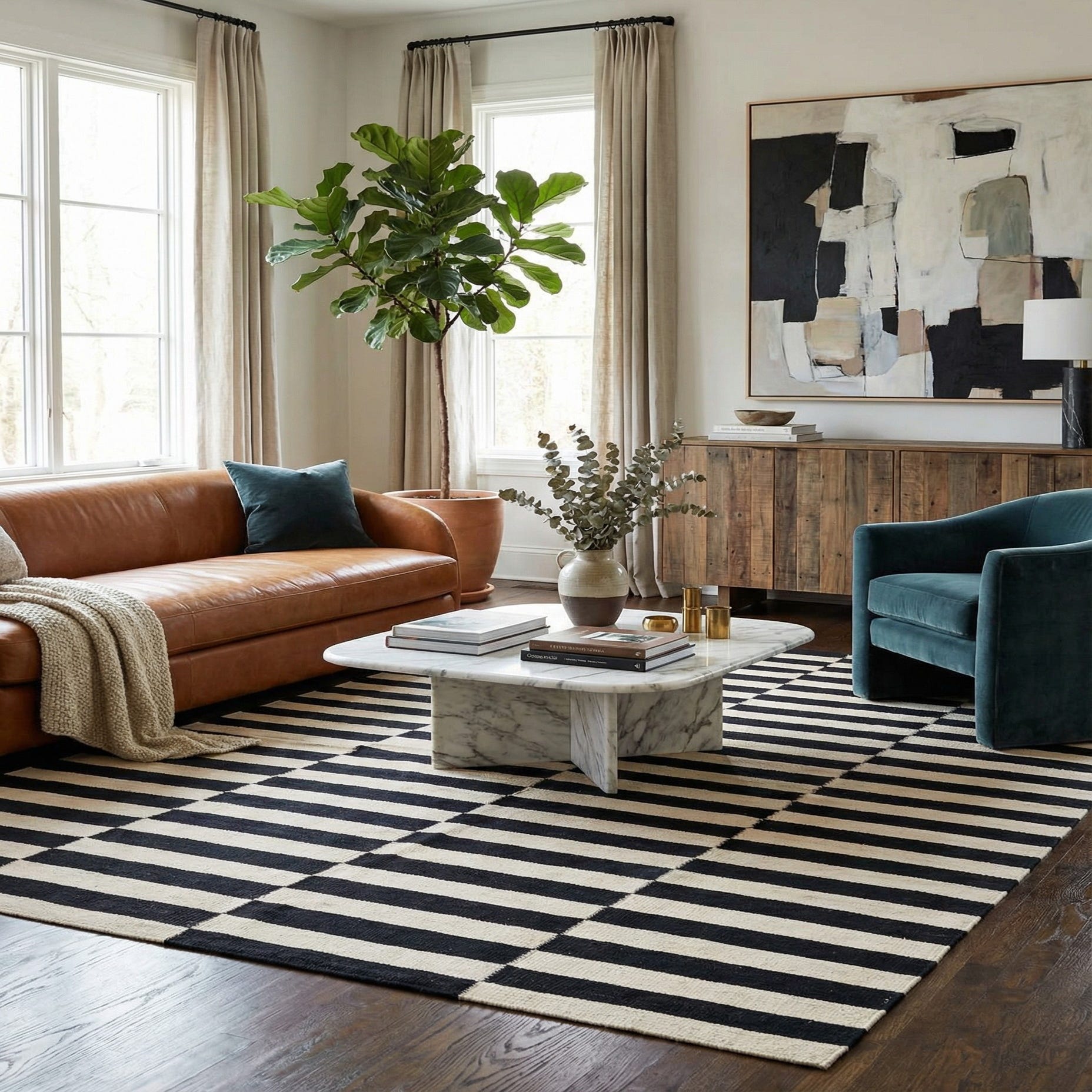 The rug's black and white color scheme offers versatility, making it an ideal candidate for a range of interior design styles, from monochromatic and minimalist aesthetics to eclectic and contemporary spaces. Moreover, the stripe motif can serve as a visual counterpoint in rooms with curvilinear furniture or decorative elements, adding a sense of order and balance.
