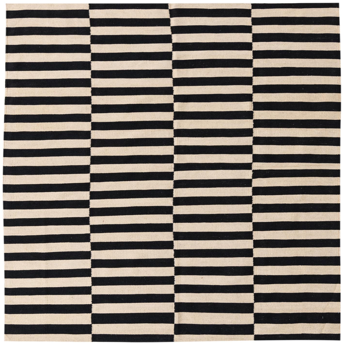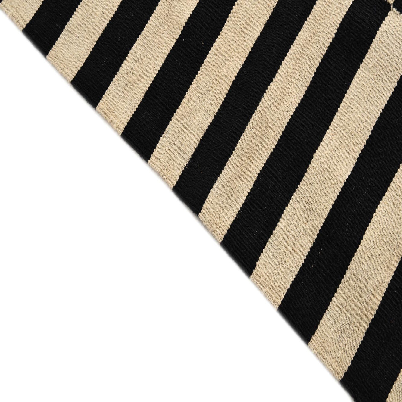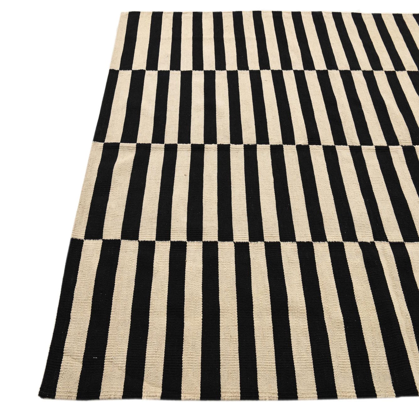 A 5x8 rectangular black and cream flatweave rug with a bold, modern striped pattern, ideal for a living room.