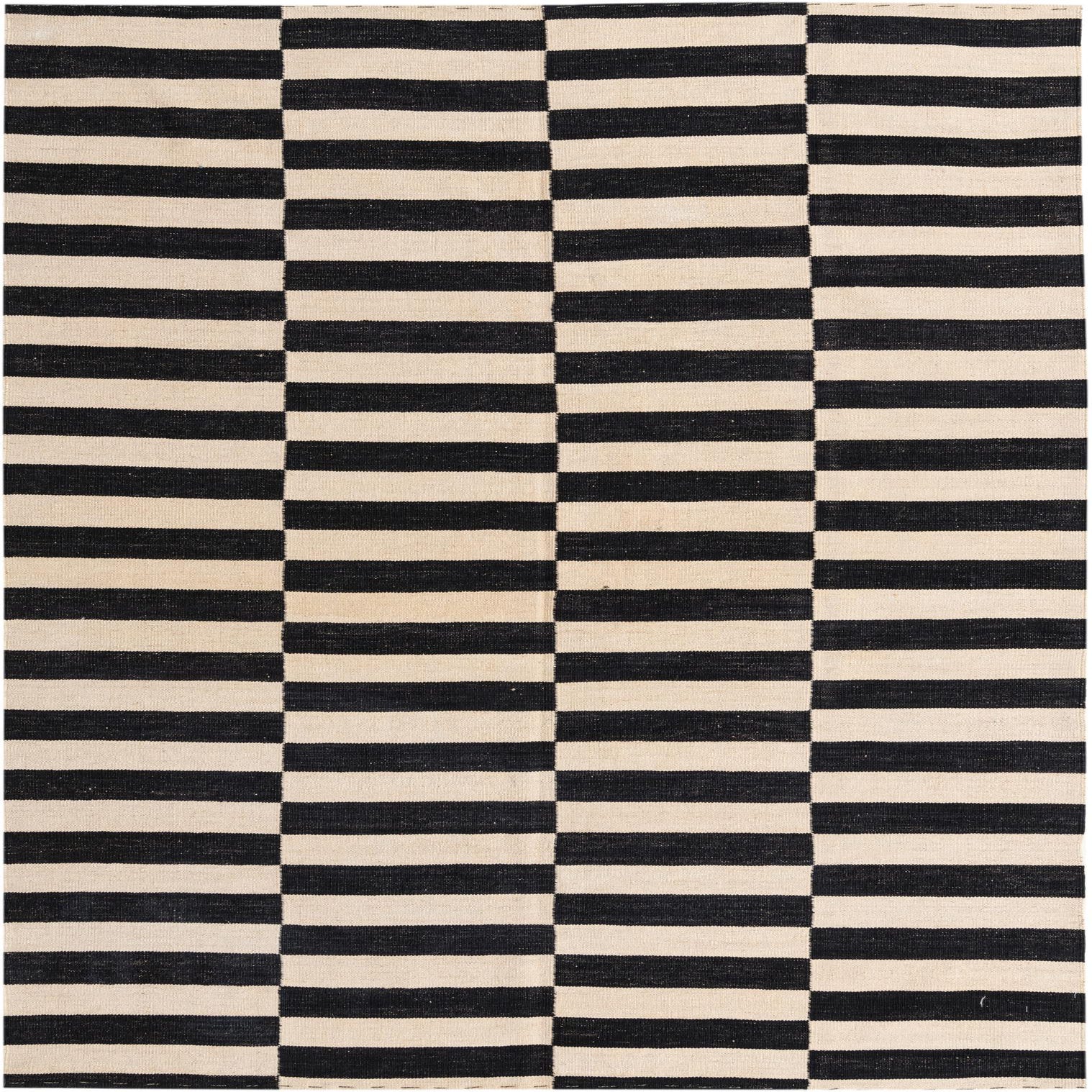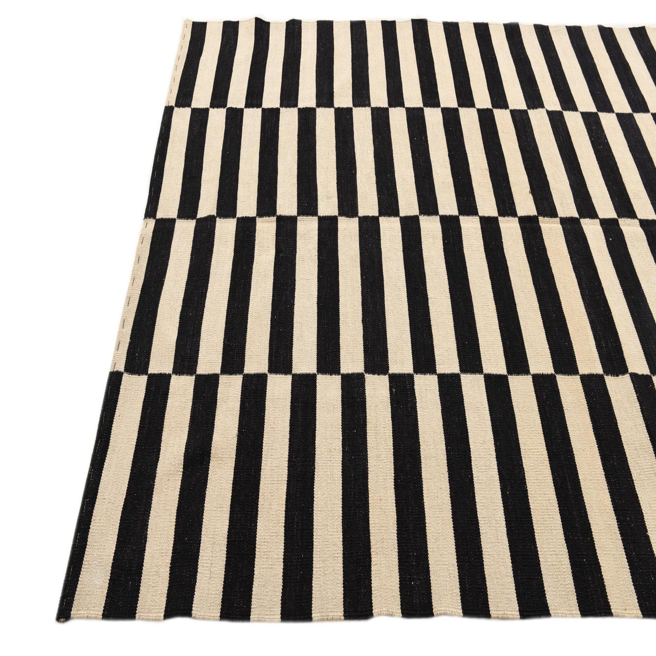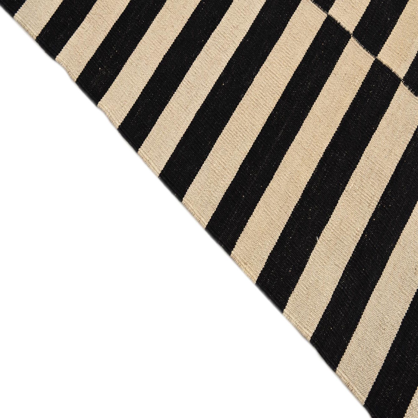 Bold black and crisp white form a graphic, stripe-and-block pattern across a kilim-style flatweave. Narrow horizontal bands are stacked into vertical columns, creating a rhythmic, structured layout that reads modern and tailored. The hand-woven wool construction yields a low-profile, slightly textured surface you can feel beneath your feet — firm and tightly woven with subtle irregularities where the weaver’s yarns meet.
