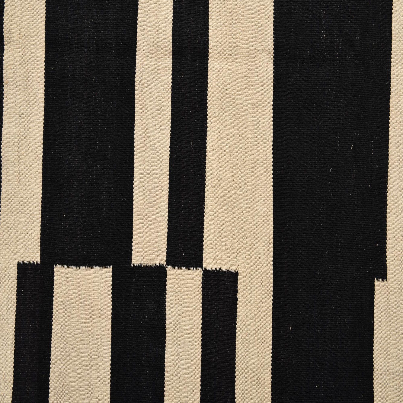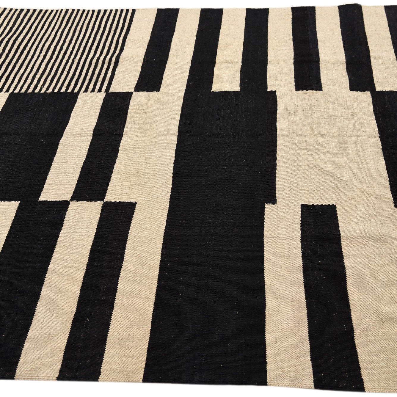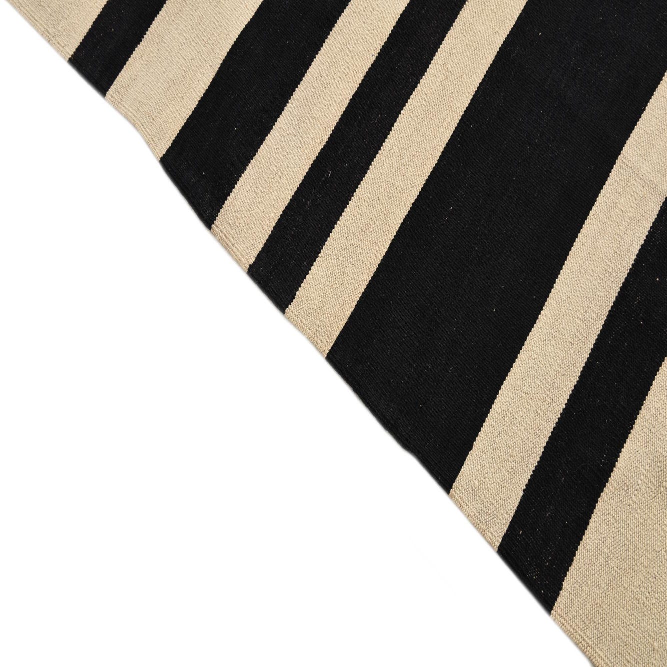 A 5x8 rectangular black and ivory striped flatweave rug, perfect for a modern living room or entryway.