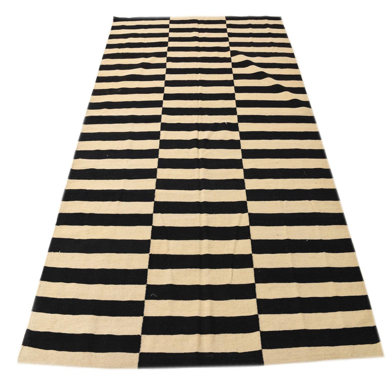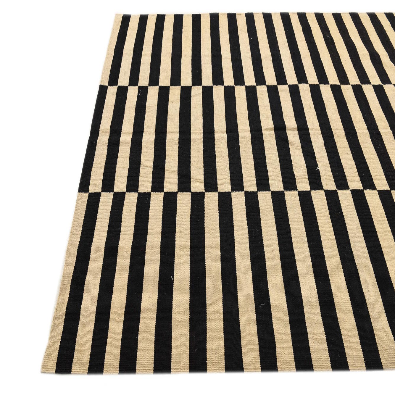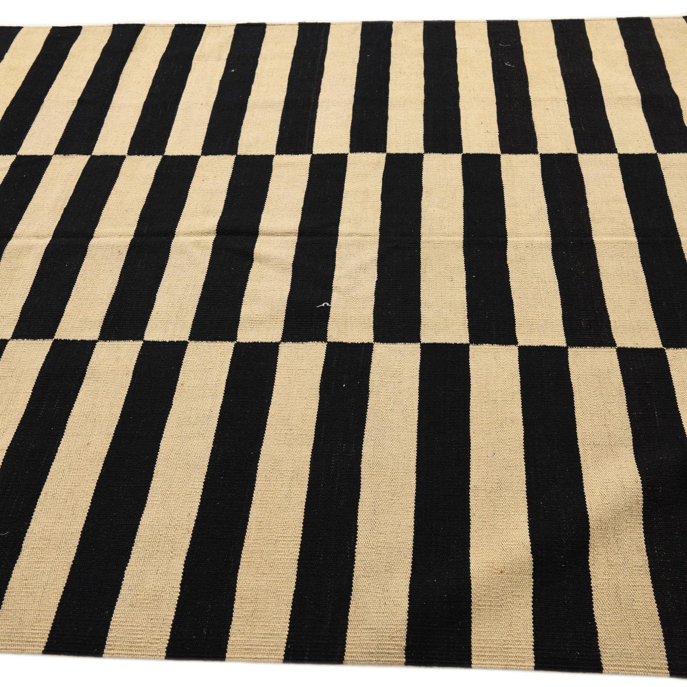 A 5x8 rectangular black and cream flatweave rug with a bold striped and color-blocked pattern, suitable for a modern living room.
