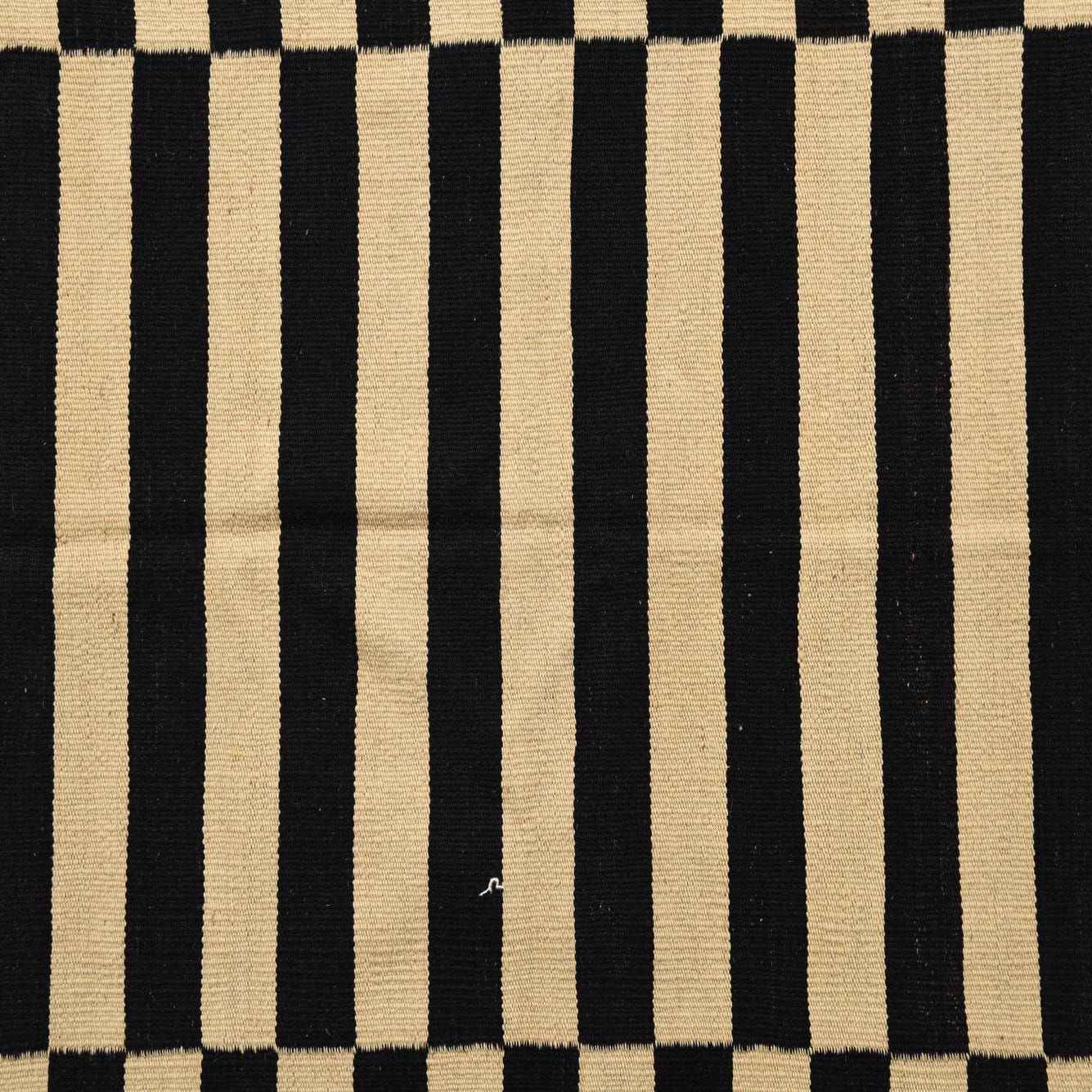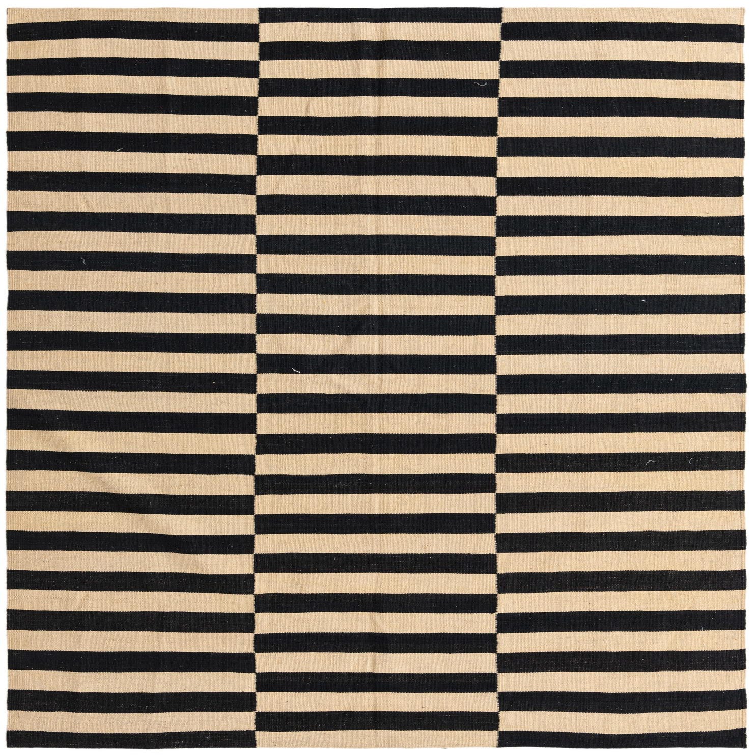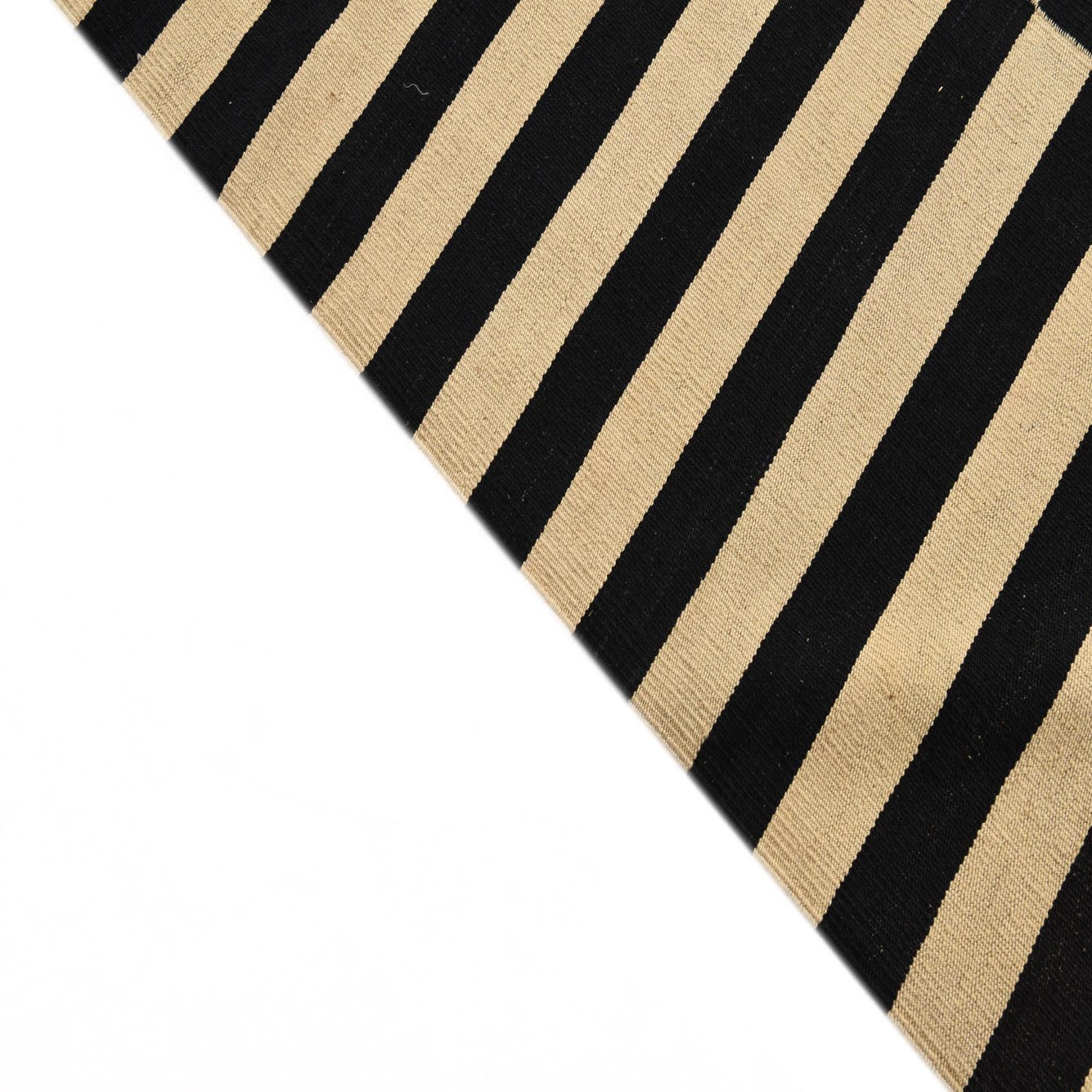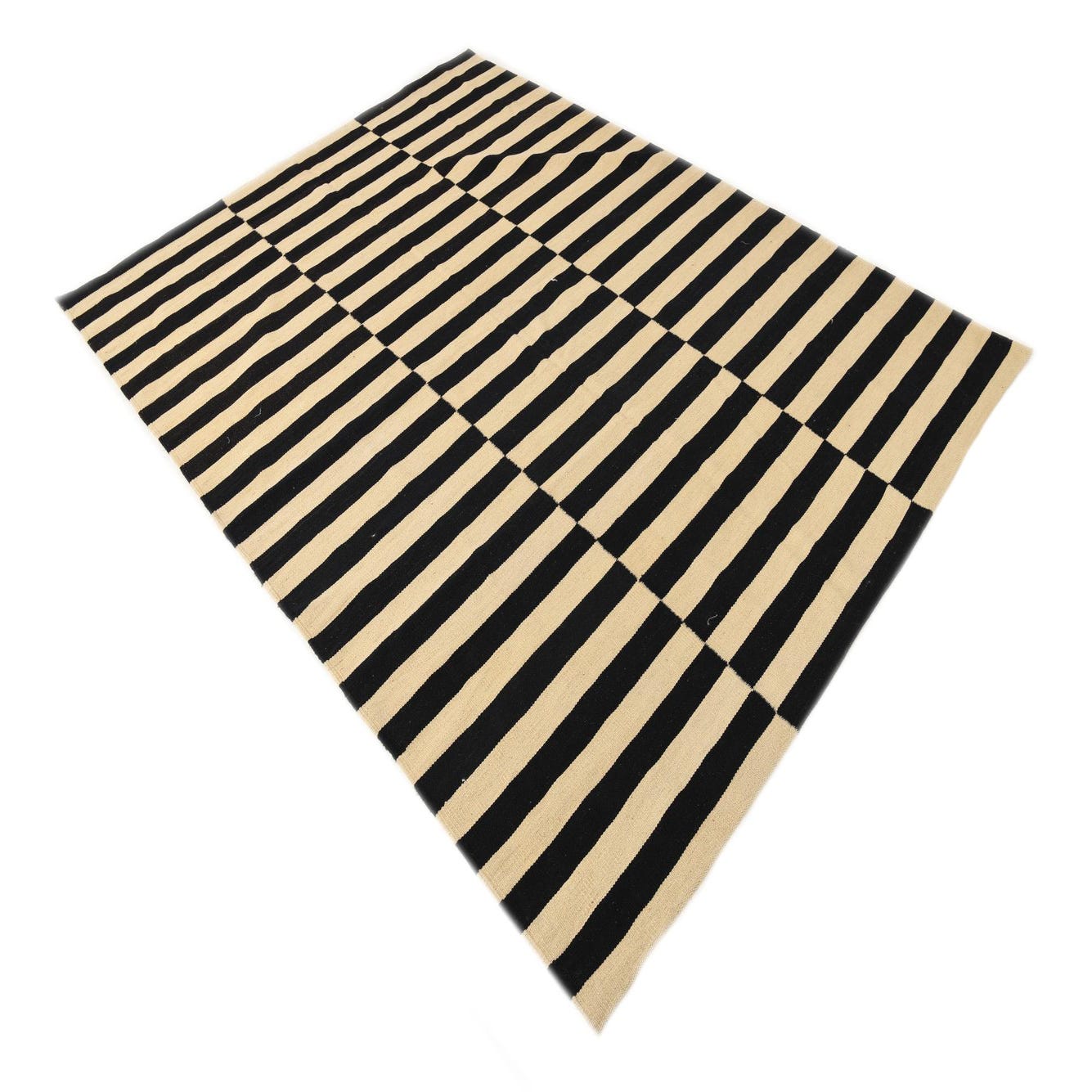 A 5x8 rectangular black and cream flatweave rug with a bold striped and color-blocked pattern, suitable for a modern living room.