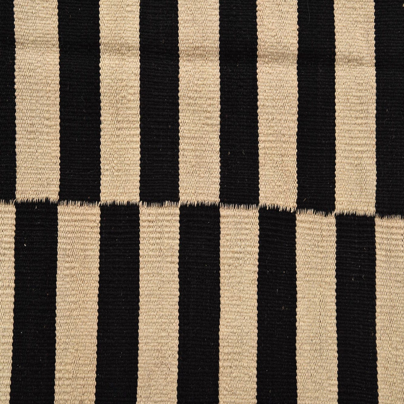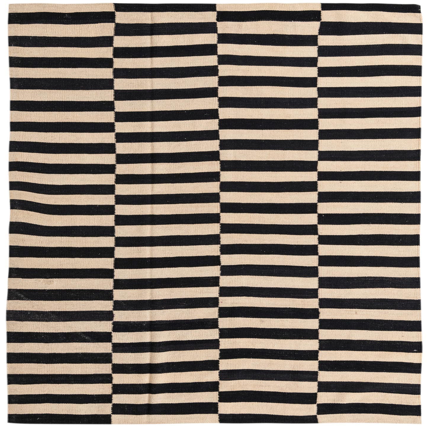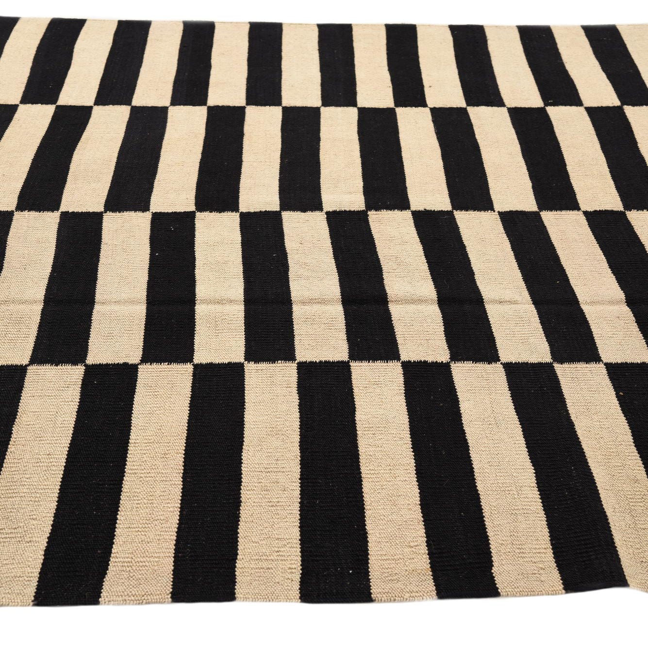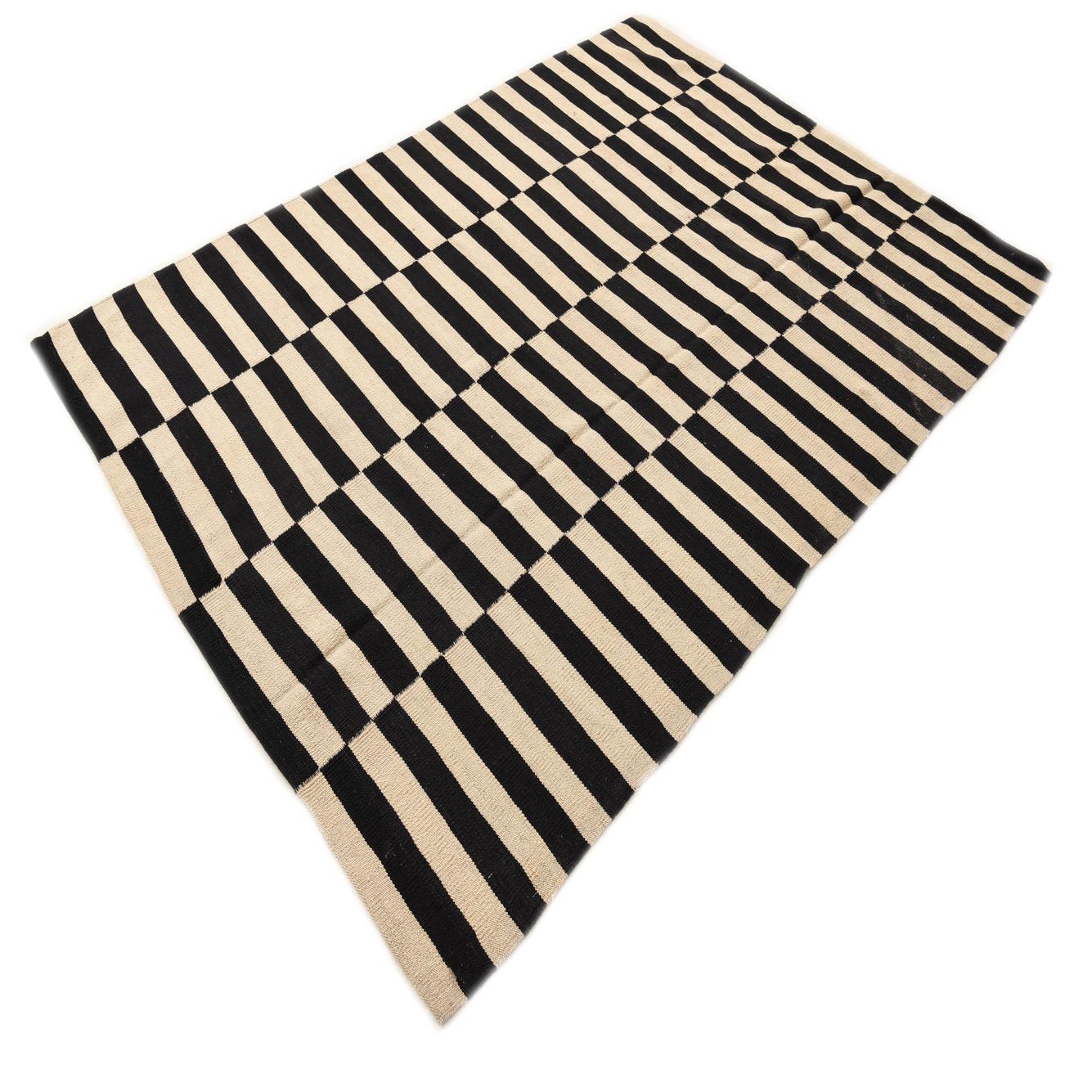 A 5x8 rectangular Kilim Modern rug with a bold black and ivory striped pattern, suitable for a living room.