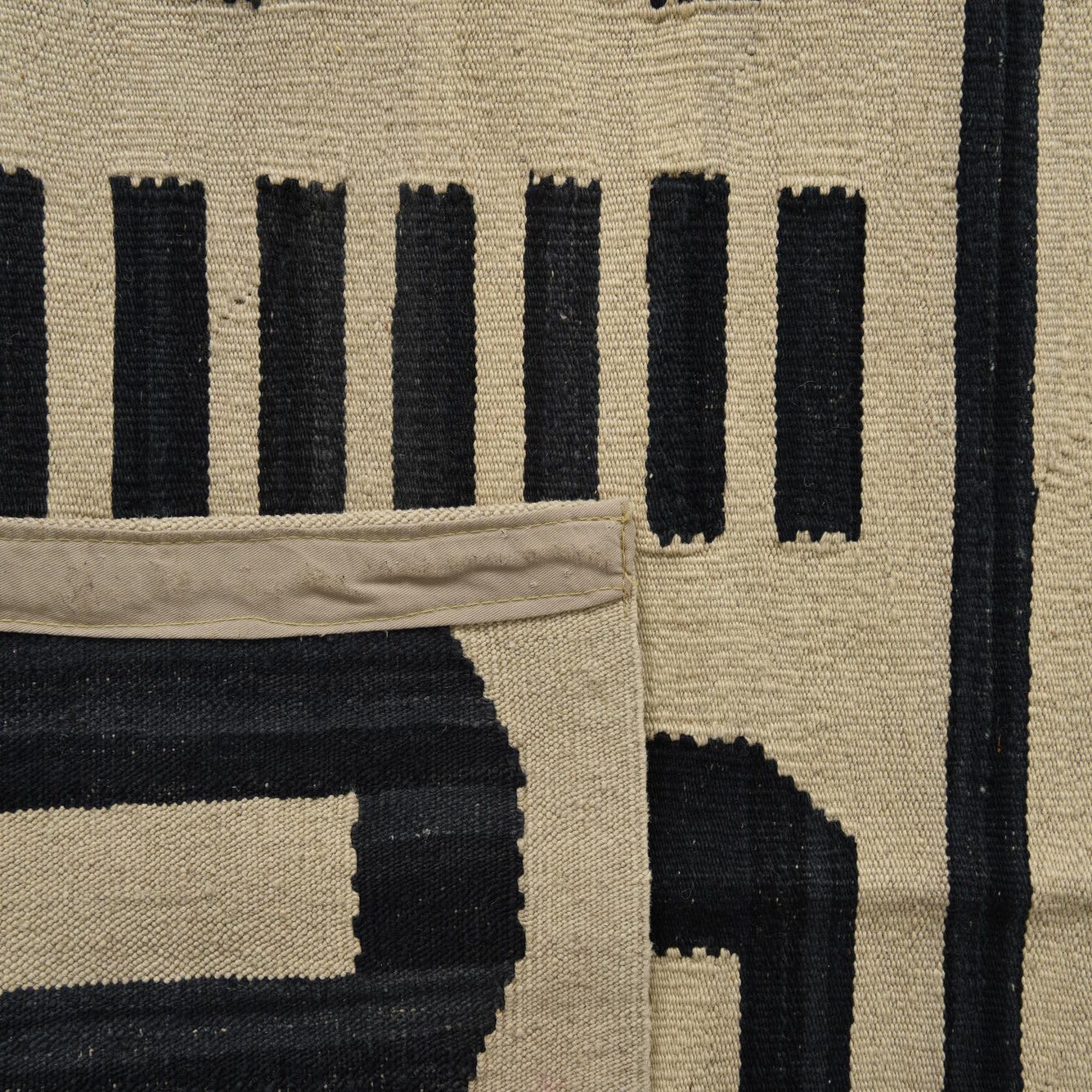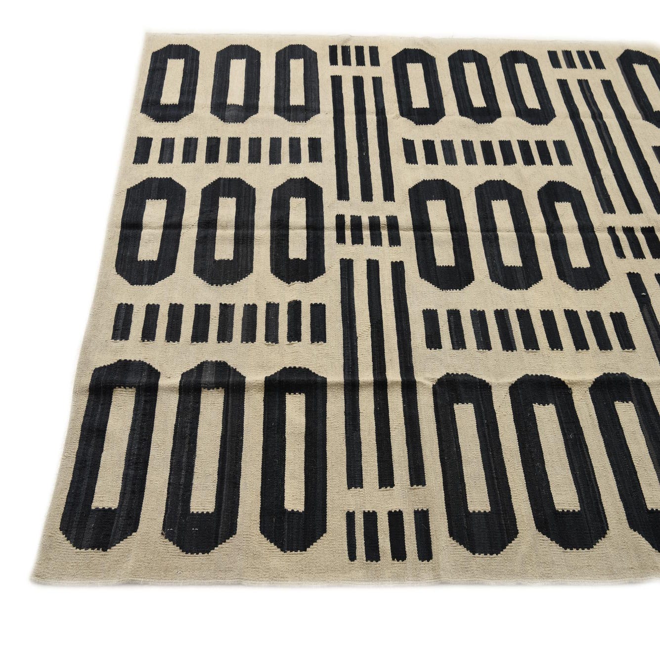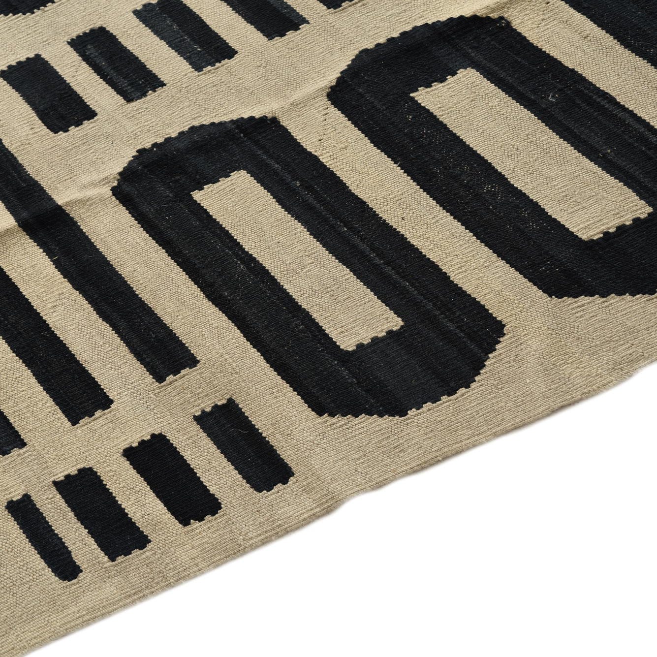 A 5x8 rectangular Kilim Modern wool rug featuring a bold black and cream tribal geometric pattern with abstract shapes and lines.