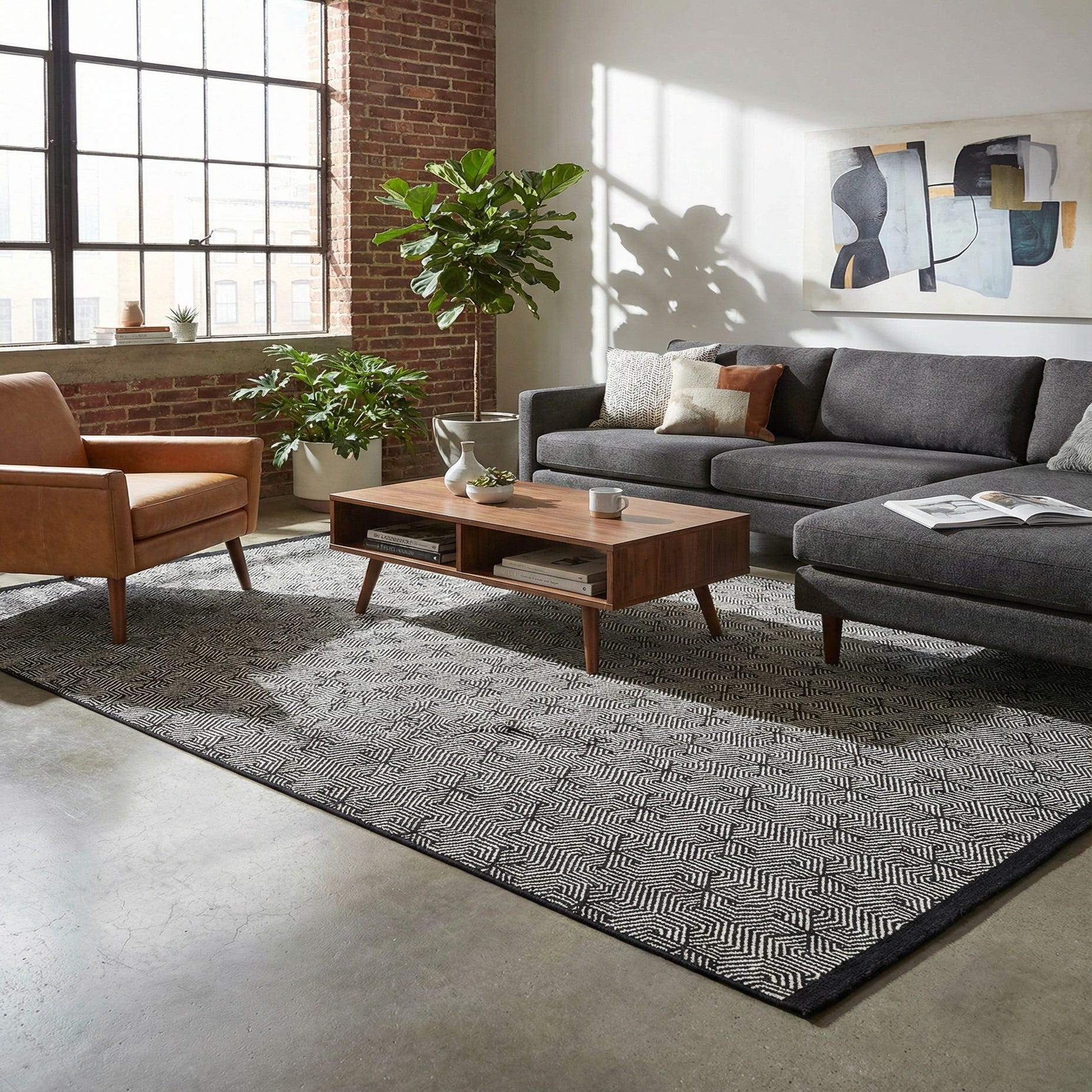 A 5x8 rectangular black and white modern area rug with an abstract geometric pattern, suitable for a living room.