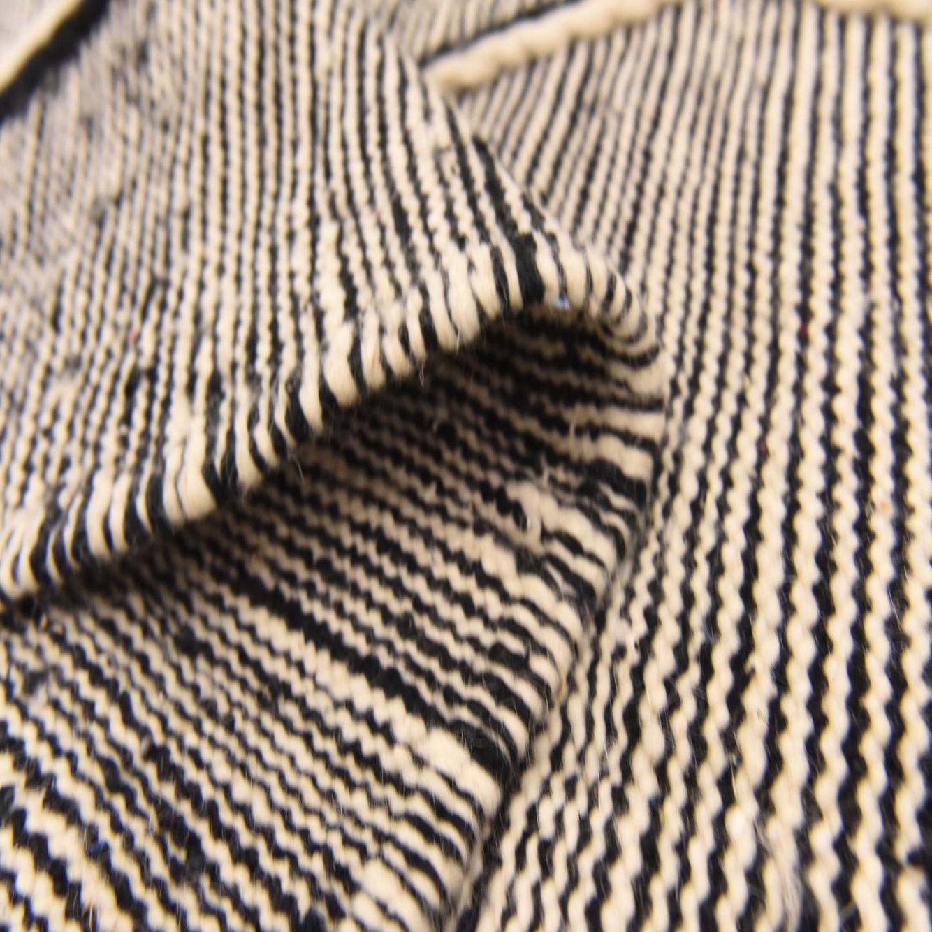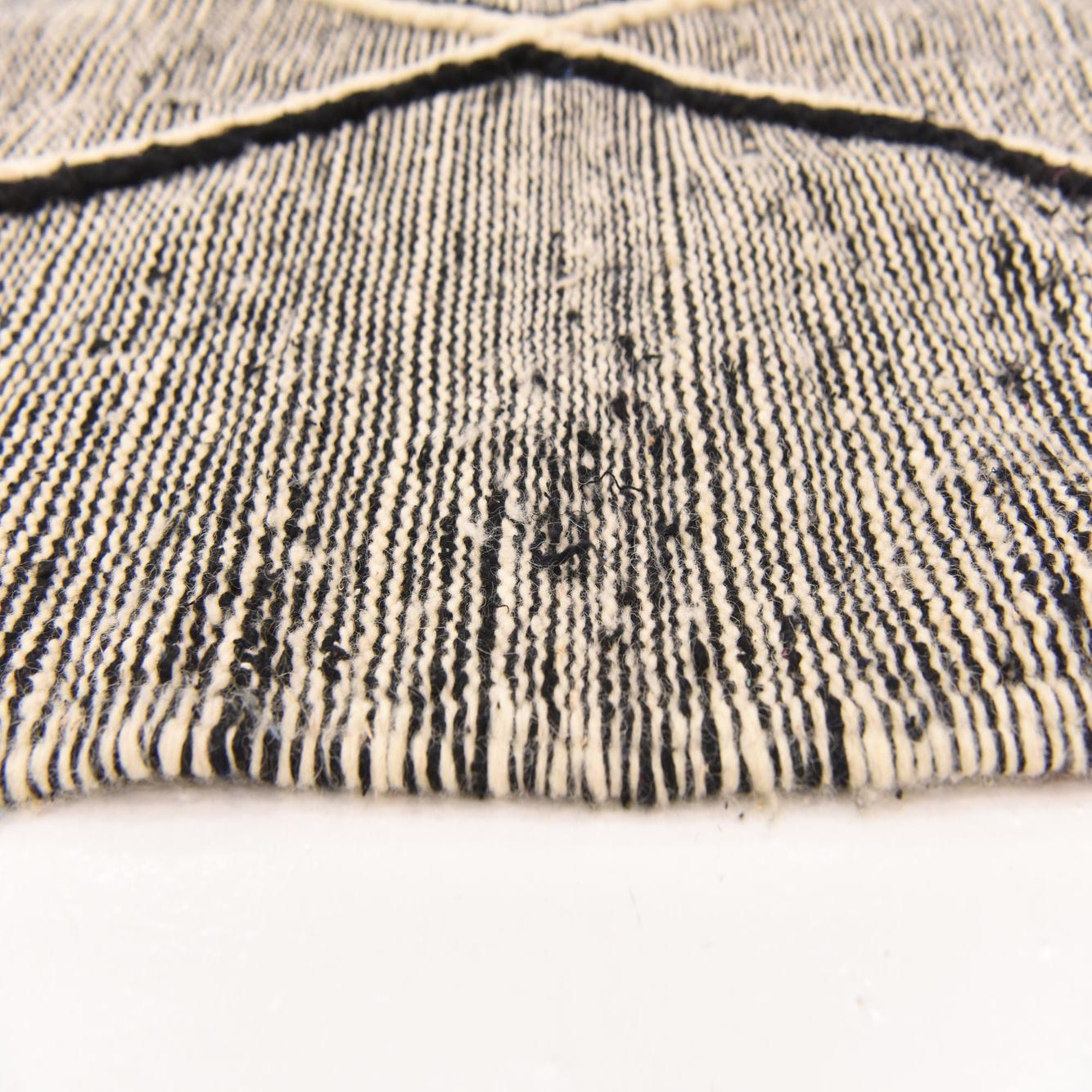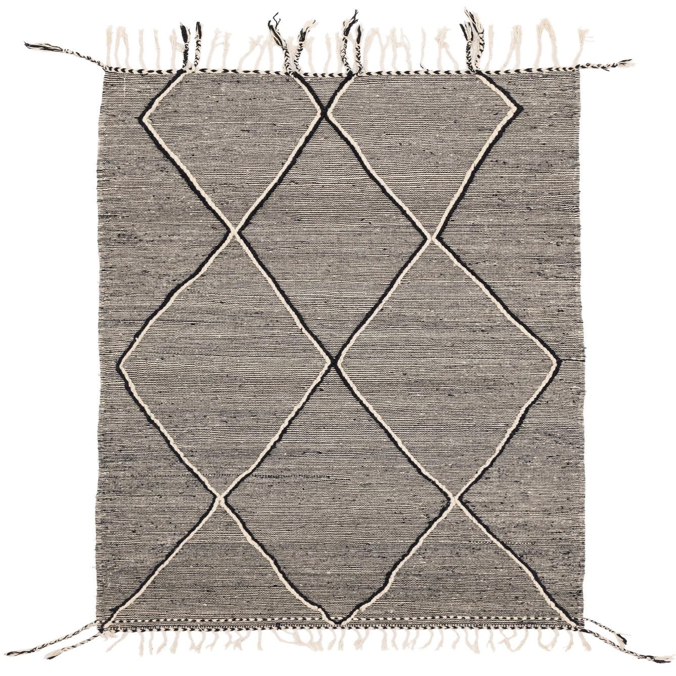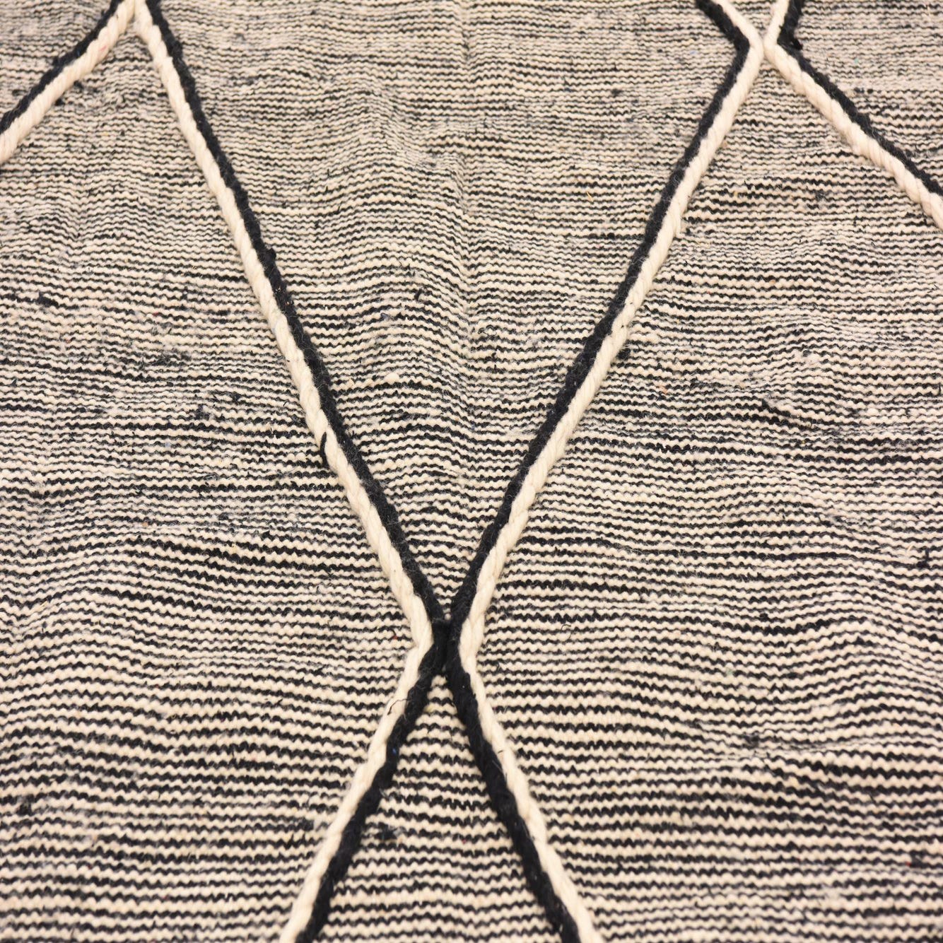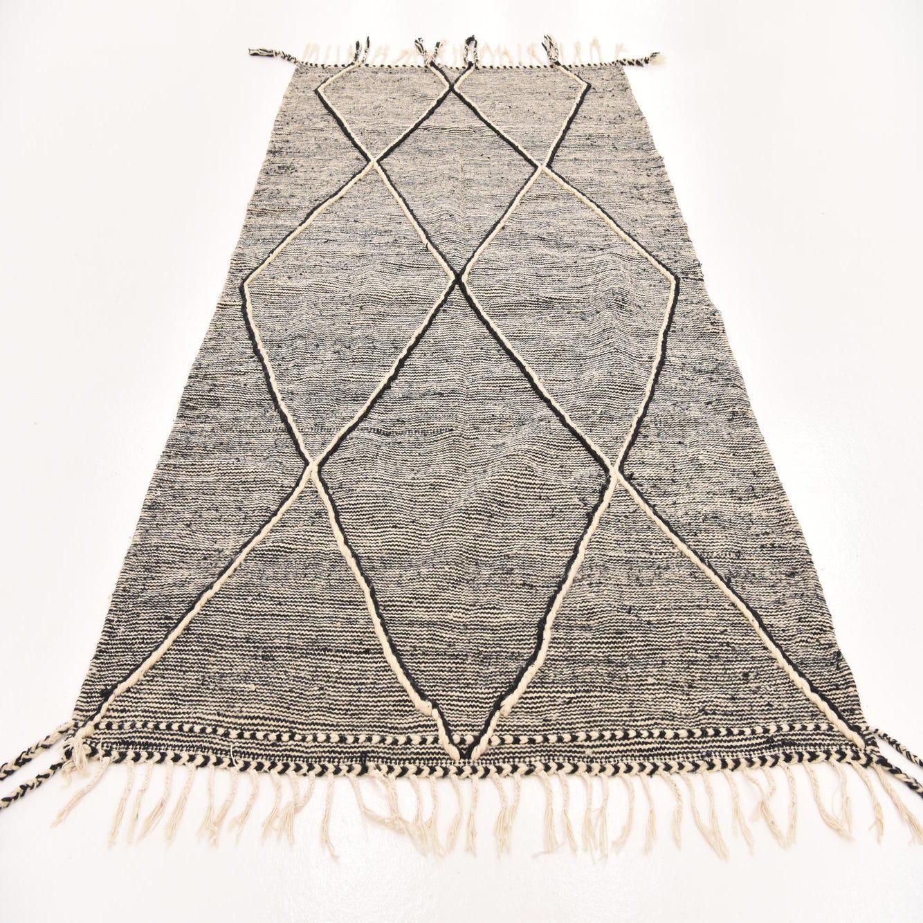 Versatile in its simplicity, this Moroccan rug would complement minimalist interiors, adding depth and interest without overwhelming the space. It can also serve as a grounding element in eclectic settings, marrying well with global-inspired decor, and would be equally at home in a modern farmhouse aesthetic, where its texture and pattern could add warmth and character. The black and white palette makes it easy to integrate into existing color schemes, ensuring that this rug can serve as a statement piece or a harmonious addition to a room.