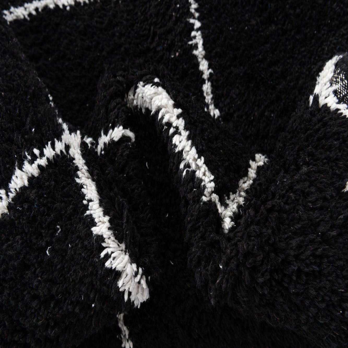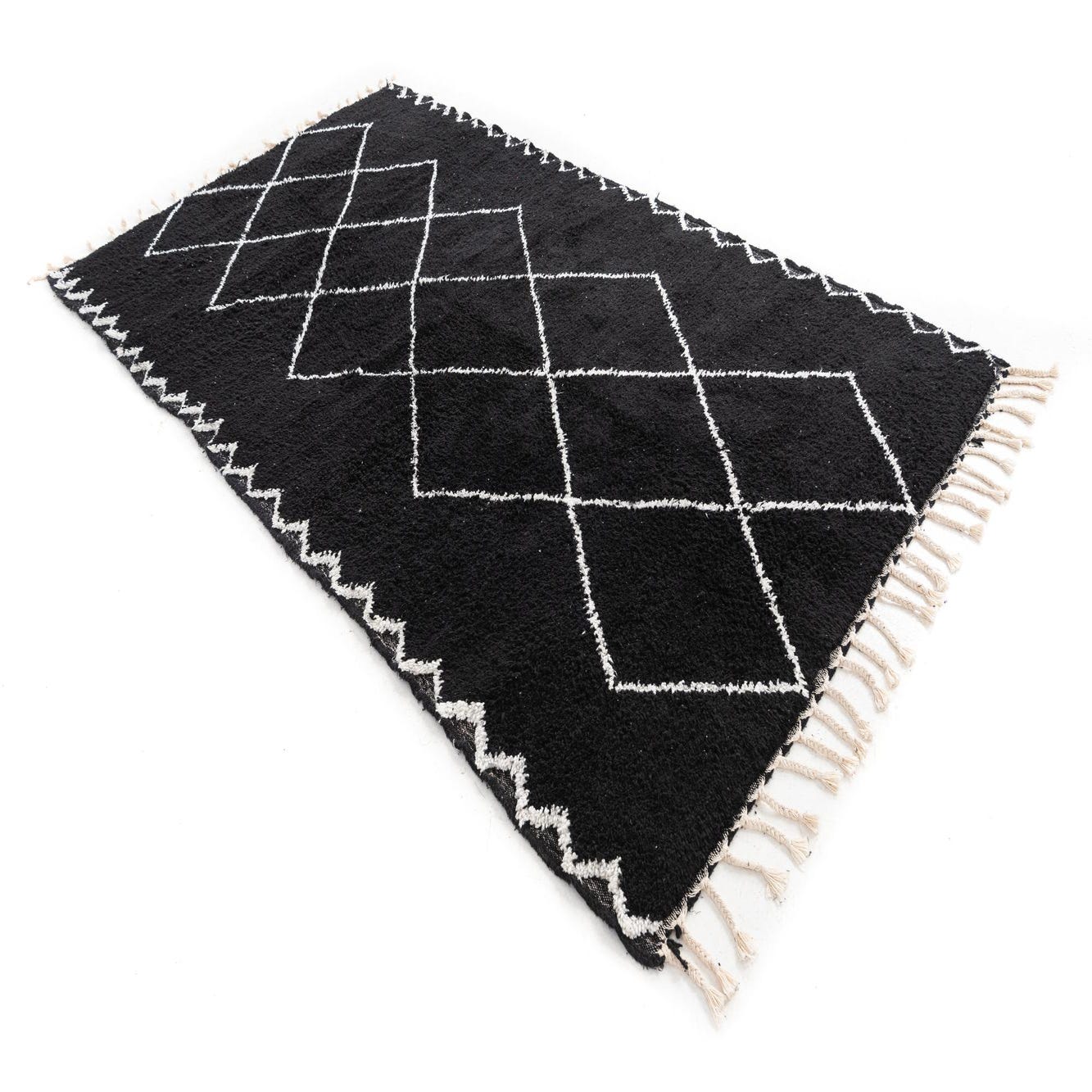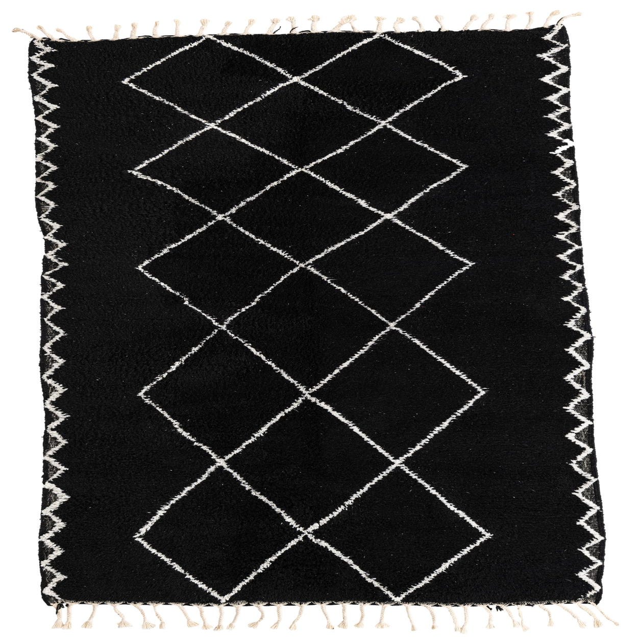 This Moroccan collection rug is a hand-knotted piece crafted from 100% wool, offering a tactile and enduring addition to any room. At a versatile size of 5x8 feet, this rug showcases a bold black and white color scheme, imbued with the classic simplicity of the monochromatic palette. The pattern features a series of interconnected diamonds that create a dynamic and geometric visual appeal.