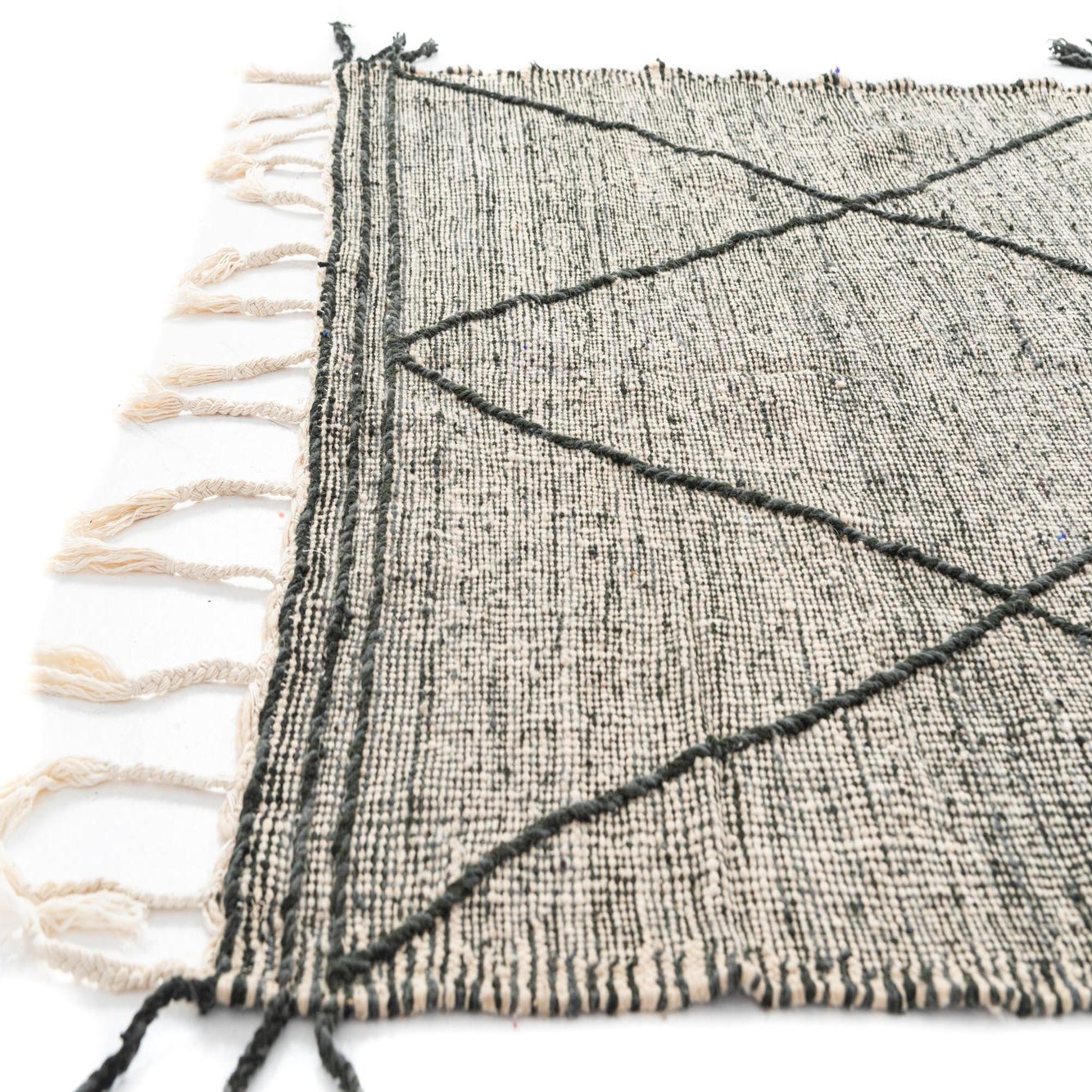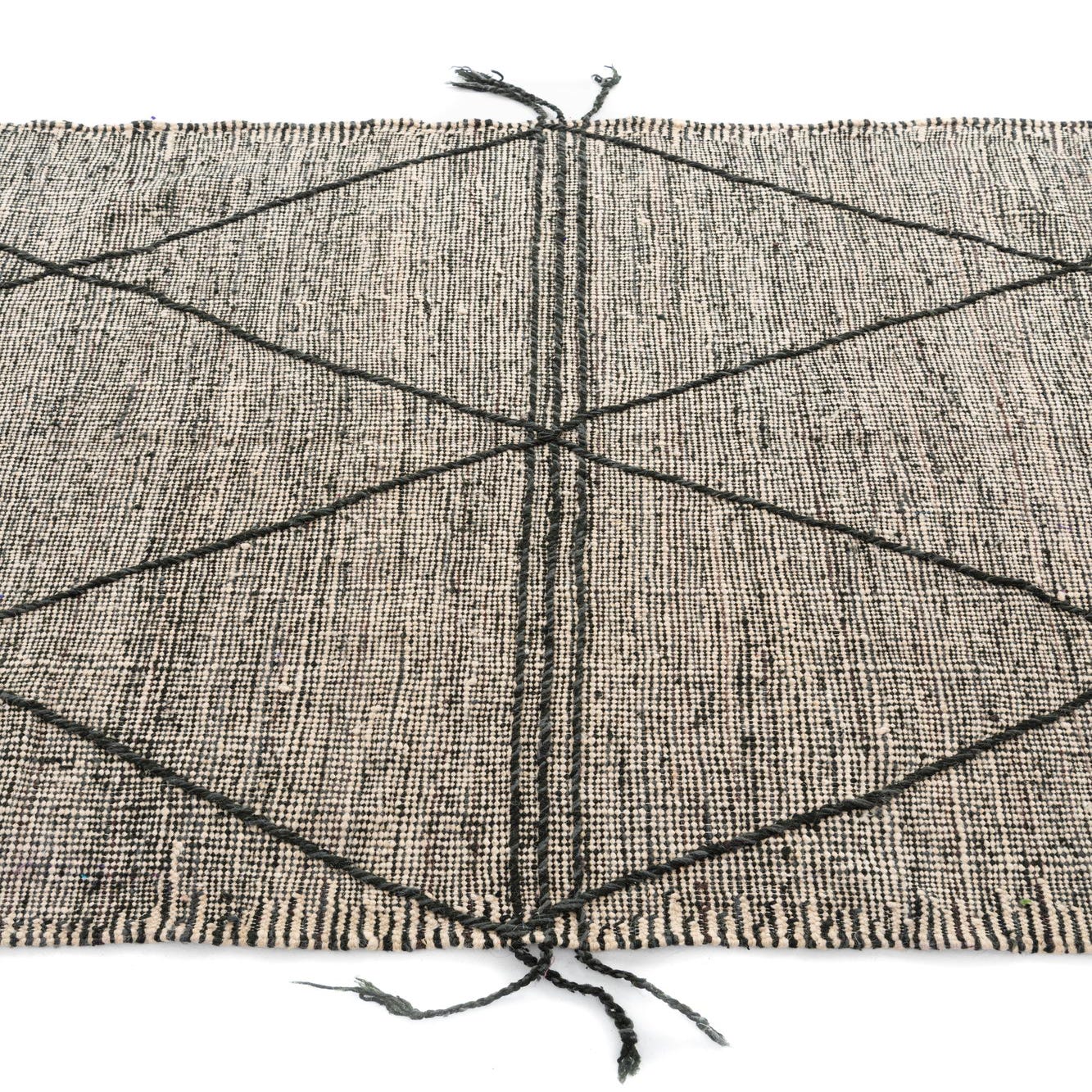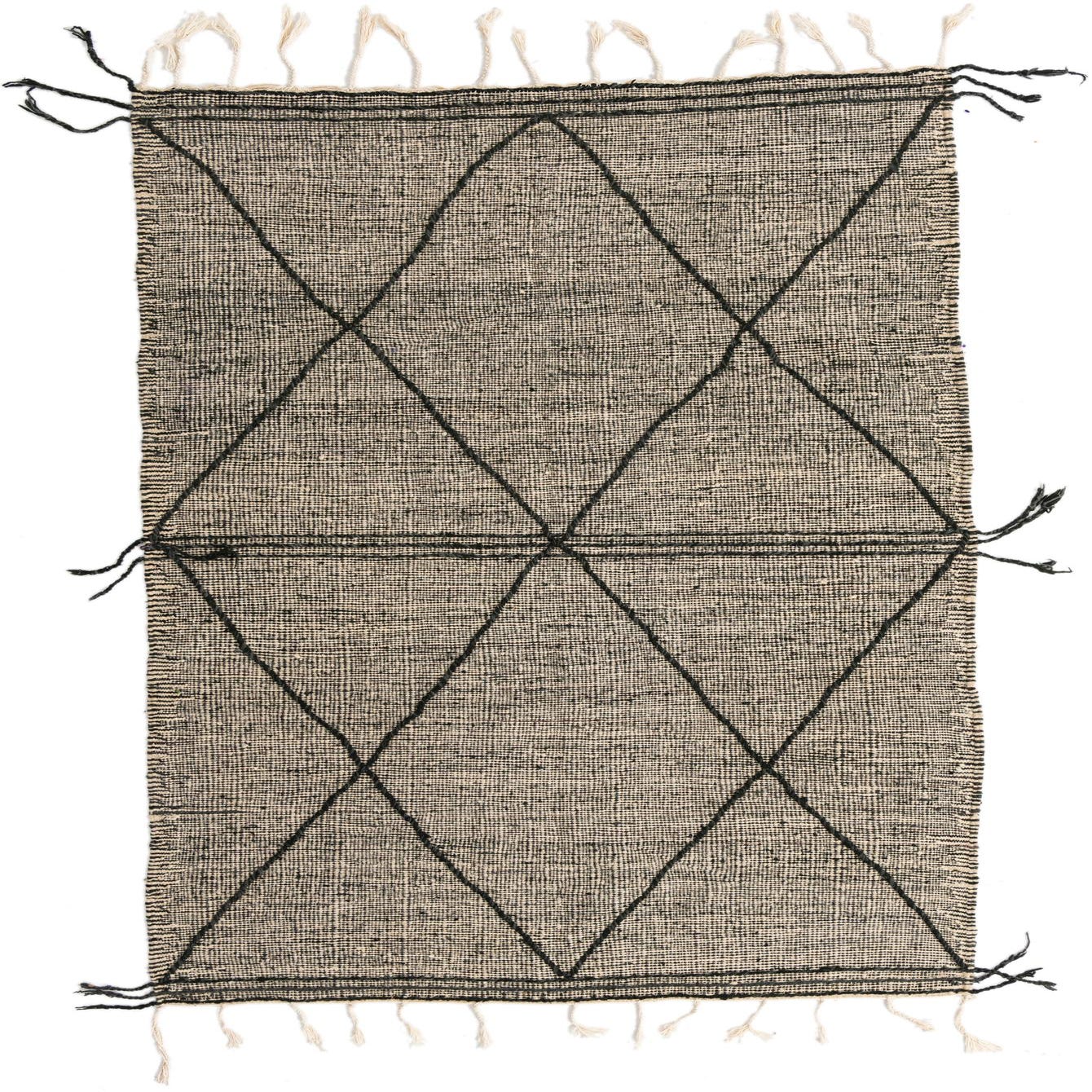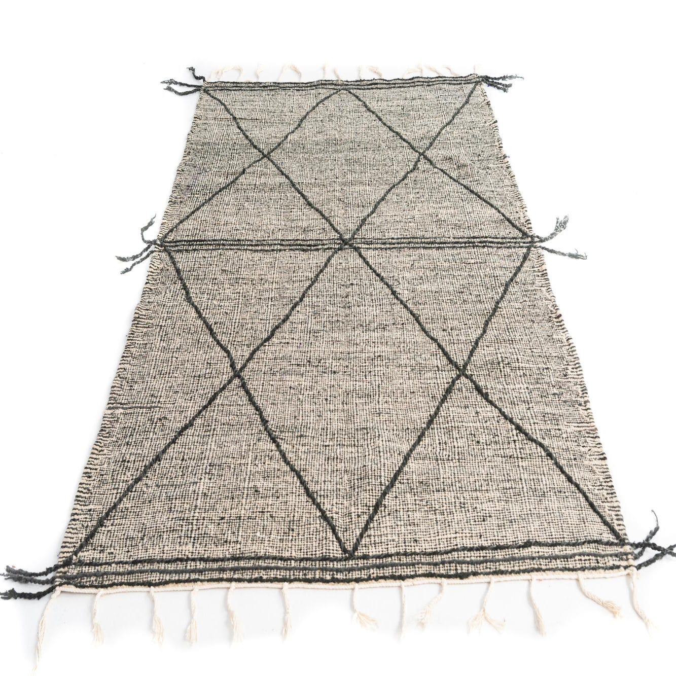 A 5x8 rectangular Moroccan shag rug with a tribal black diamond pattern on a cream background, featuring fringe.