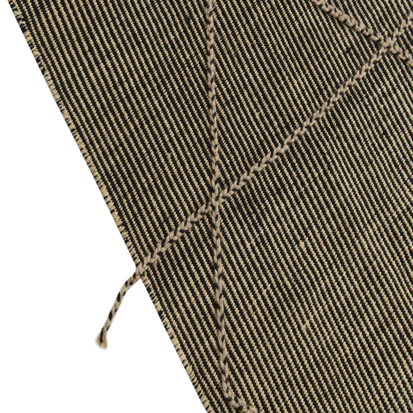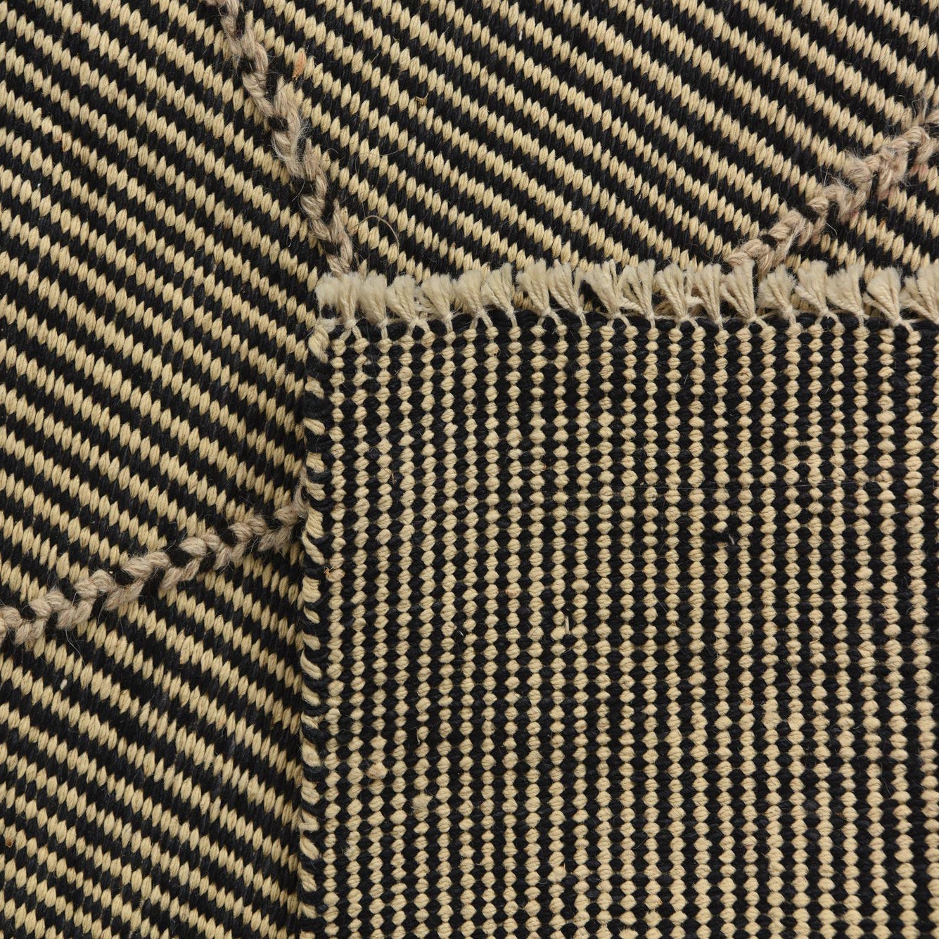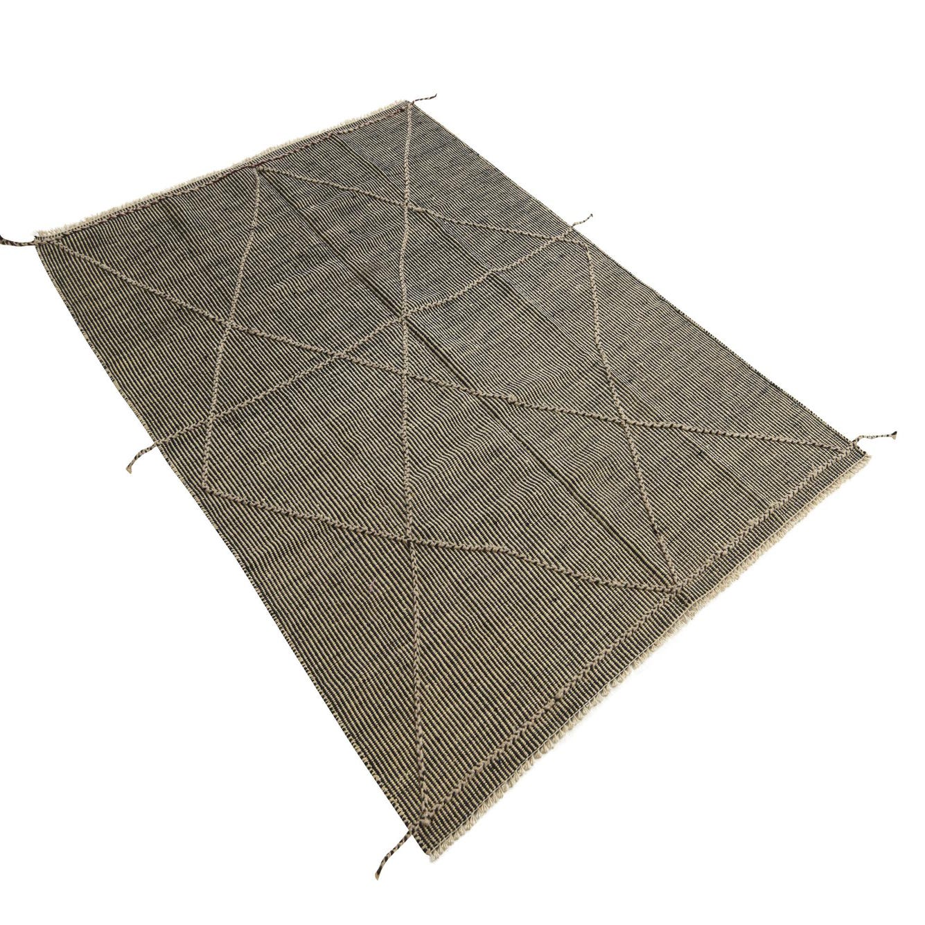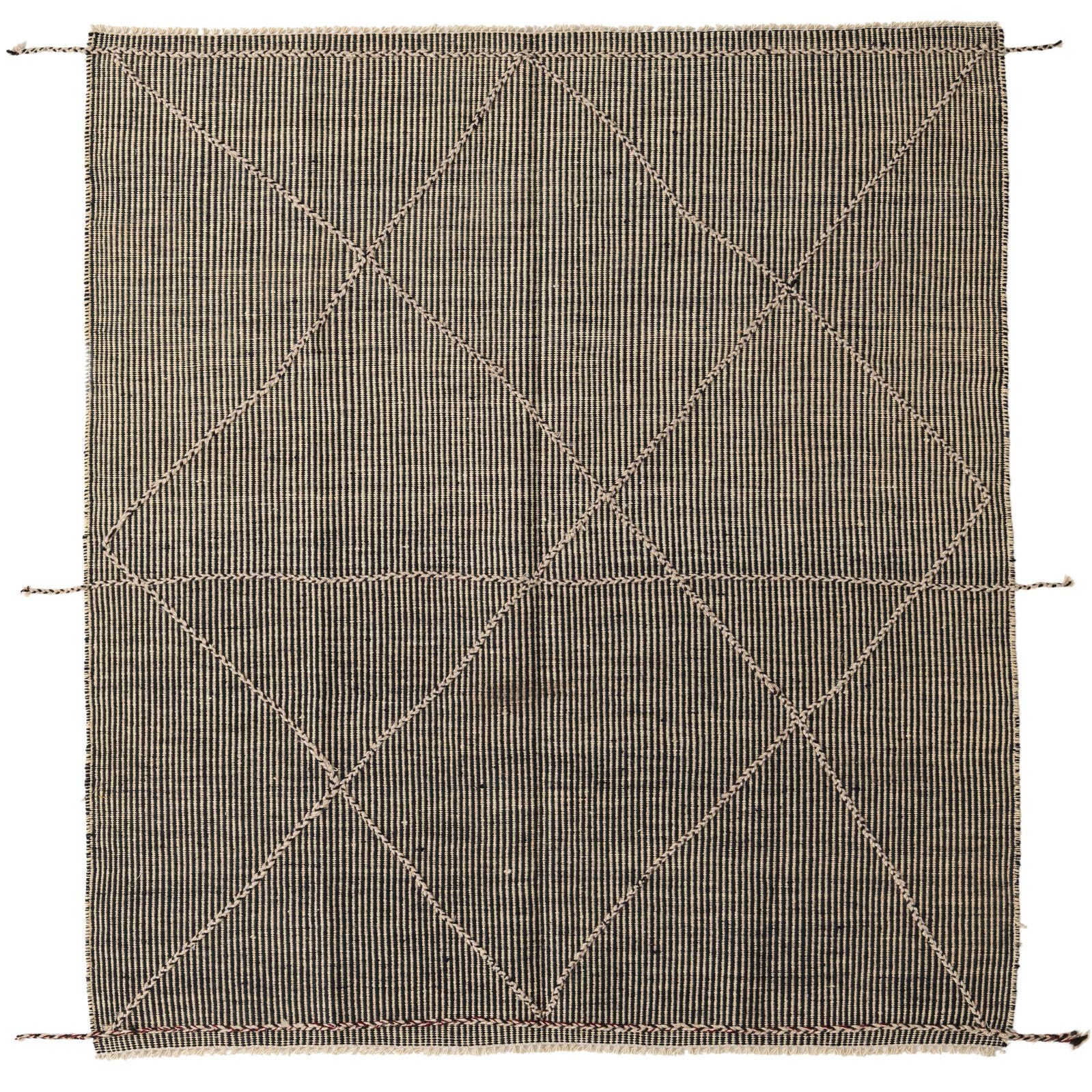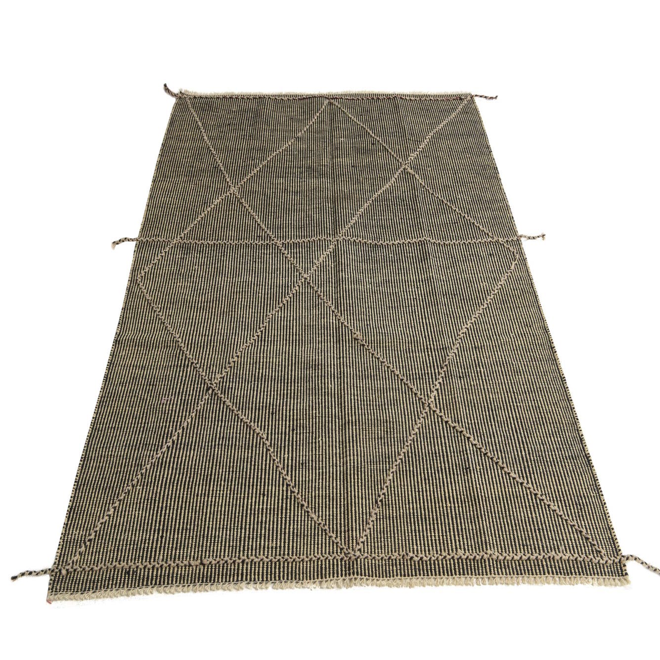 A 5x8 rectangular black and cream tribal wool shag rug with a modern geometric diamond pattern.