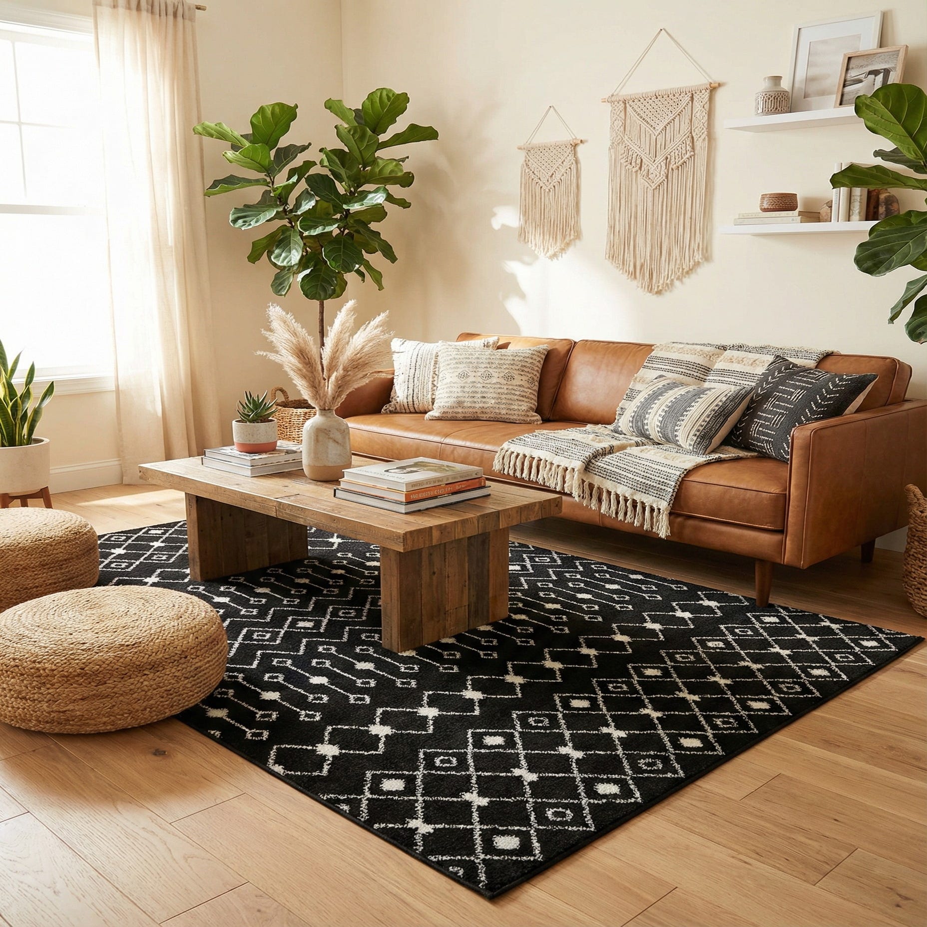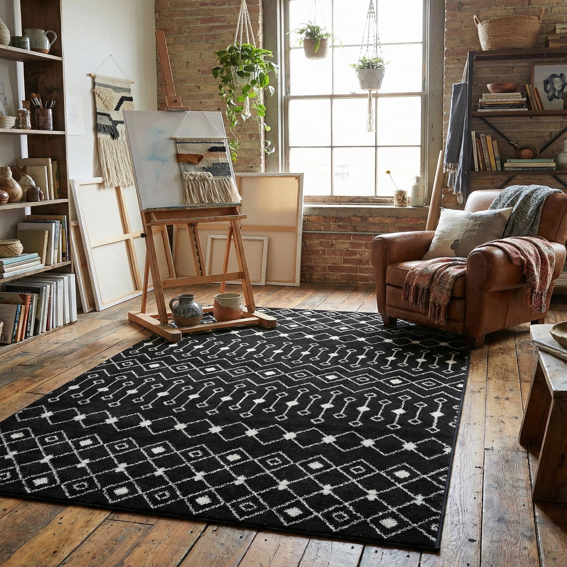 This rug works well in contemporary and transitional rooms where a high-contrast anchor is needed: place it beneath a sofa and coffee table in a monochrome living room, layer it under a simple wood dining table to add pattern without overpowering the space, or use it to ground a home office or entryway for visual interest. It also pairs nicely with natural woods, matte black metal accents, and warm neutral textiles for a balanced, modern-bohemian look.