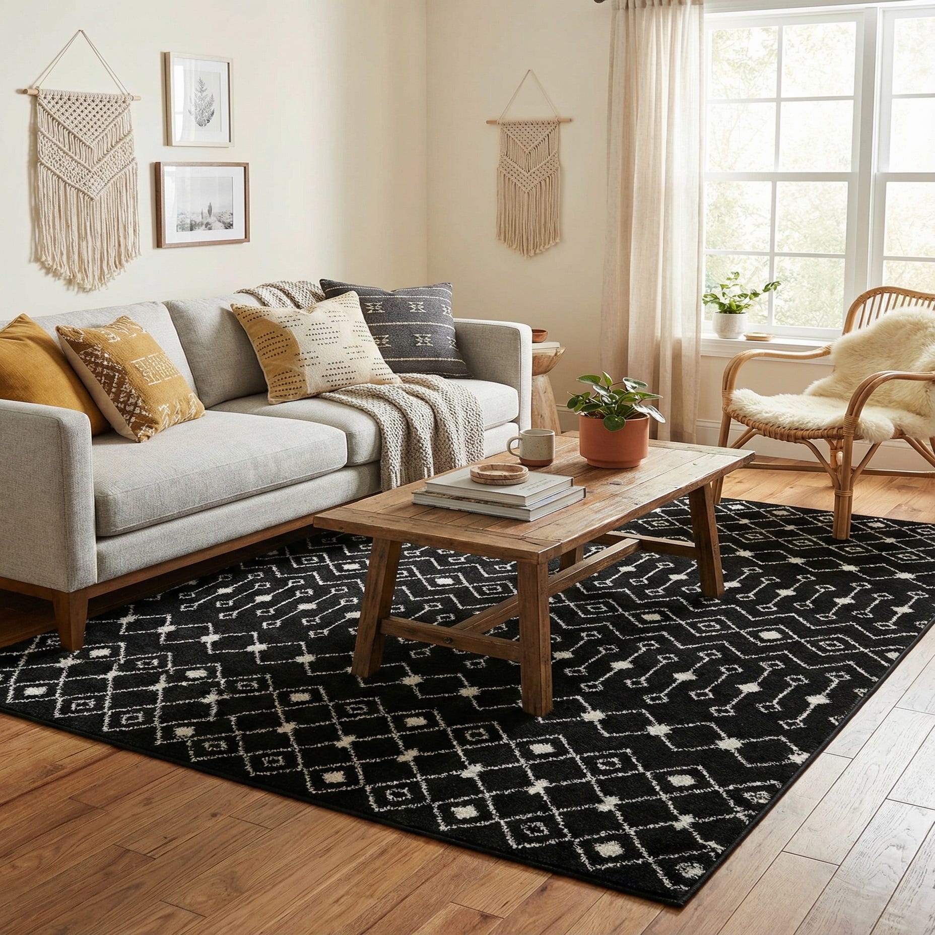 This rug works well in contemporary and transitional rooms where a high-contrast anchor is needed: place it beneath a sofa and coffee table in a monochrome living room, layer it under a simple wood dining table to add pattern without overpowering the space, or use it to ground a home office or entryway for visual interest. It also pairs nicely with natural woods, matte black metal accents, and warm neutral textiles for a balanced, modern-bohemian look.