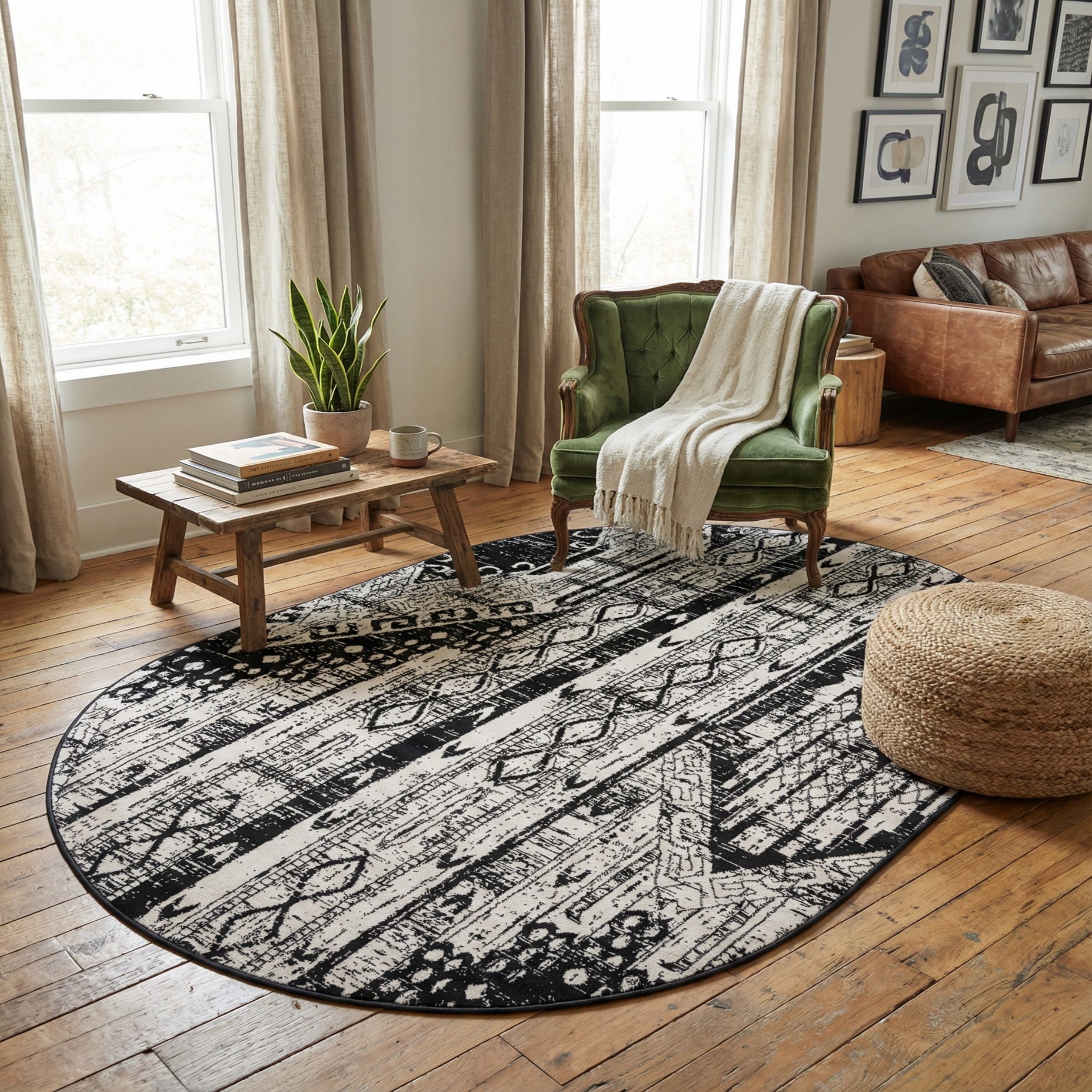 Machine made from 85% polypropylene and 15% polyester, the rug has a low-pile, slightly cushioned surface with a smooth hand that holds crisp pattern detail. The oval silhouette softens the geometry, making it a natural choice to define an entryway, tuck under a round dining table, or ground a seating area in a small living room. It pairs well with light or black-stained woods, monochrome décor, and layered textures—suiting contemporary, Scandinavian, boho, or modern farmhouse schemes that favor contrast and clean lines.