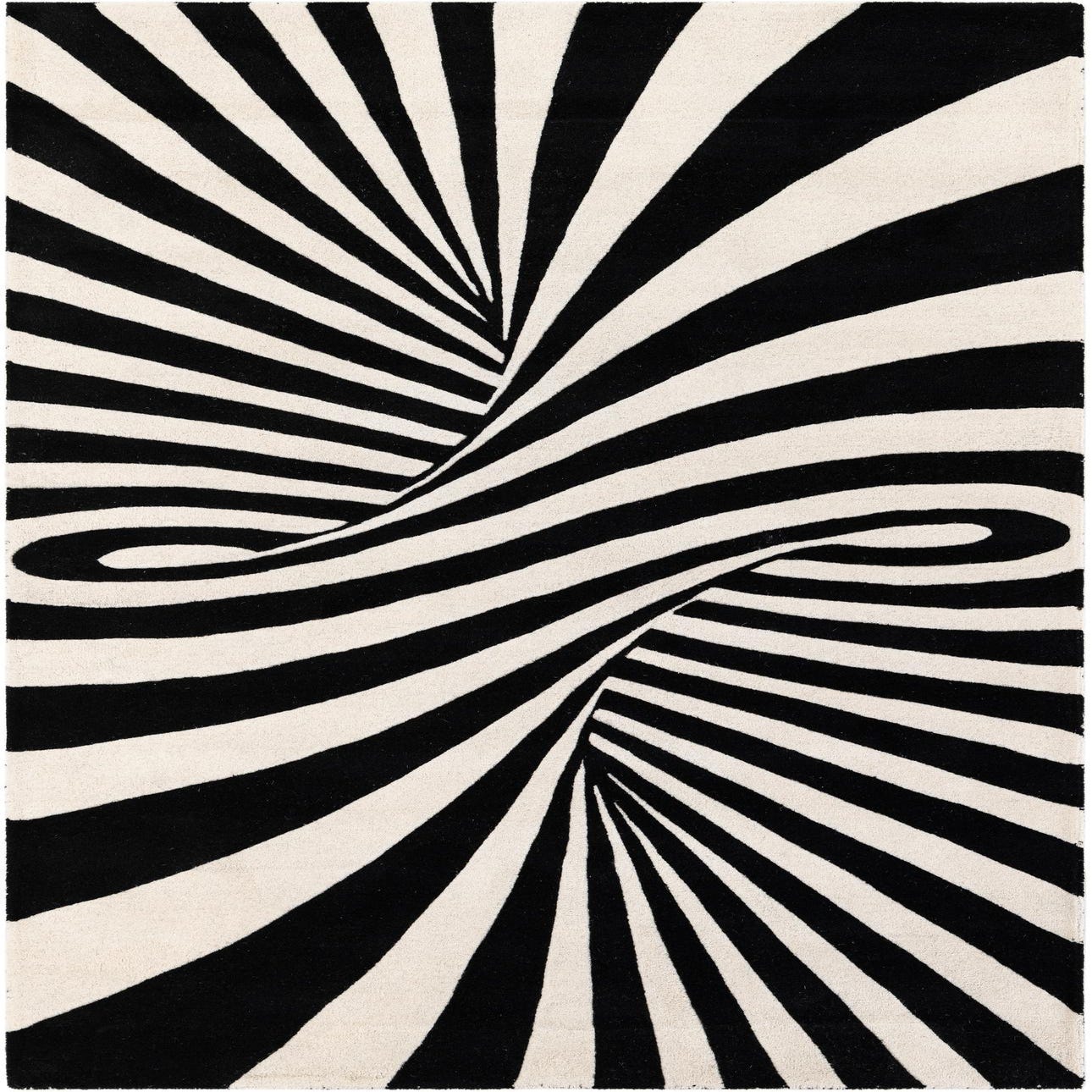 A 5x8 rectangular black and white modern rug with an optical illusion vortex pattern, ideal for a living room.