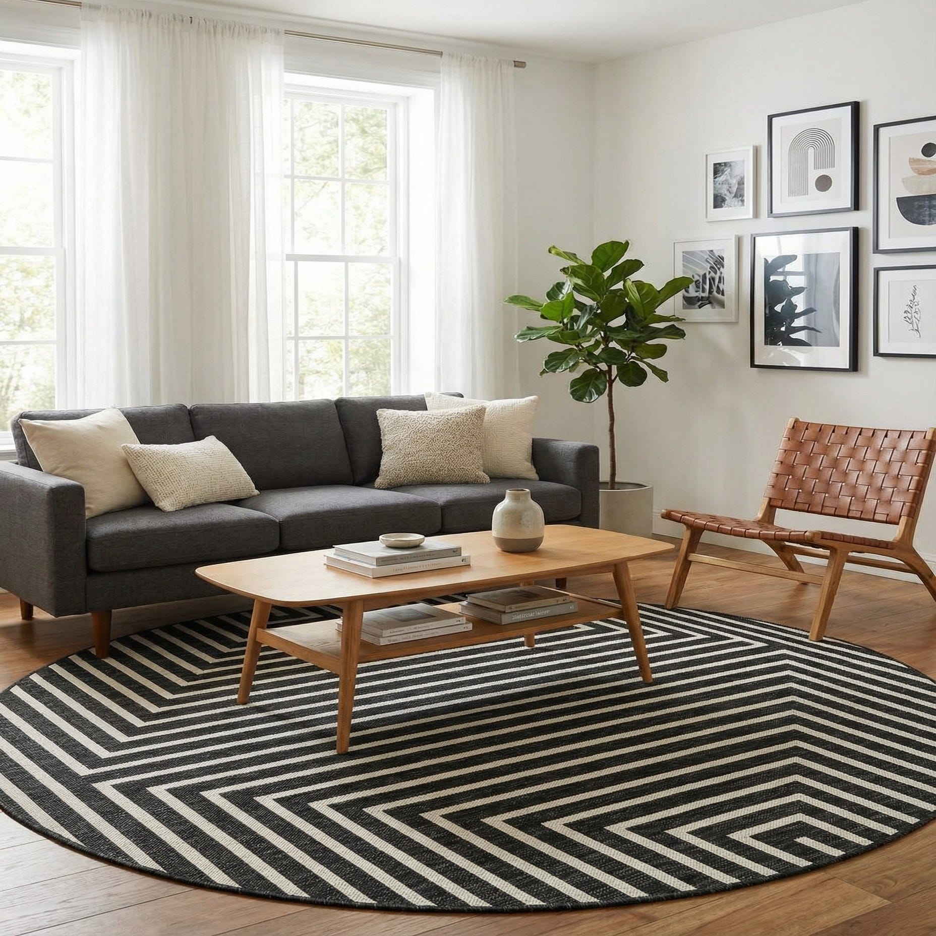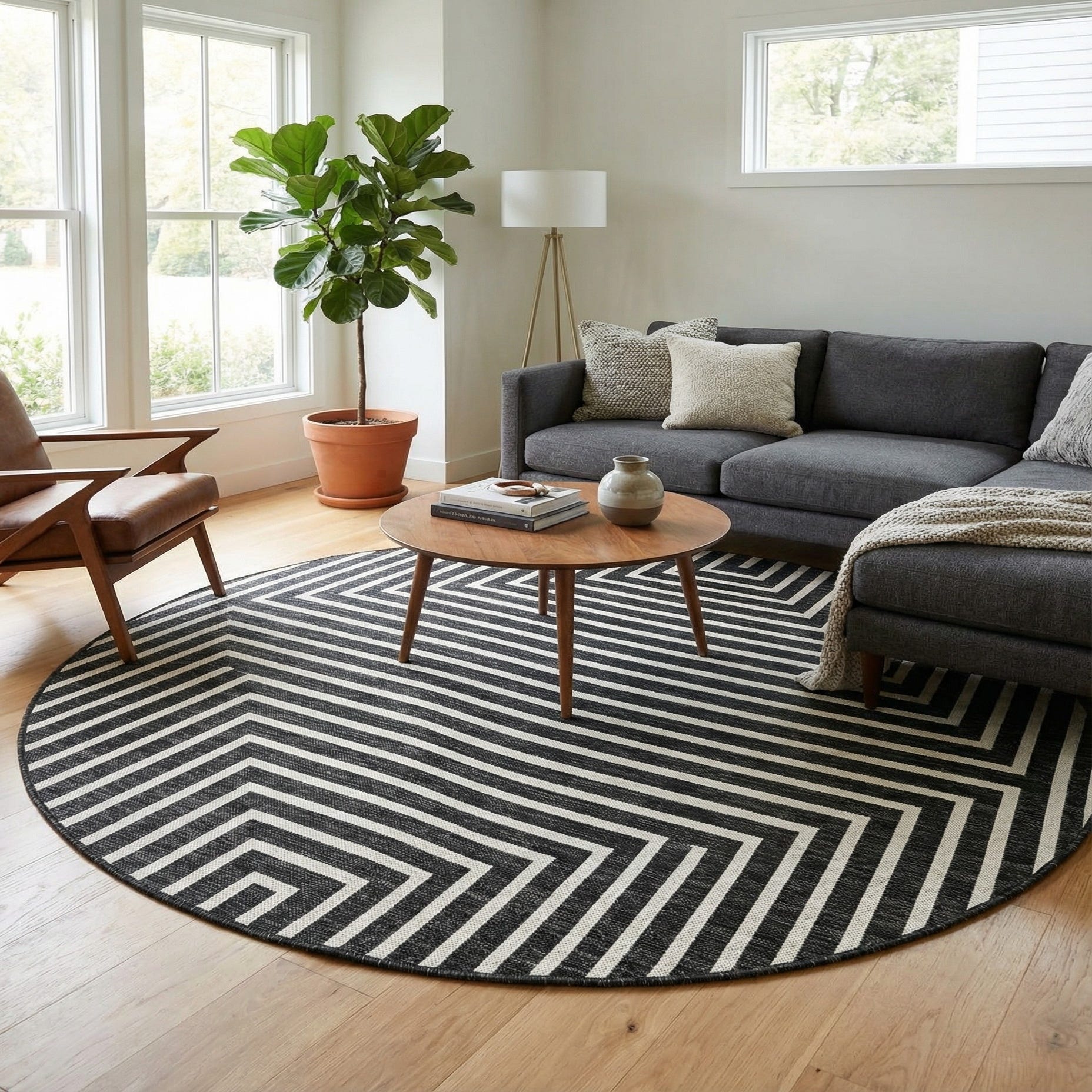 A 6' round black and white geometric rug with a bold, modern striped pattern, suitable for indoor or outdoor use.