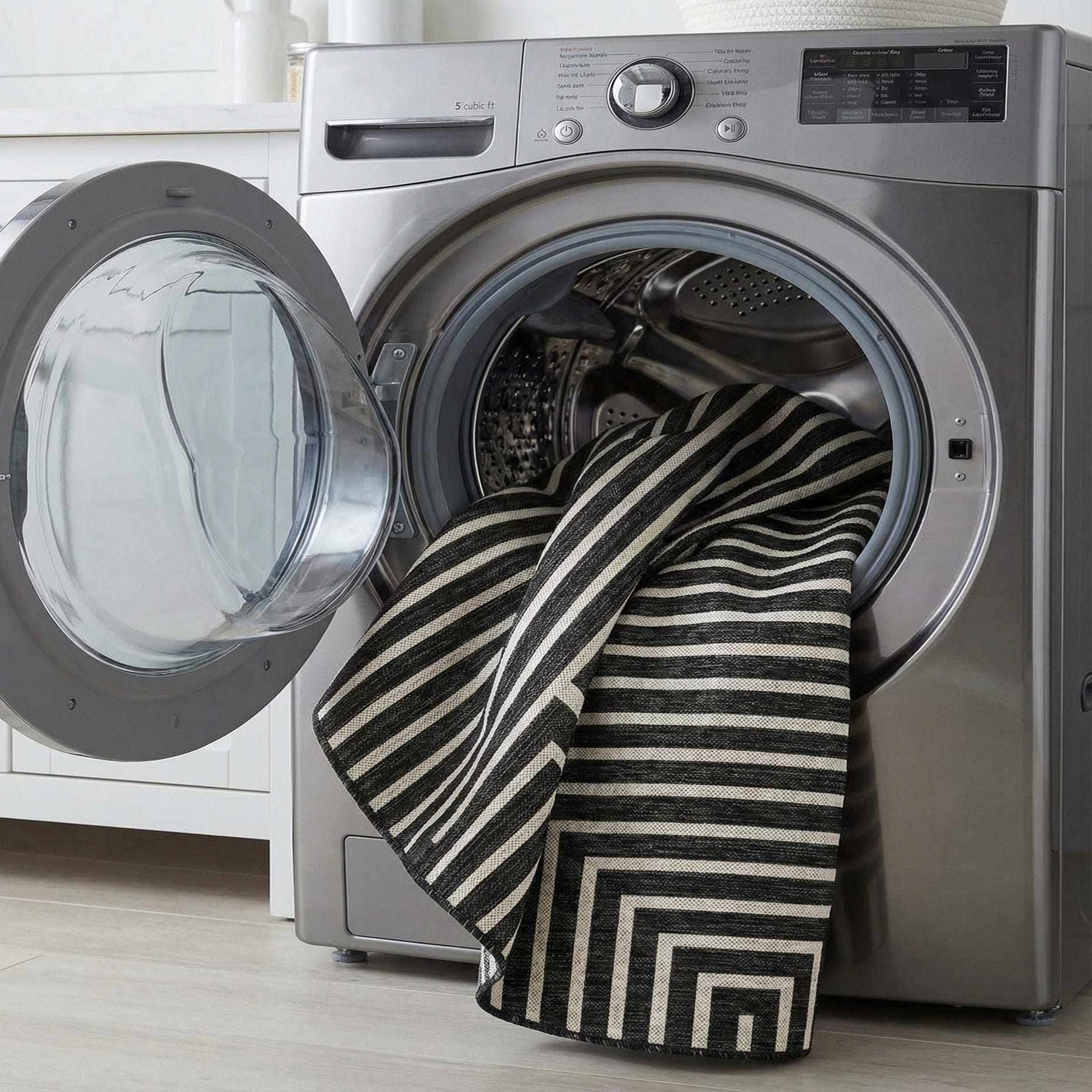 Ideal for tying together a contemporary outdoor living area, this piece can also be utilized under a dining set or in a high-traffic indoor space like a mudroom or entryway. The graphic nature of the pattern makes it a versatile choice that complements minimalist and modern aesthetic environments, as well as provides a dramatic statement in more neutral settings.