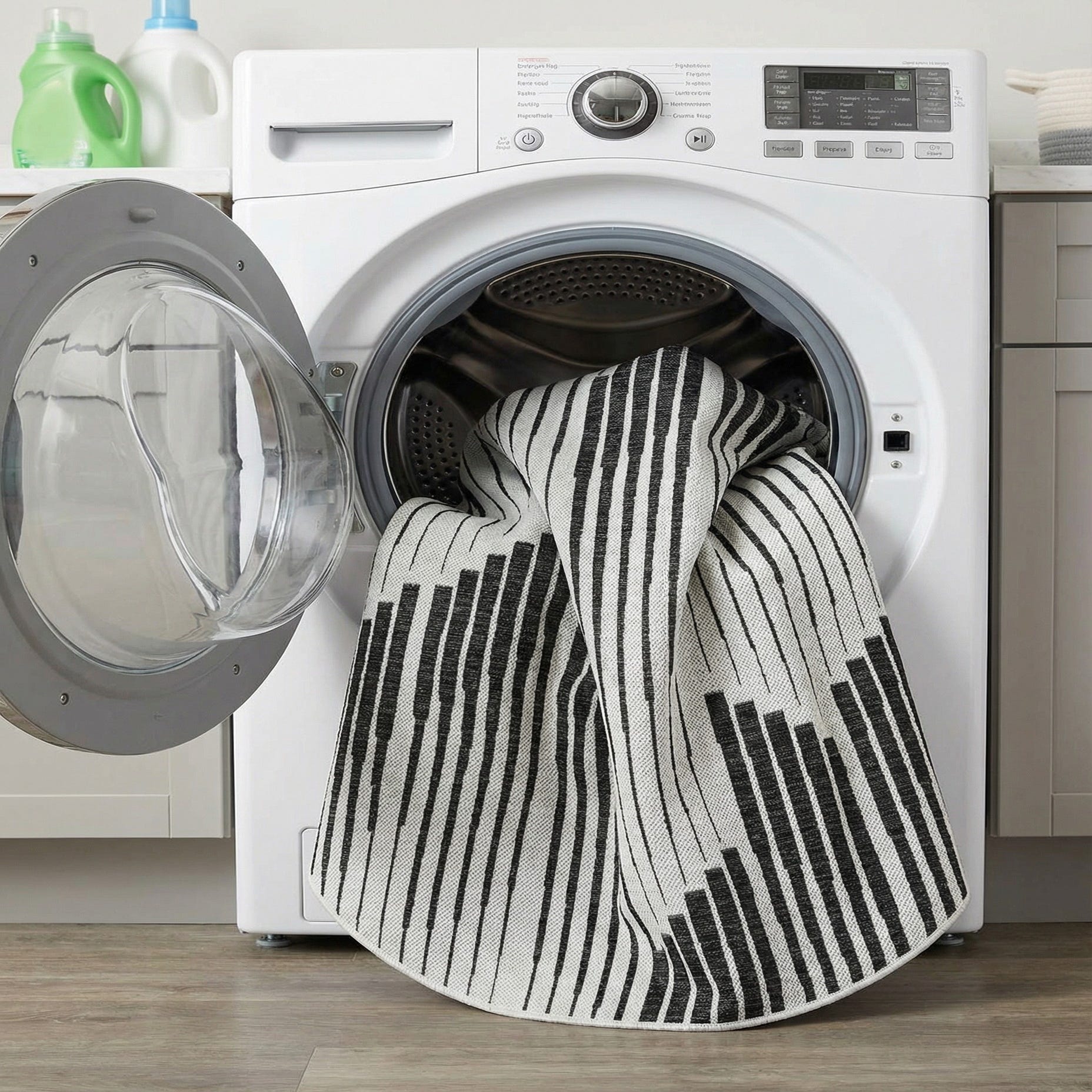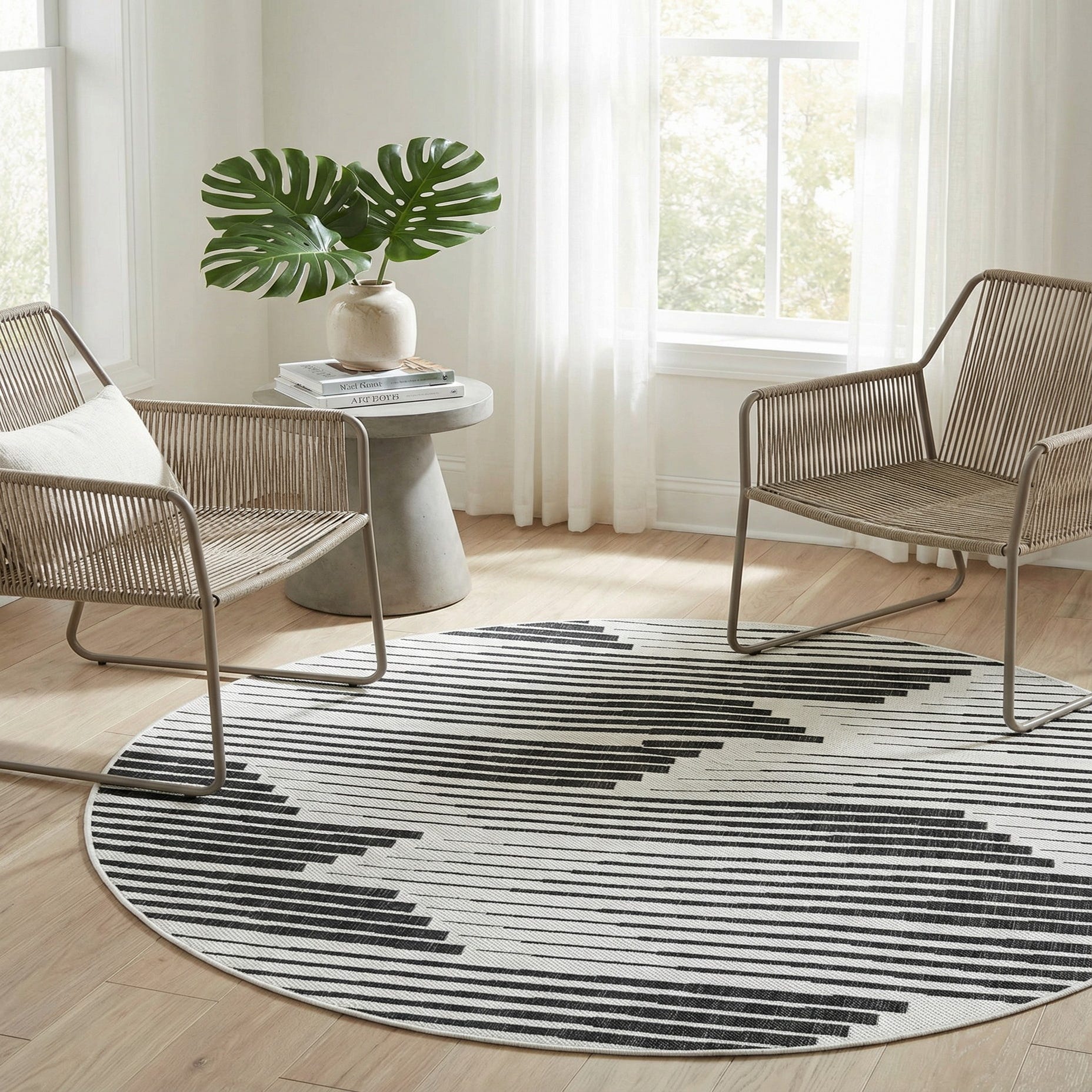 The contrast of black and white makes this rug a standout choice for various decor settings. Its modern aesthetic would pair well with minimalist furnishings, complementing sleek outdoor seating arrangements or serving as an accent piece within monochromatic interior designs. The rug's round shape and striking pattern could also provide a focal point beneath a circular dining table or in a spacious foyer. The resilient material and design make it suitable for high-traffic areas and family-friendly spaces.