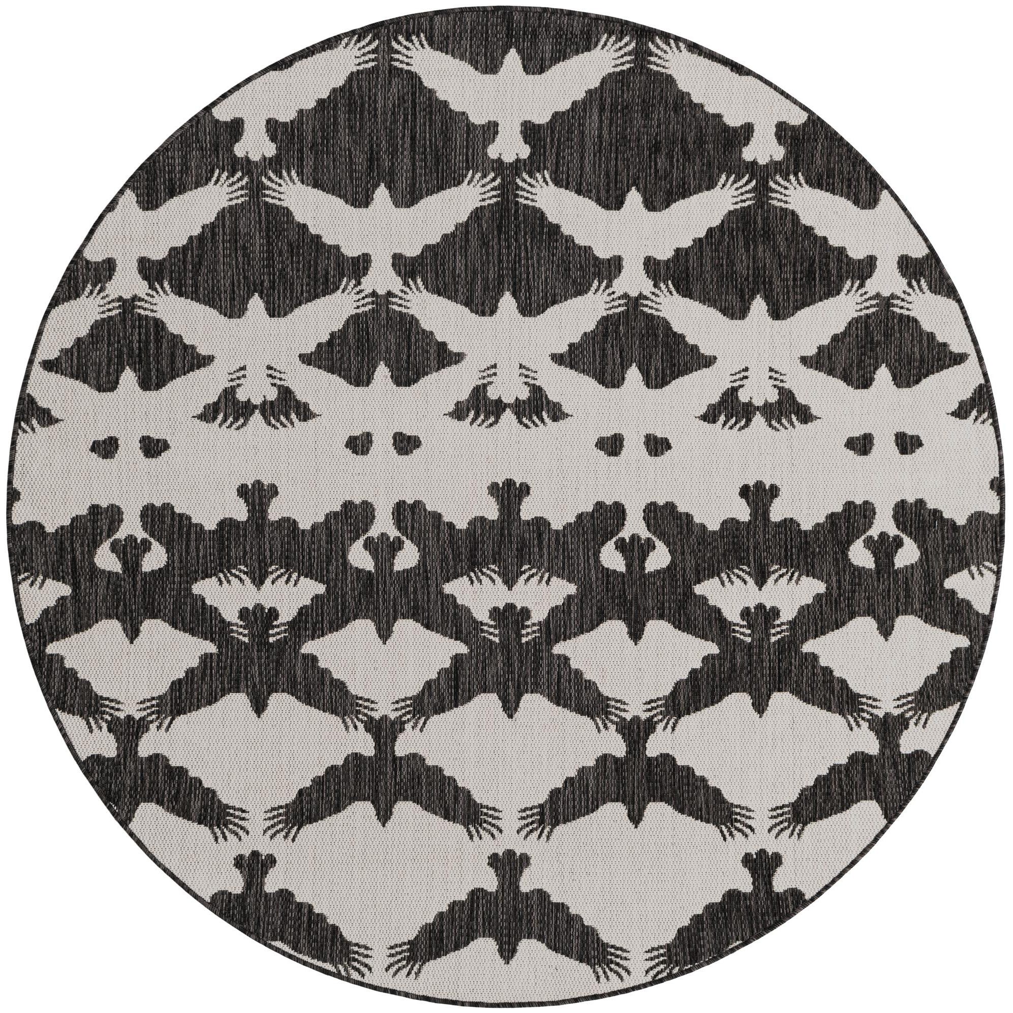 A round, black and ivory modern rug featuring a repeating pattern of stylized flying bats, suitable for indoor or outdoor use.