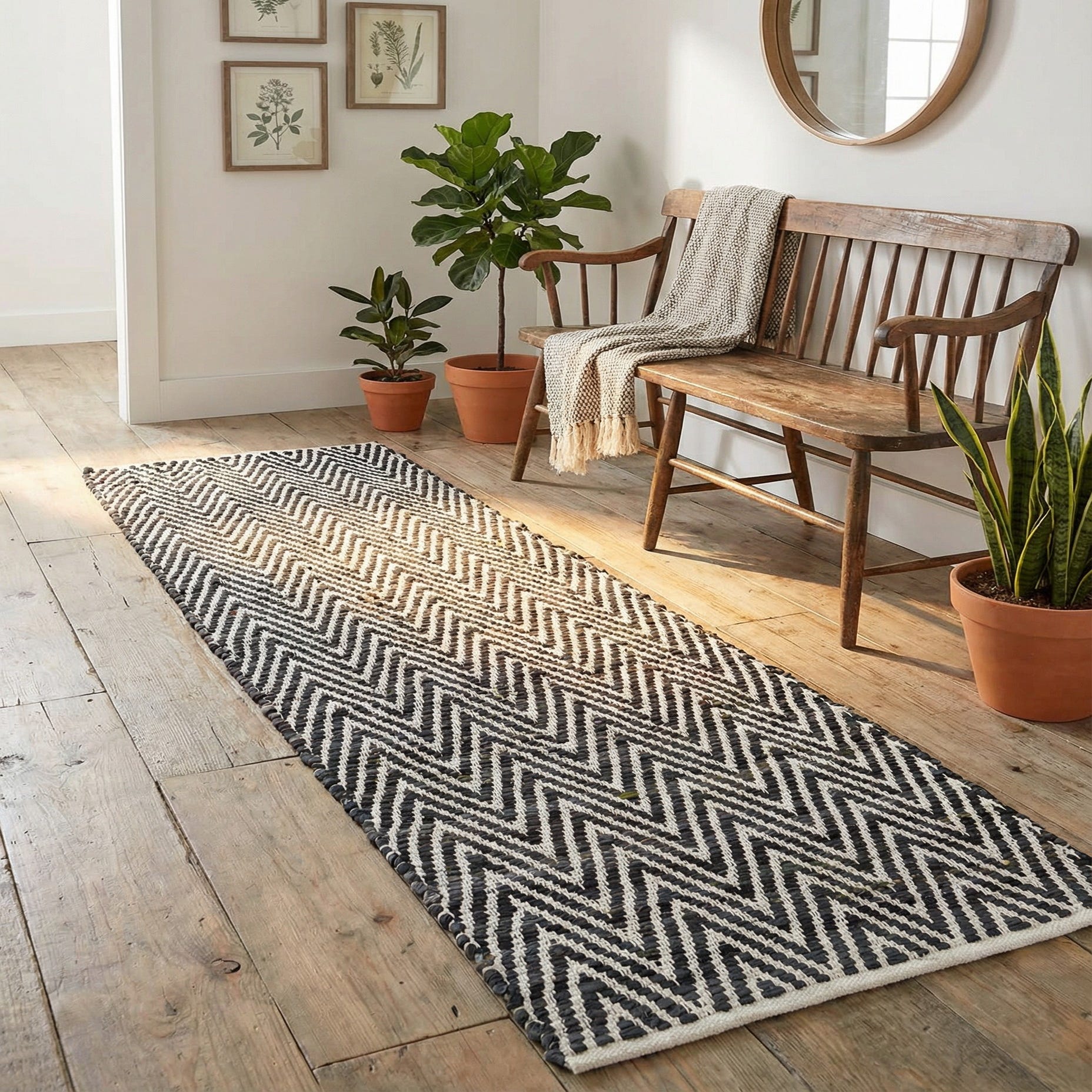 A bold chevron pattern gives this hand-woven cotton runner a strong, graphic presence. Black and white zigzags alternate in tightly woven rows, creating a rhythmic, high-contrast motif that reads modern yet classic. The 100% cotton construction produces a tactile surface with subtle ridging where the woven strips meet, so the rug has a pleasant, slightly nubby hand underfoot and a sturdy flat-weave feel.
