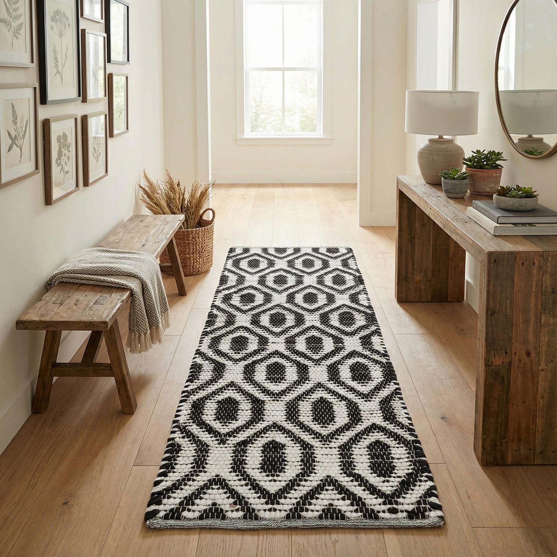 Hand-woven from 60% cotton and 40% jute, this runner has a low-profile, flat weave with a tactile, slightly nubby surface where the cotton and jute meet. A bold black-and-white palette forms a repeating geometric medallion and chevron motif: elongated ovals framed by hexagonal outlines march down the length of the piece, giving a rhythmic, graphic look that reads clean and contemporary. The cotton provides a softer hand underfoot while the jute adds subtle texture and structure, and the finished selvedge keeps the edges neat.