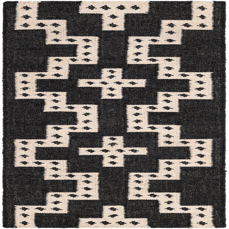 A 6 ft runner rug with a bold black and ivory tribal geometric pattern, ideal for a hallway or kitchen.